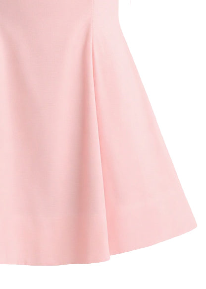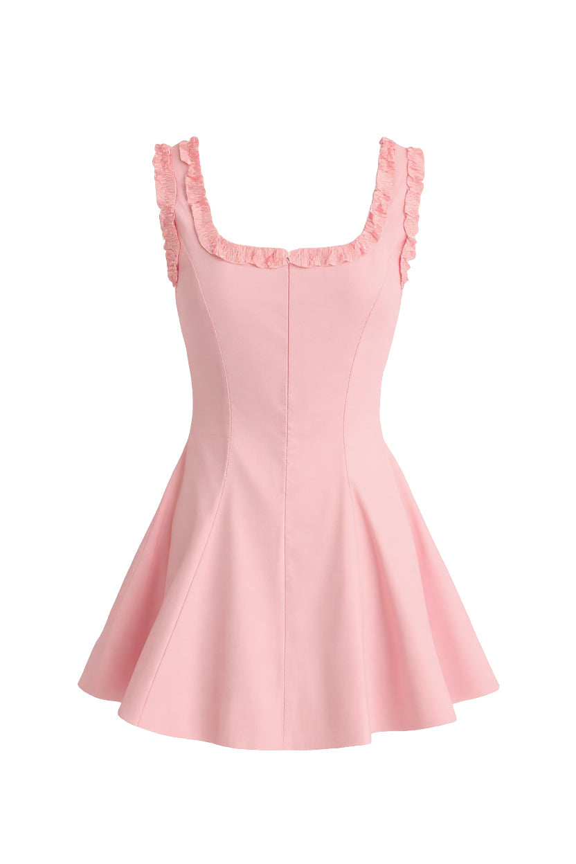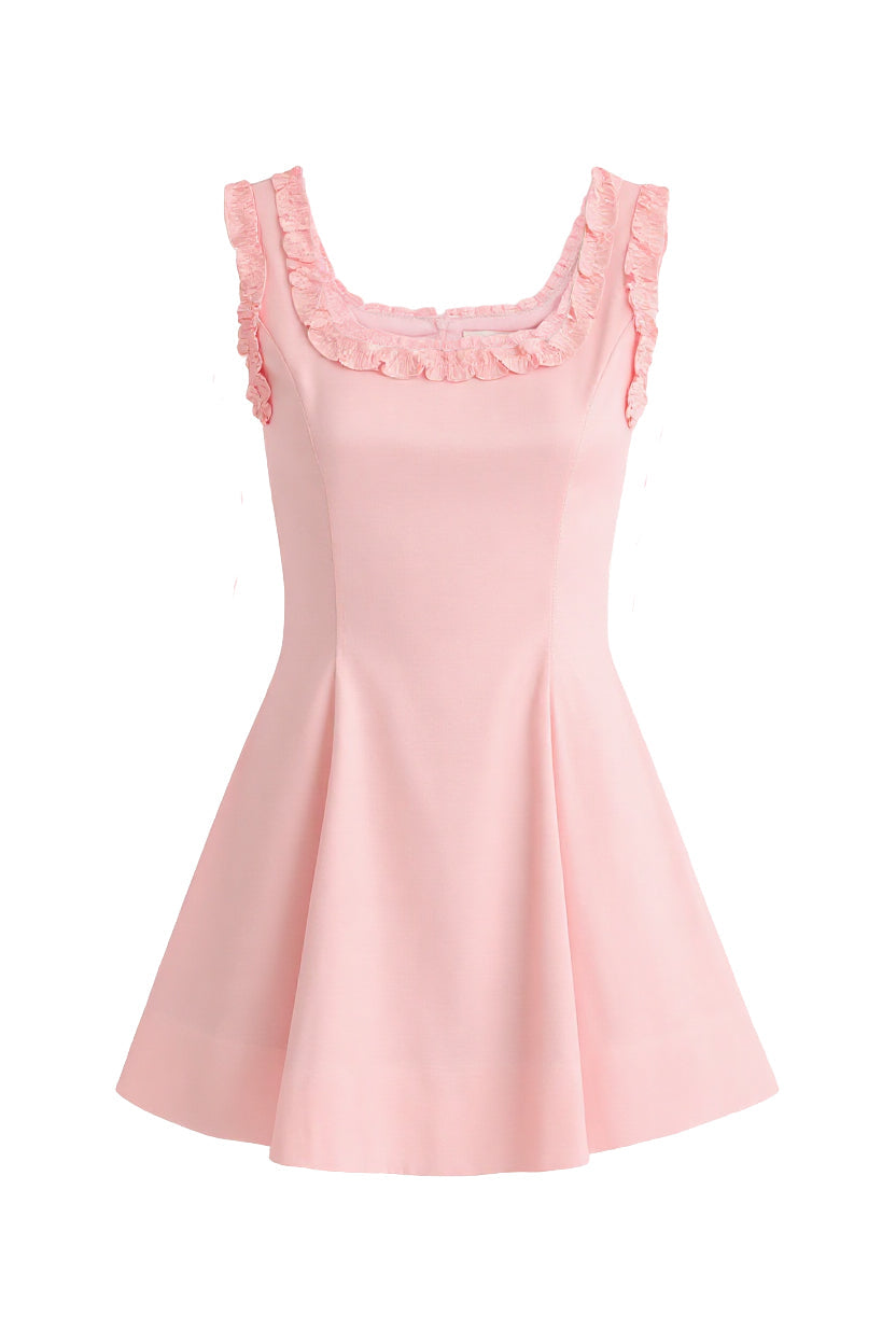 This charming sleeveless dress features a fitted bodice and a softly flared skirt, enhanced by delicate ruffle detailing along the neckline and straps. The smooth texture and pastel hue give it a feminine, graceful appeal, perfect for casual outings or semi-formal occasions.
