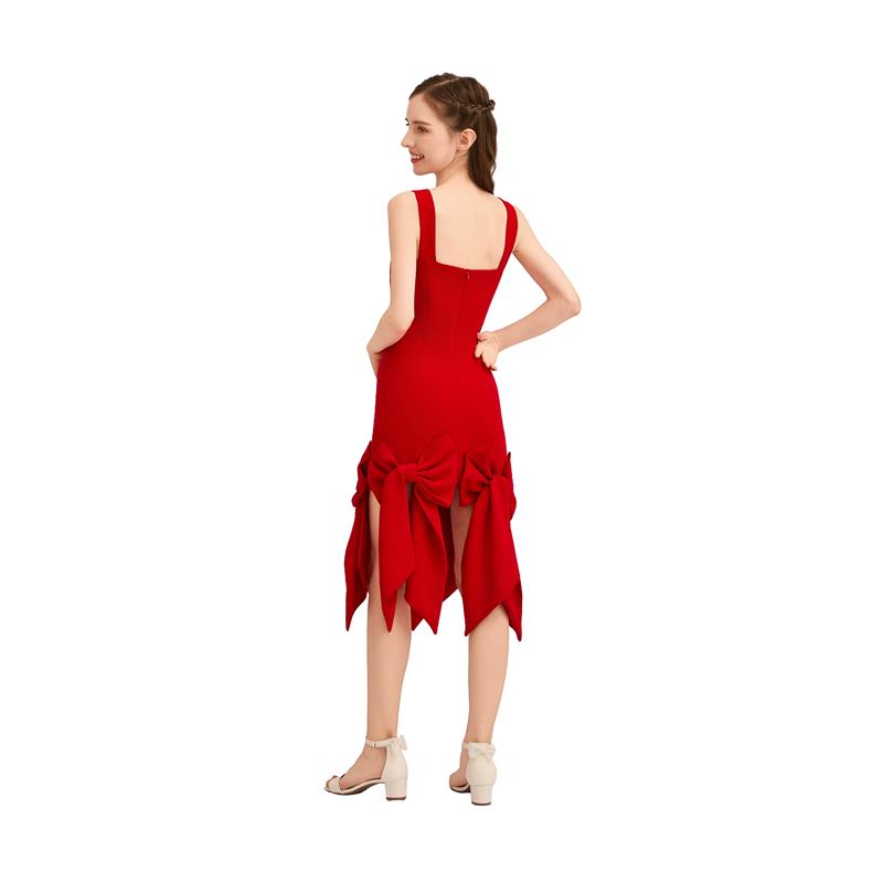 This striking sleeveless piece features a fitted silhouette with wide straps and a bold square neckline. At the hemline, two oversized bows with flowing tails transform the simple cut into a playful yet elegant statement, perfect for festive or formal occasions.