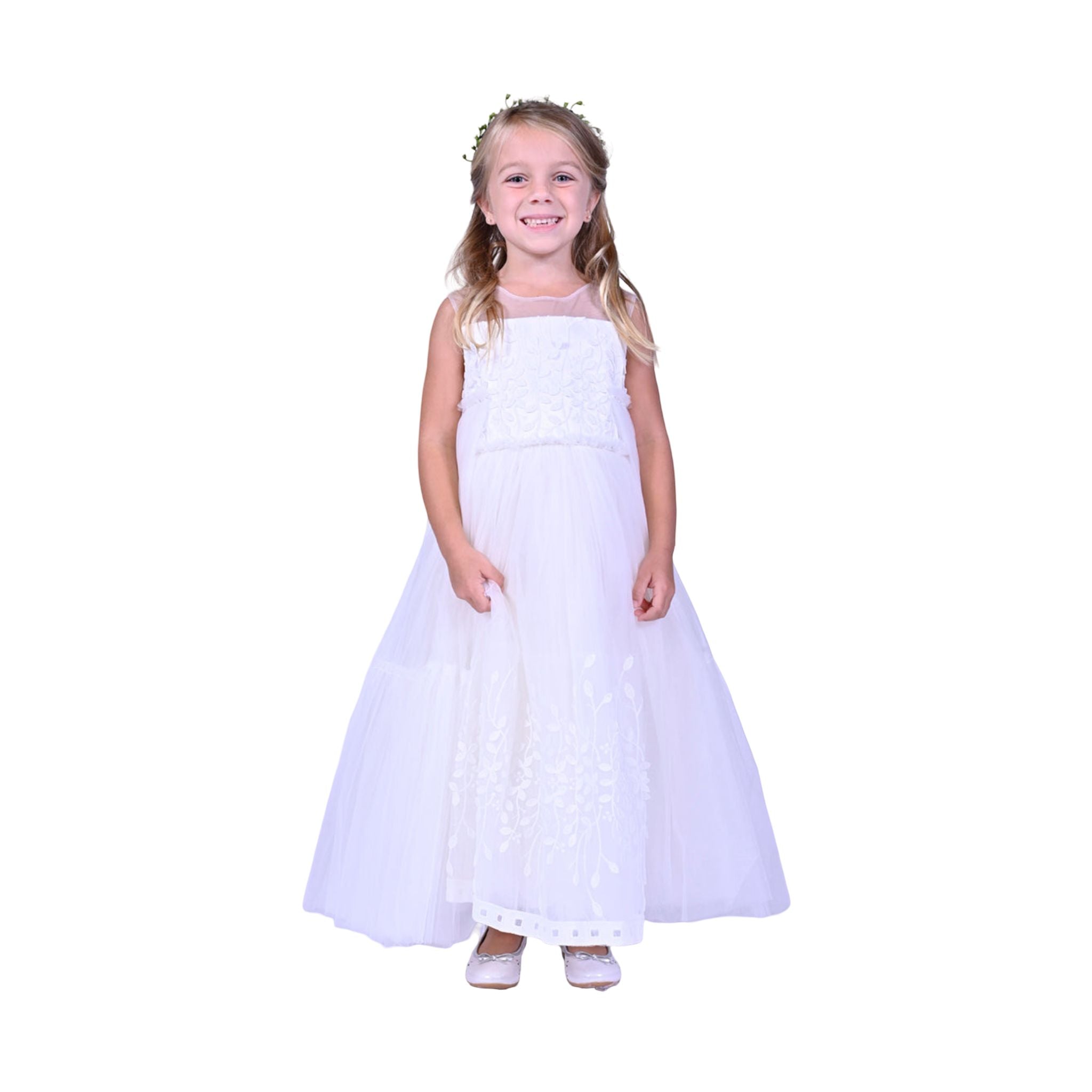 White embroidered tulle dress for kid girls from Tulleen. A regal sleeveless design with high-waisted floral embroidered bodice design leading to a lightweight and voluminous tulle skirt. Perfect for any special occasion!