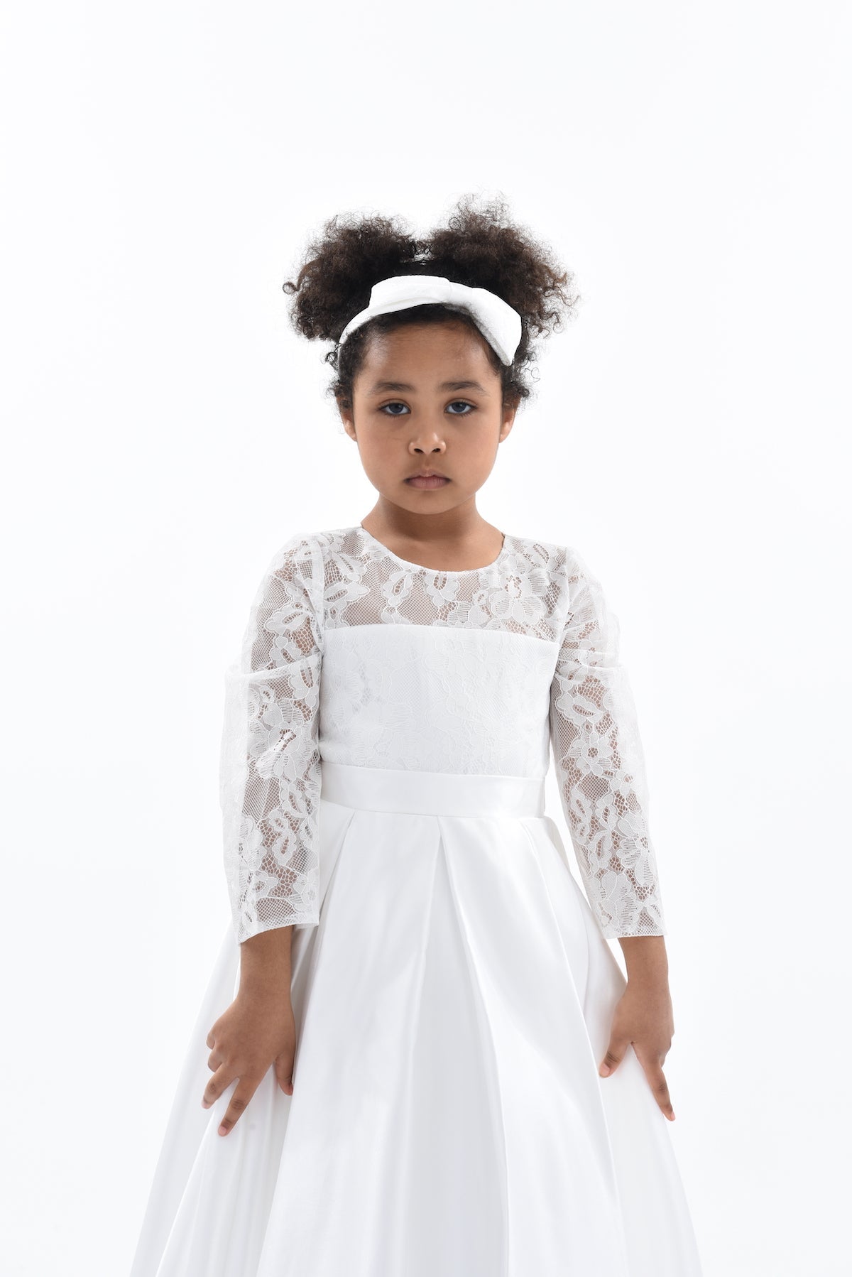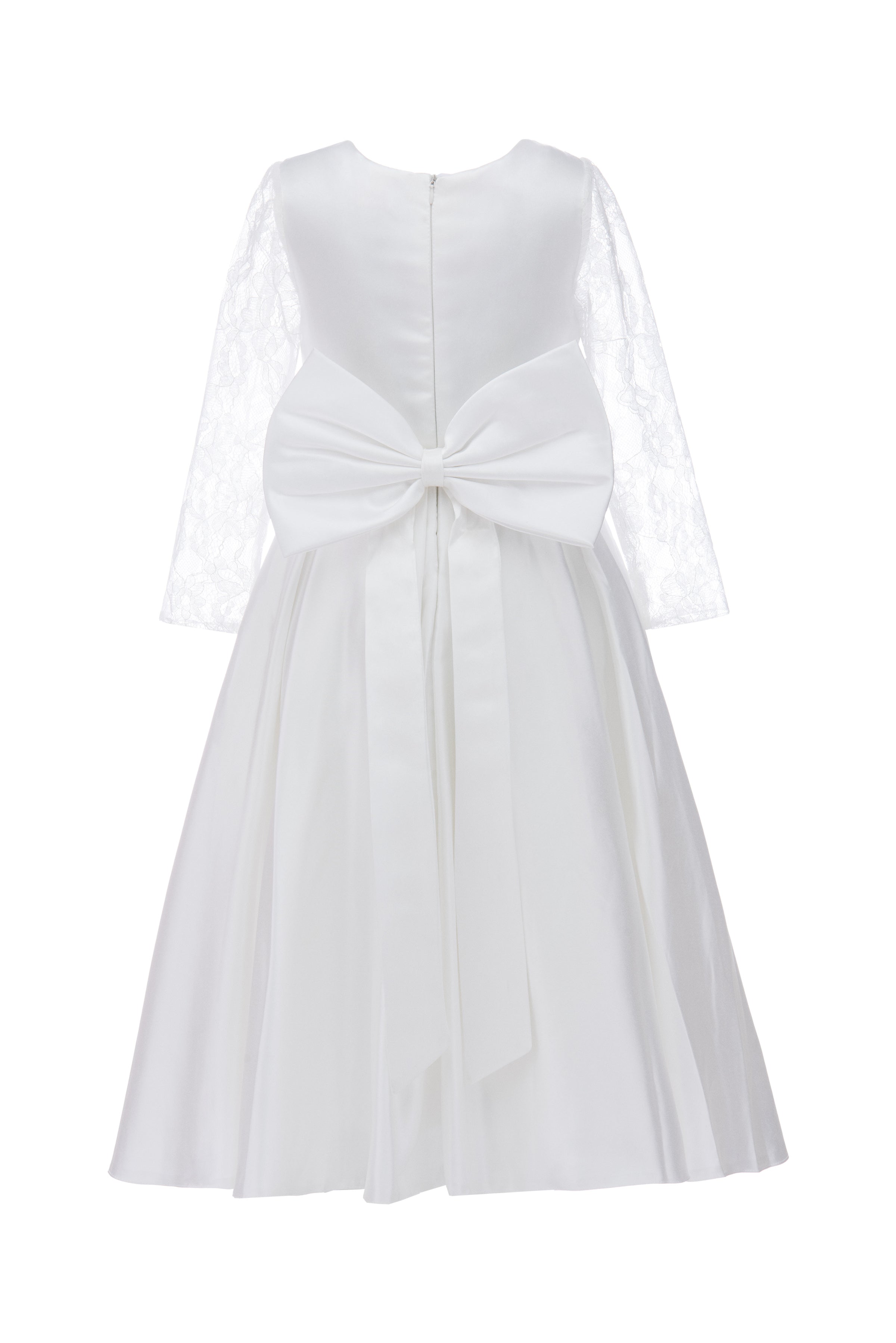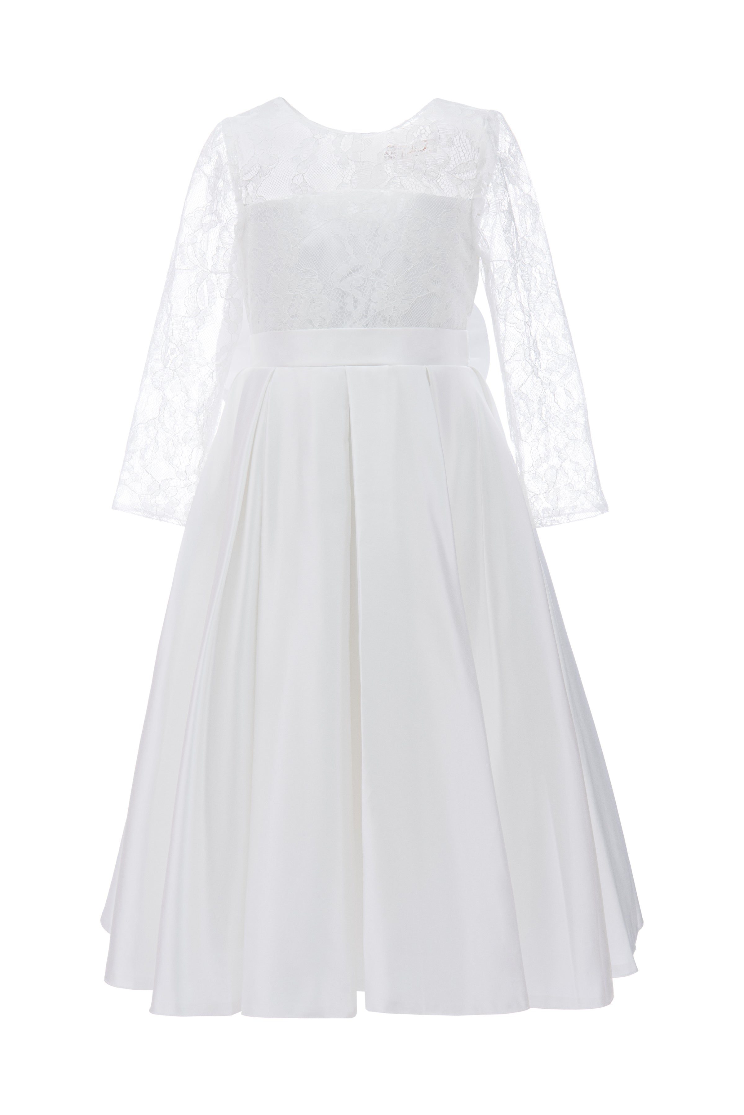 The White Arcadia Satin Lace Dress for kid girls from Tulleen is a stunning and elegant choice for any special occasion. This dress features a round mesh lace neck that adds a touch of sophistication and charm. Additionally, the long mesh lace sleeves provide a delicate and airy look, enhancing the overall elegance of the dress. The pleated satin skirt flows gracefully, creating a beautiful silhouette perfect for twirling and dancing.