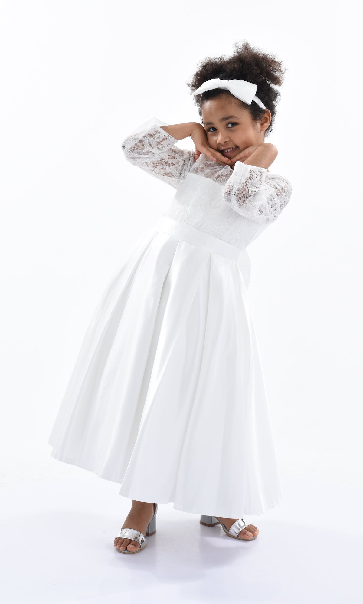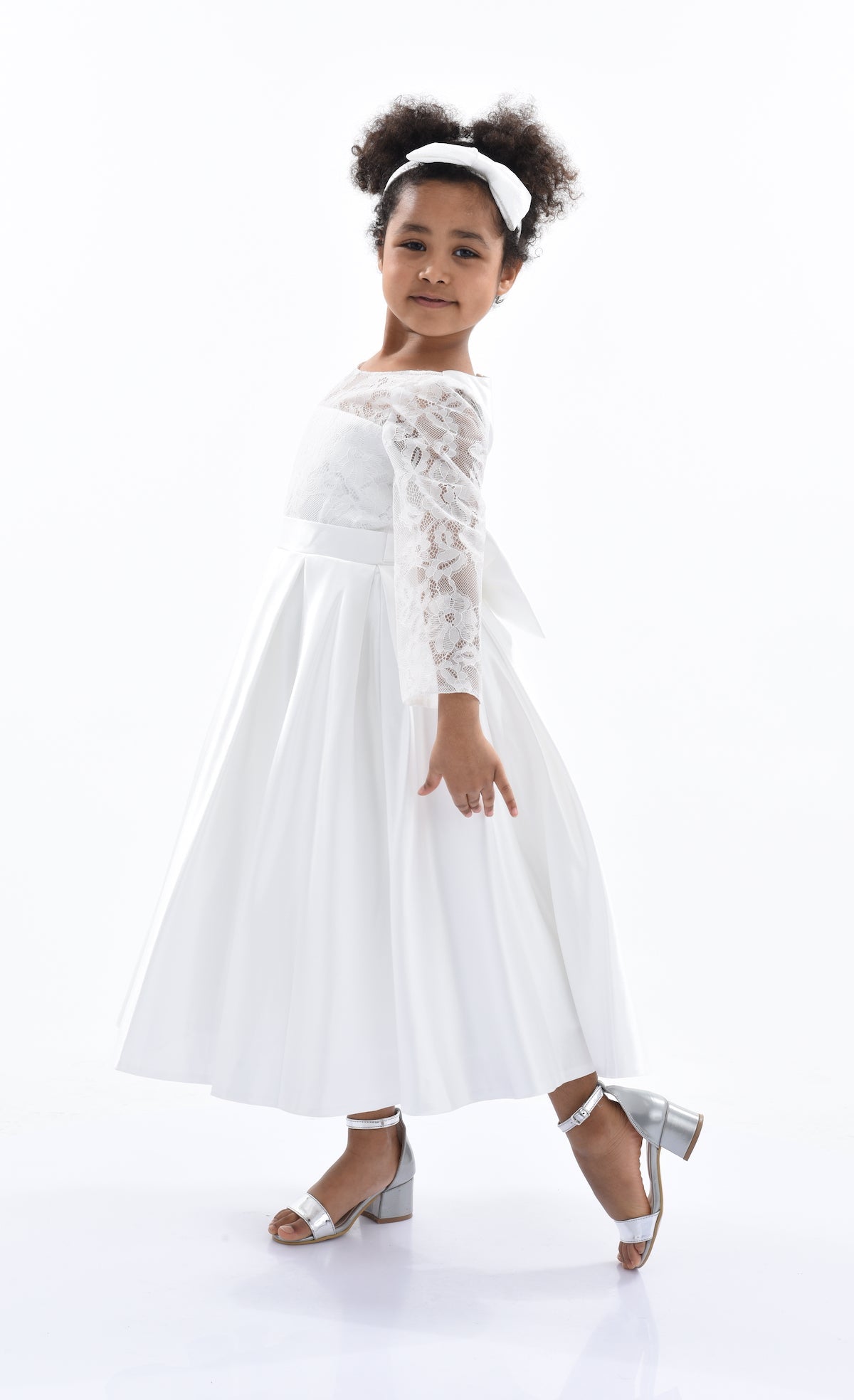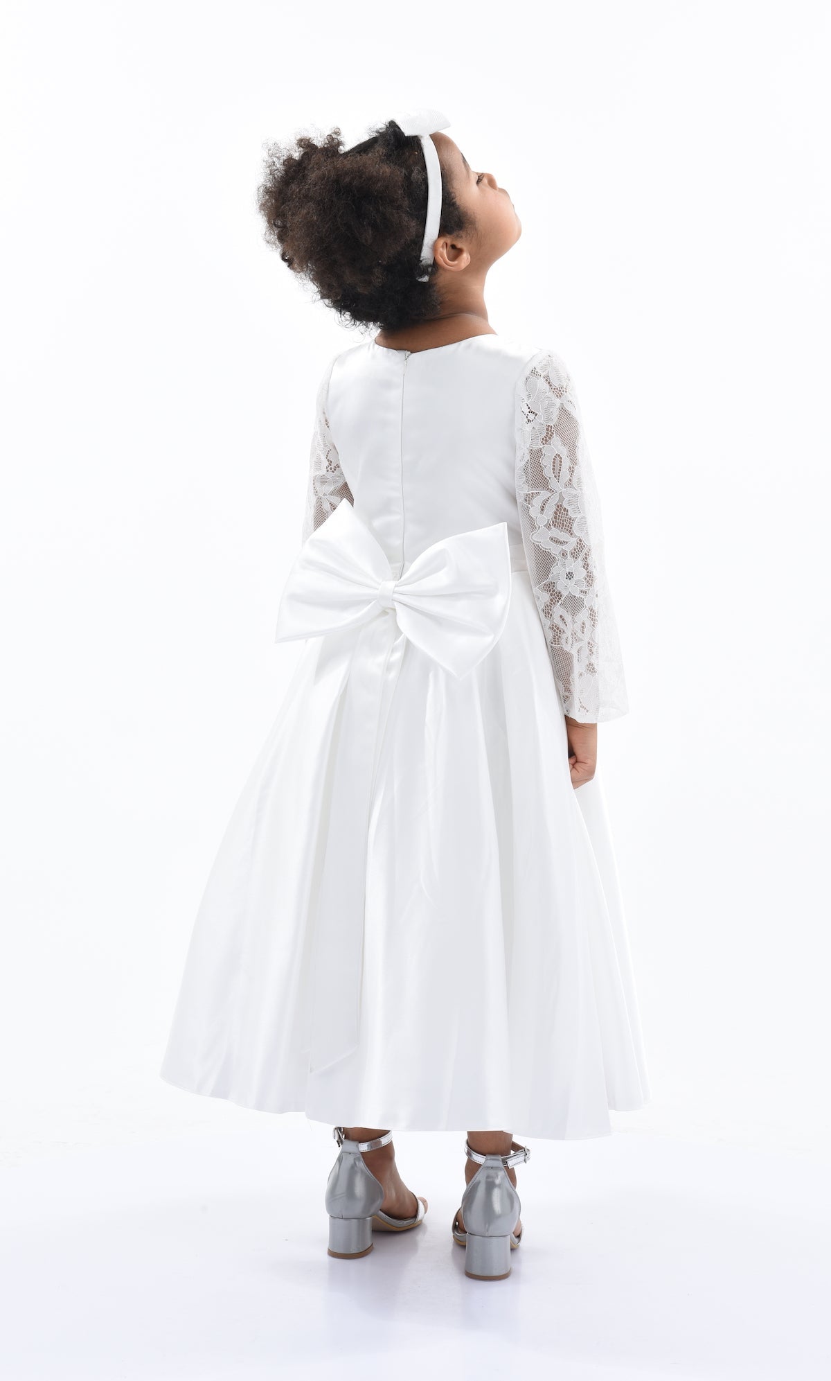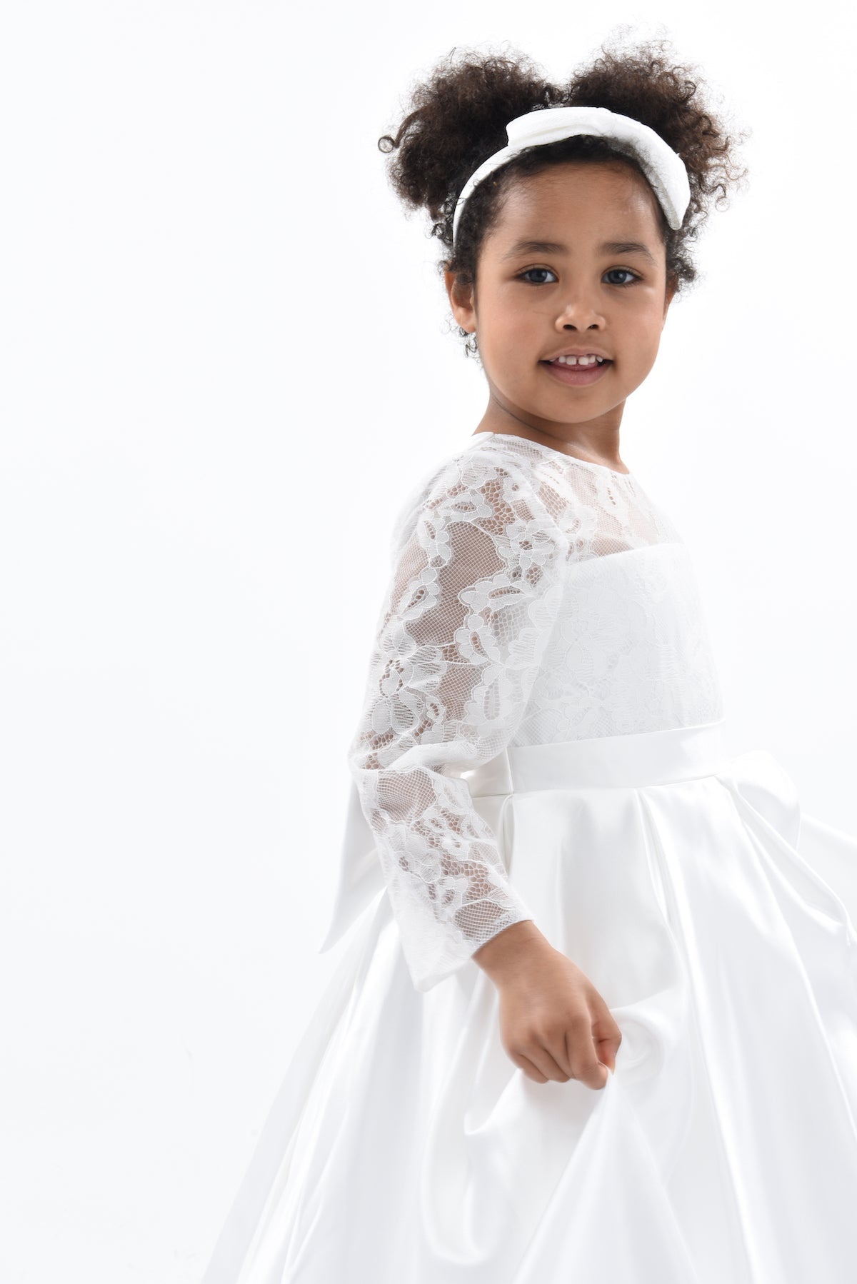 The White Arcadia Satin Lace Dress for kid girls from Tulleen is a stunning and elegant choice for any special occasion. This dress features a round mesh lace neck that adds a touch of sophistication and charm. Additionally, the long mesh lace sleeves provide a delicate and airy look, enhancing the overall elegance of the dress. The pleated satin skirt flows gracefully, creating a beautiful silhouette perfect for twirling and dancing.