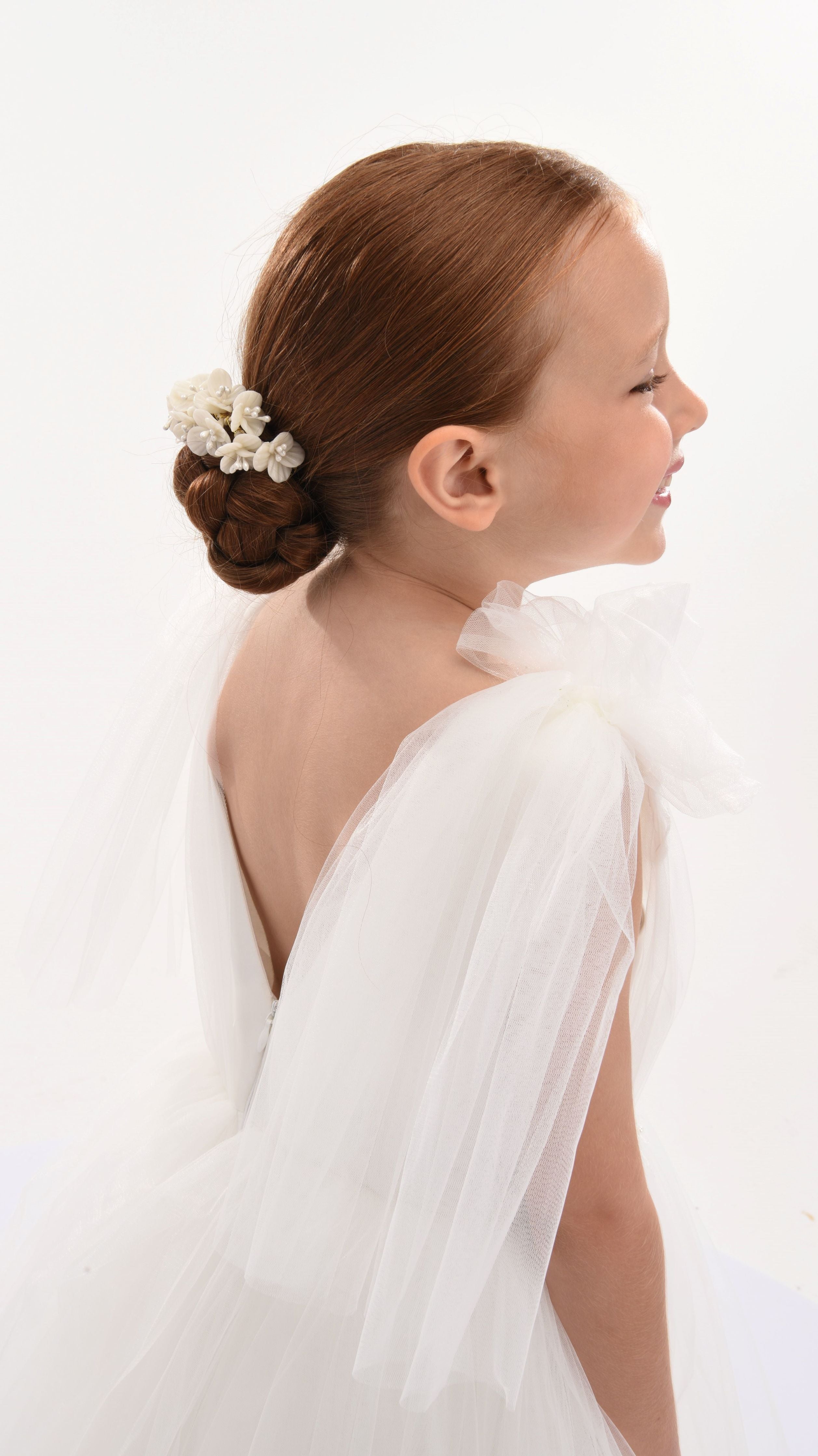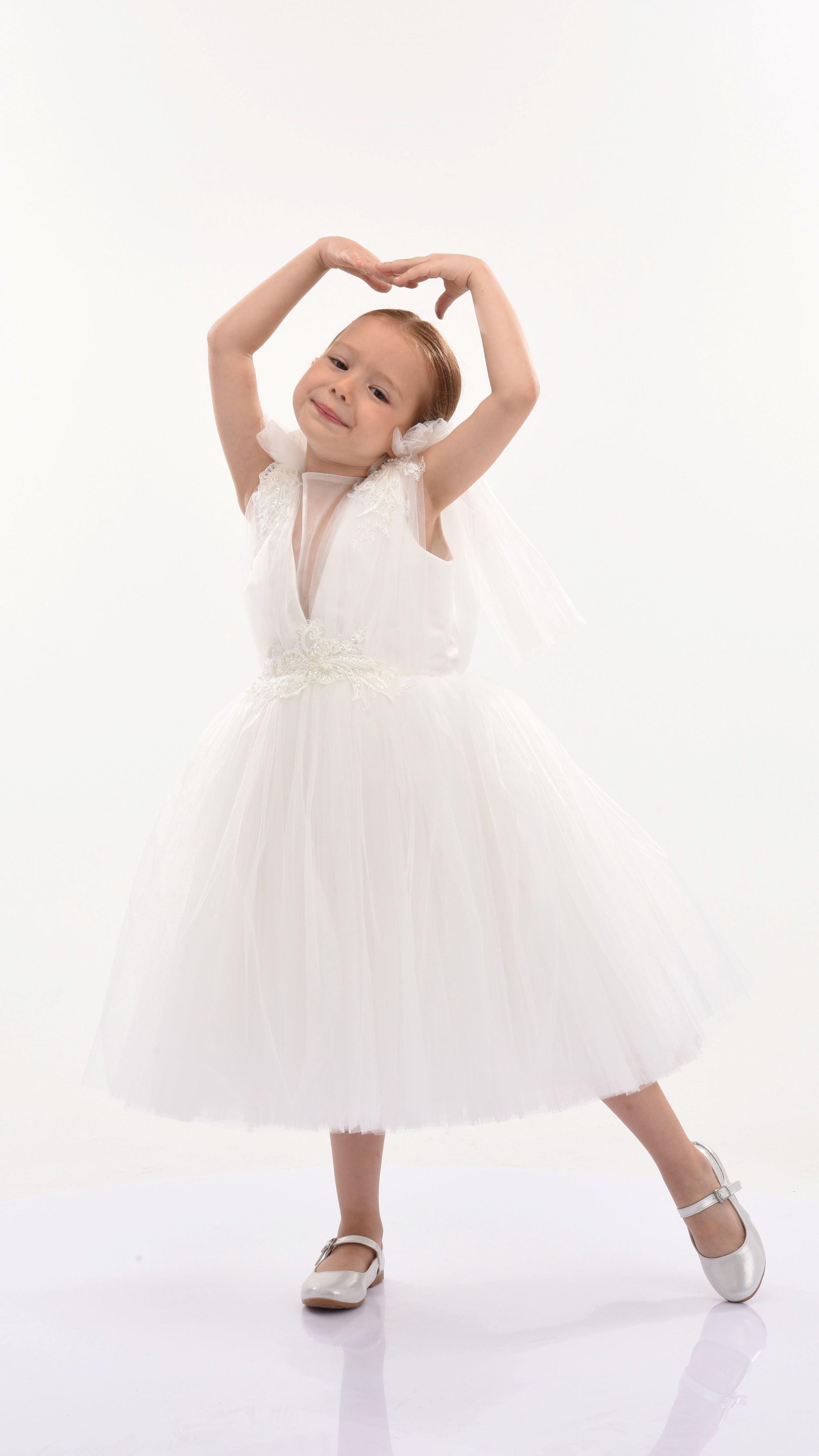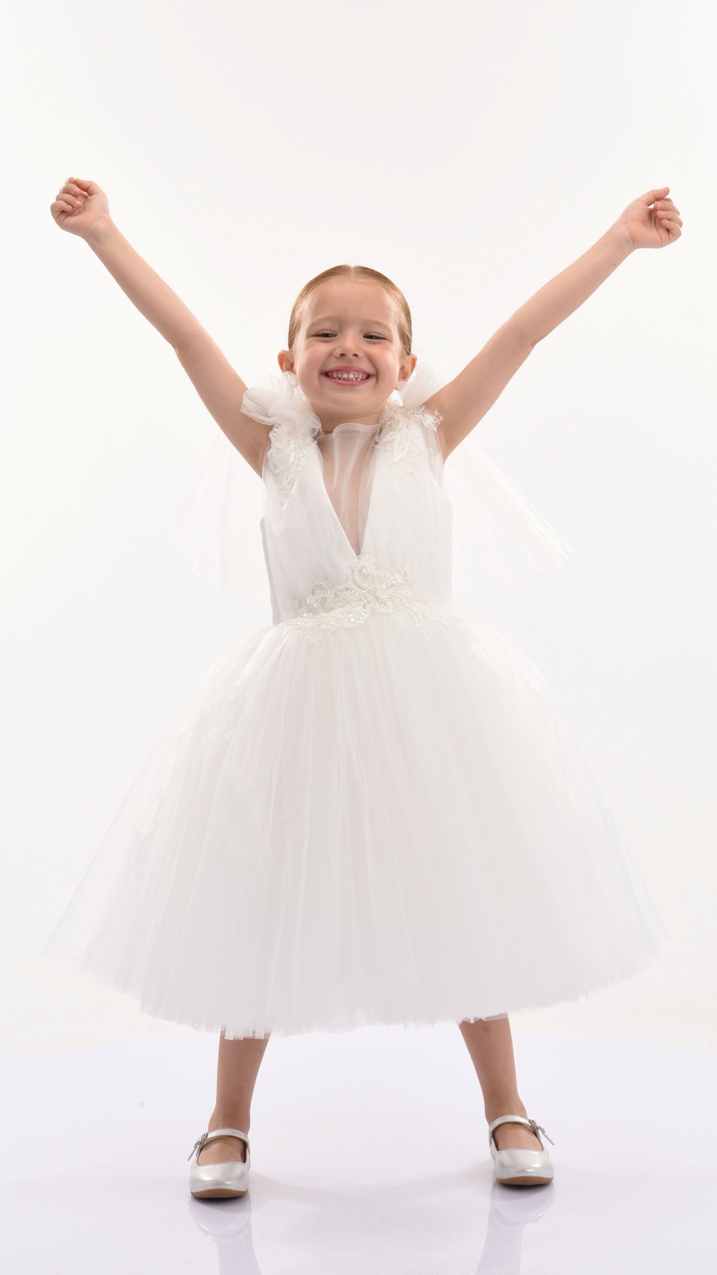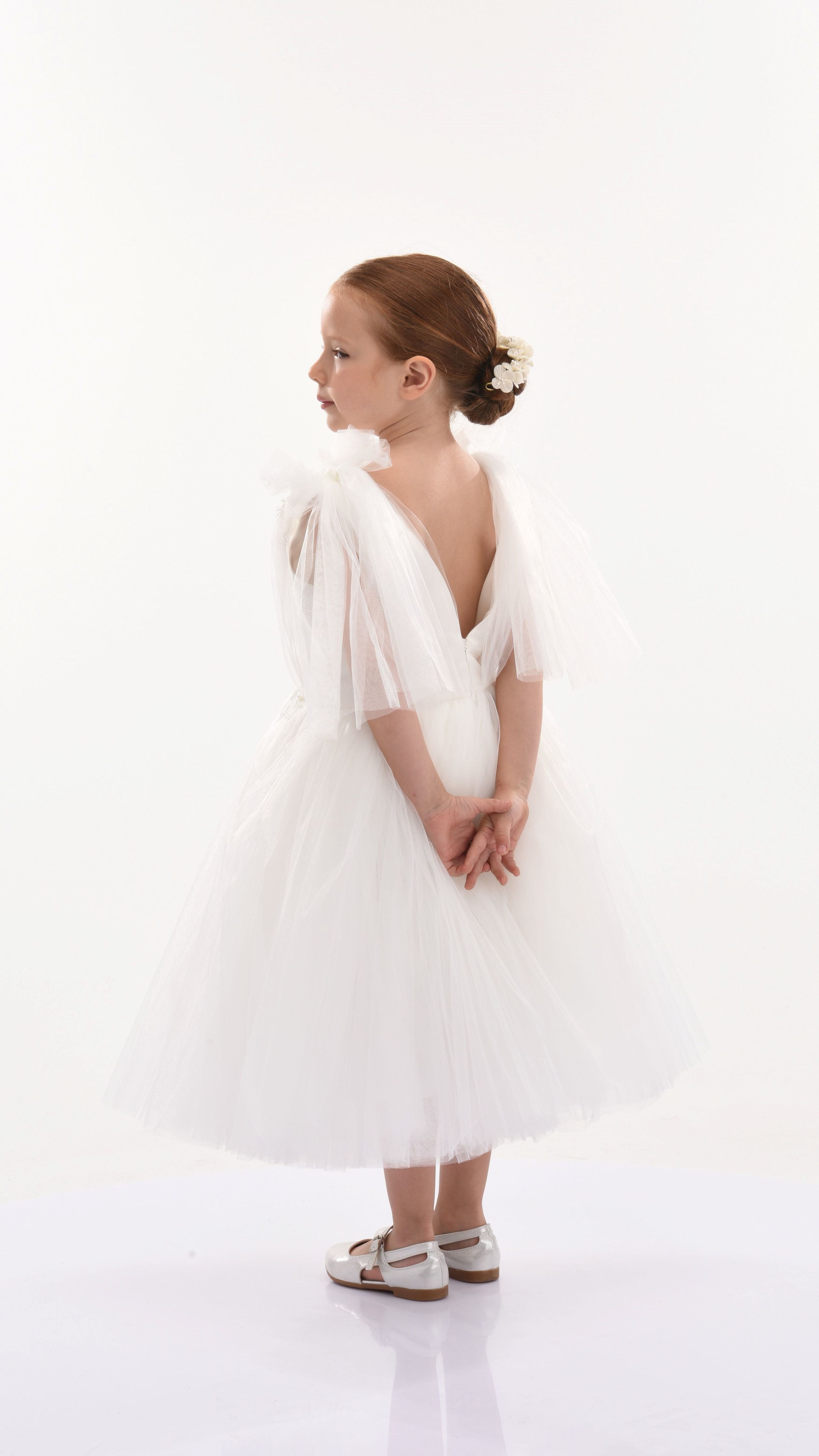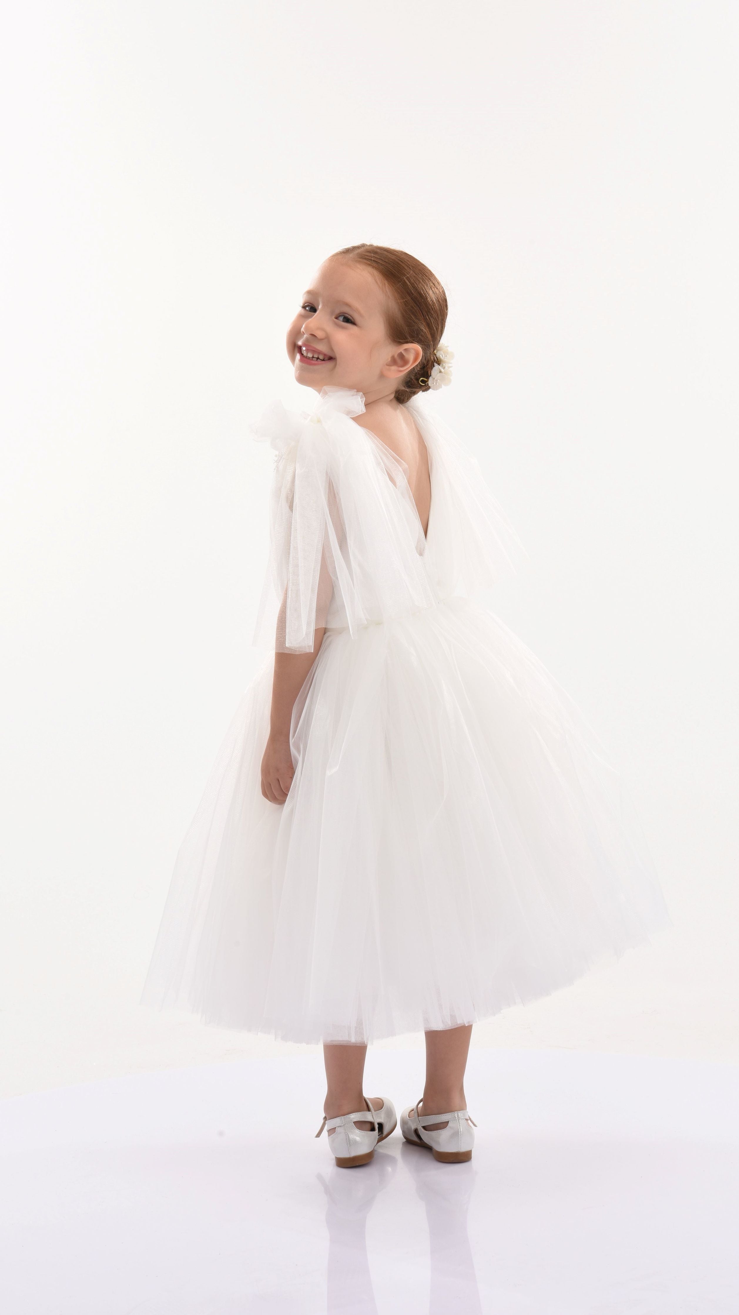 The White Aspen Tulle Bow Dress for kid girls from Tulleen is crafted with meticulous attention to detail. This dress features beautiful white tulle fabric that exudes charm and grace. Adding a touch of whimsy, delicate white tulle bows adorn the shoulders, providing an extra dash of sweetness.