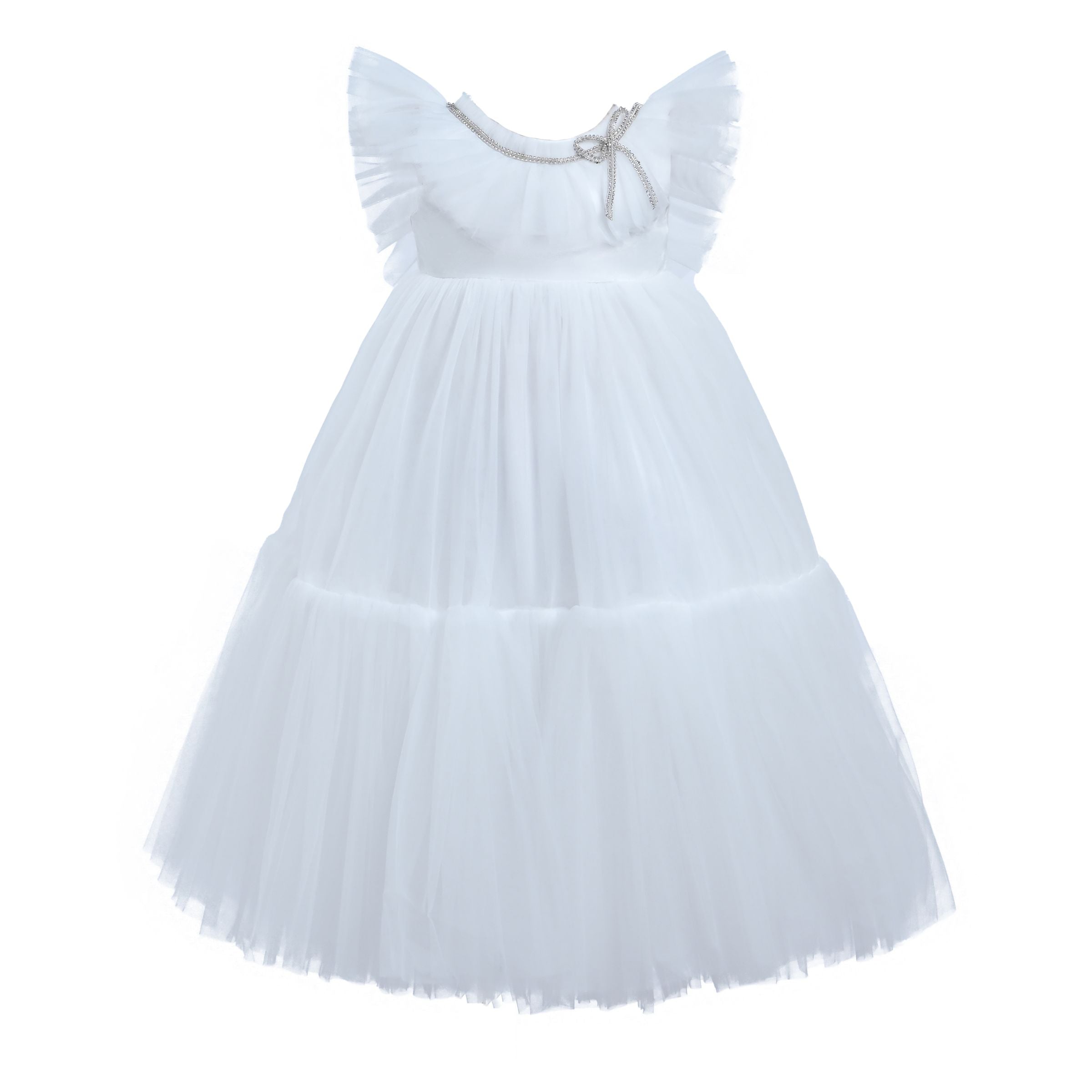 The White Ruffle Beckwith Trapeze Dress for kid girls is an elegant and charming choice for any special occasion. This dress features a round neckline an applique bow arranged around the collar, adding a touch of sophistication and whimsy. Furthermore, the ruched tulle sleeves elegantly cover the shoulders and spread out, creating an added flair that enhances the dress's overall appeal.