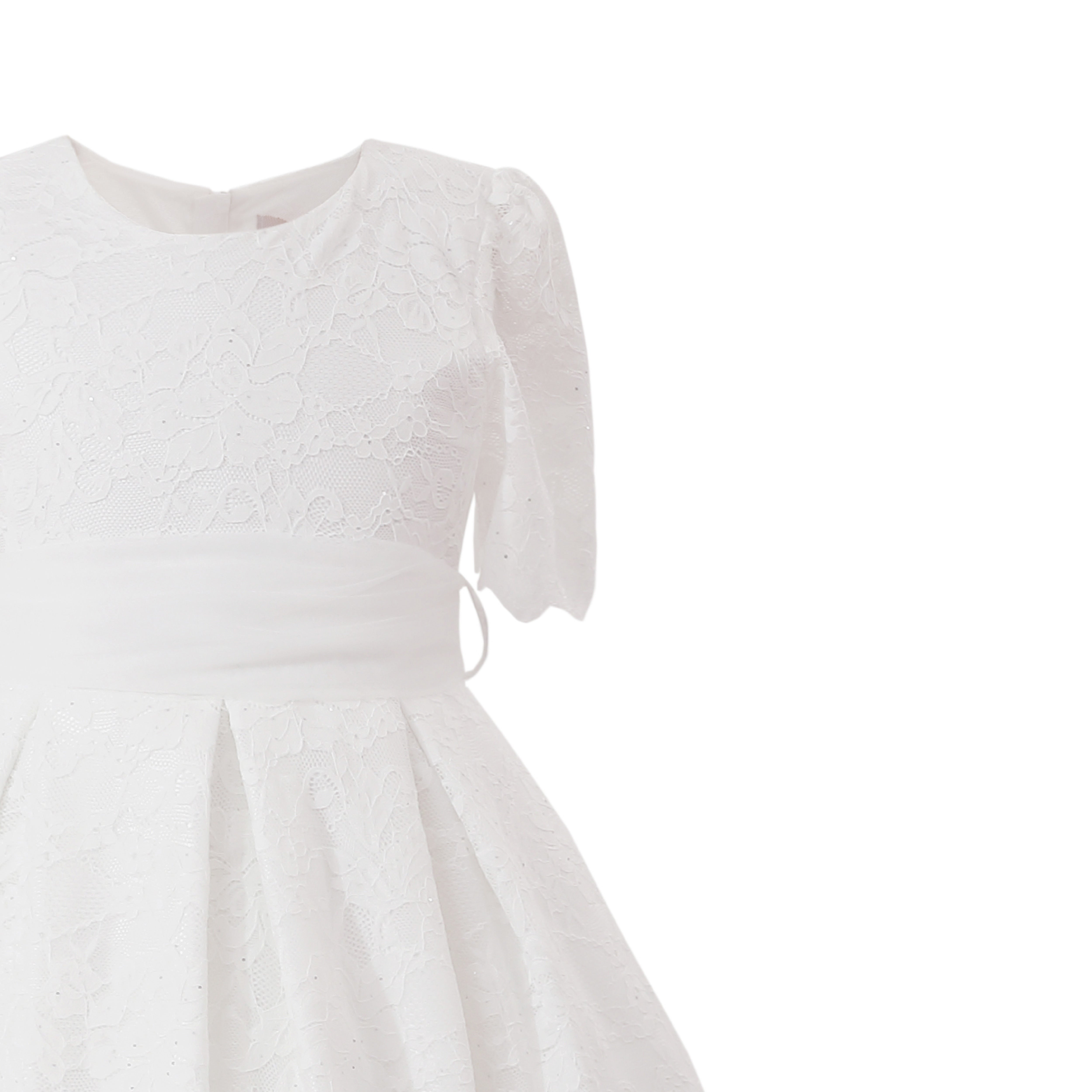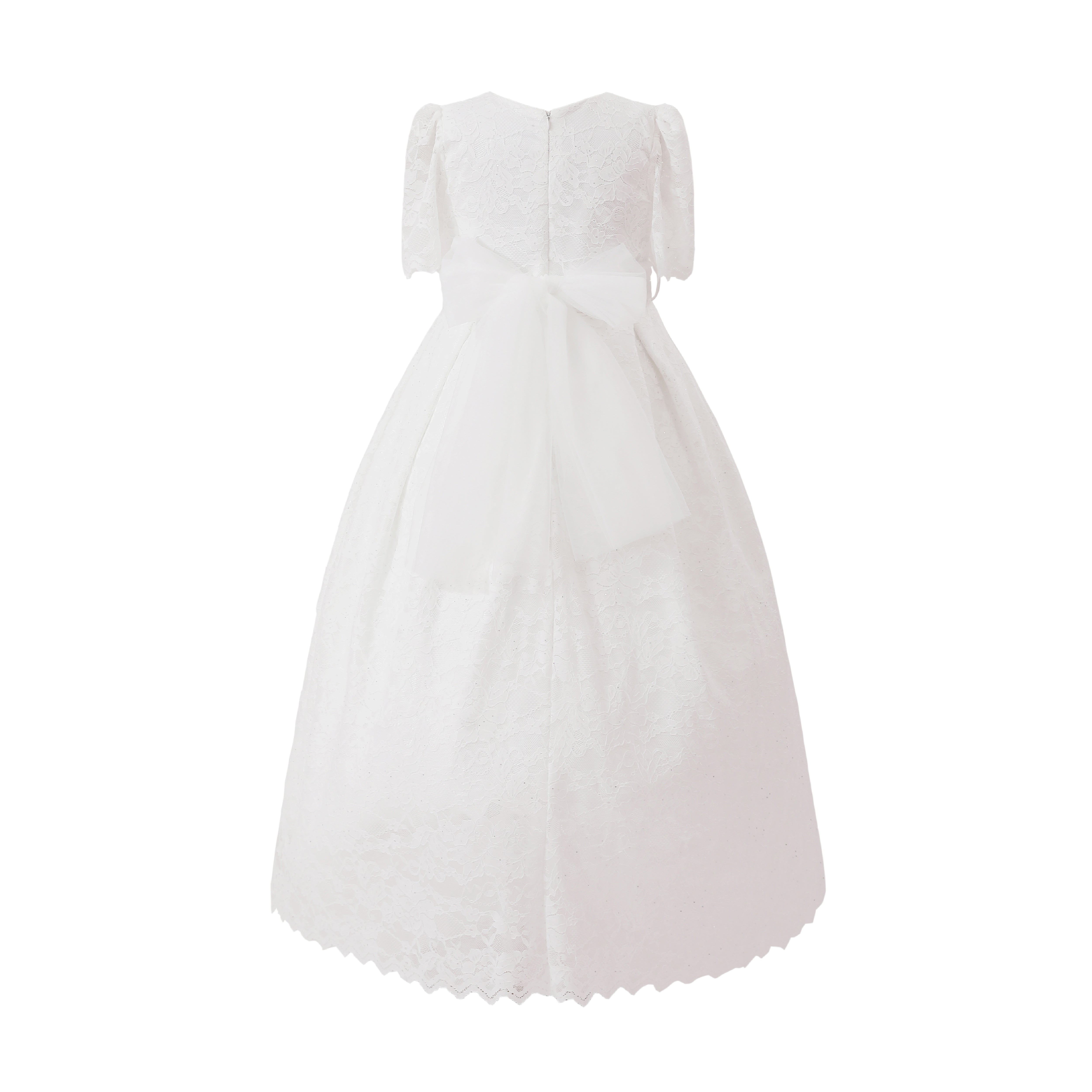 A refined full‑length gown featuring a round neckline, fitted bodice, and pleated skirt with scalloped lace hem for a delicate, ceremonial look.