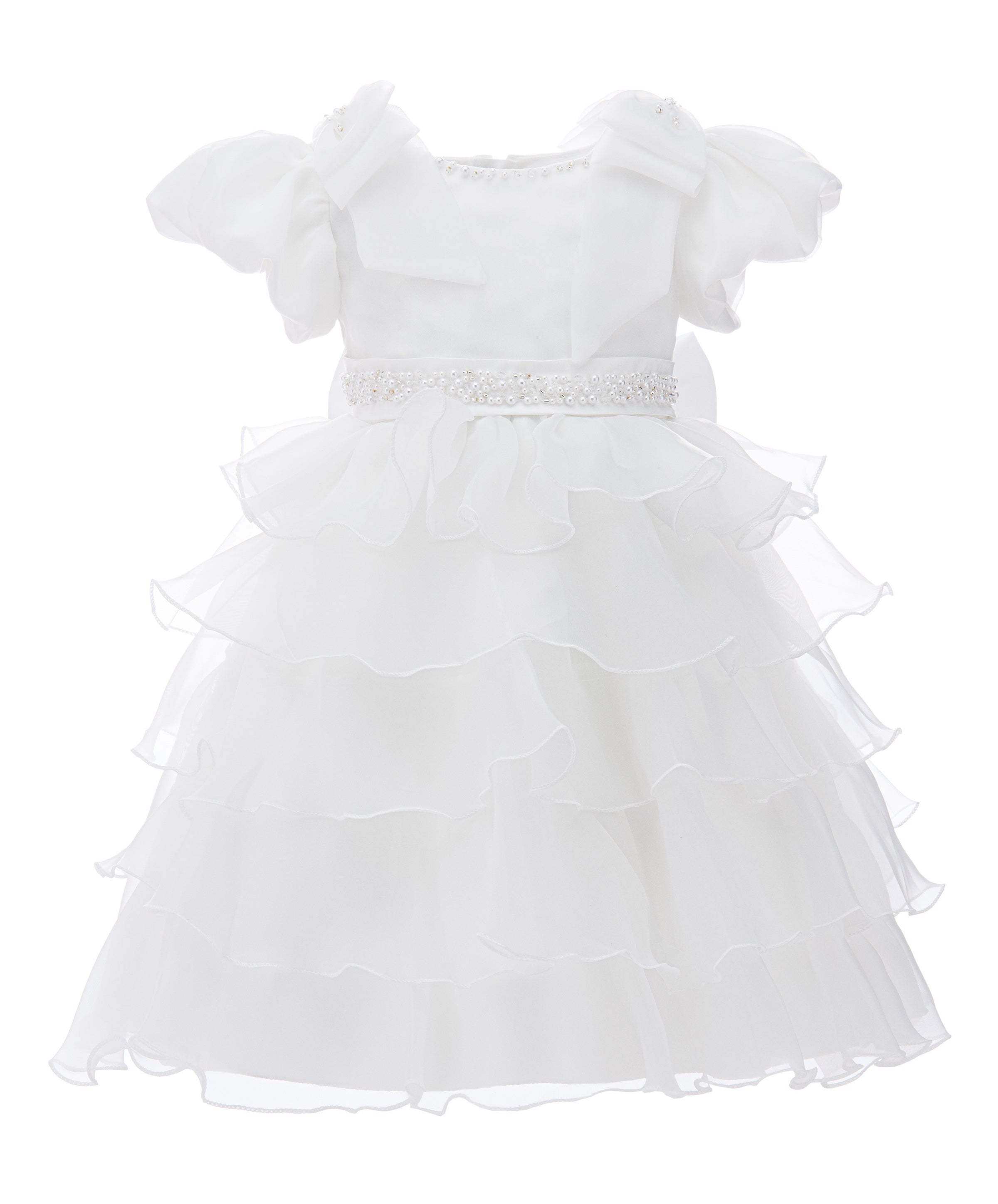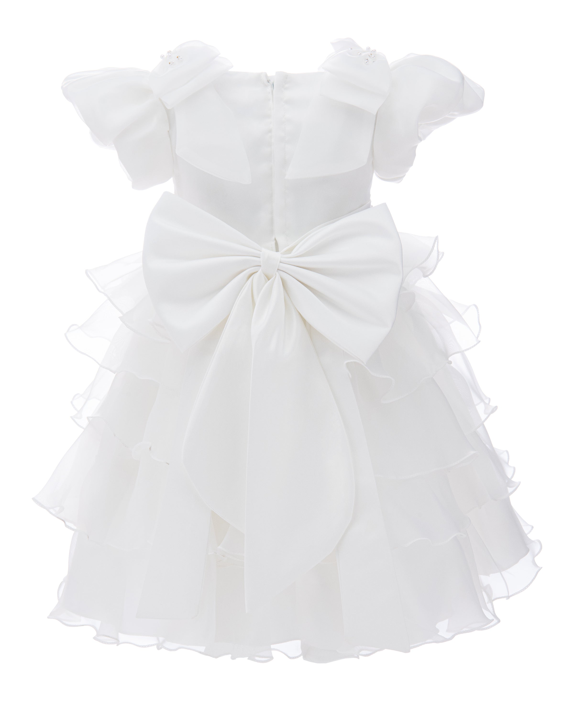 The zip closure at the back allows for easy dressing and a secure fit. Designed to be dry cleaned only, this dress maintains its quality and luxurious appearance over time. Overall, the White Bonaventura Ruffle Dress combines elegance, comfort, and sophisticated design elements, making it a perfect addition to any young girl's wardrobe. This dress ensures your child looks and feels special at any event.