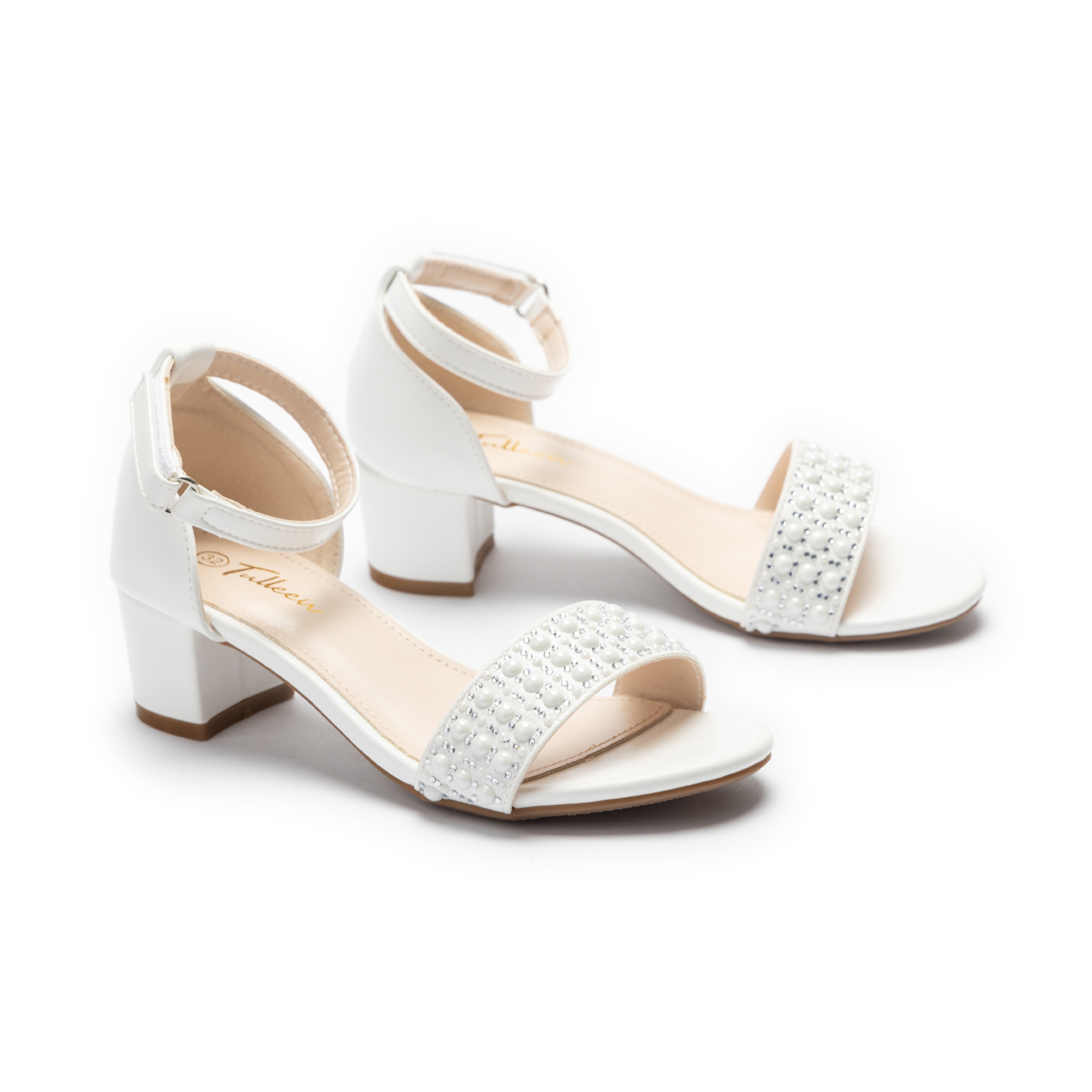 The Callista sandals bring sophistication with their pearl- and rhinestone-adorned front strap, mid-height block heel, and secure ankle buckle. Their crisp white finish makes them a versatile choice for elegant celebrations.