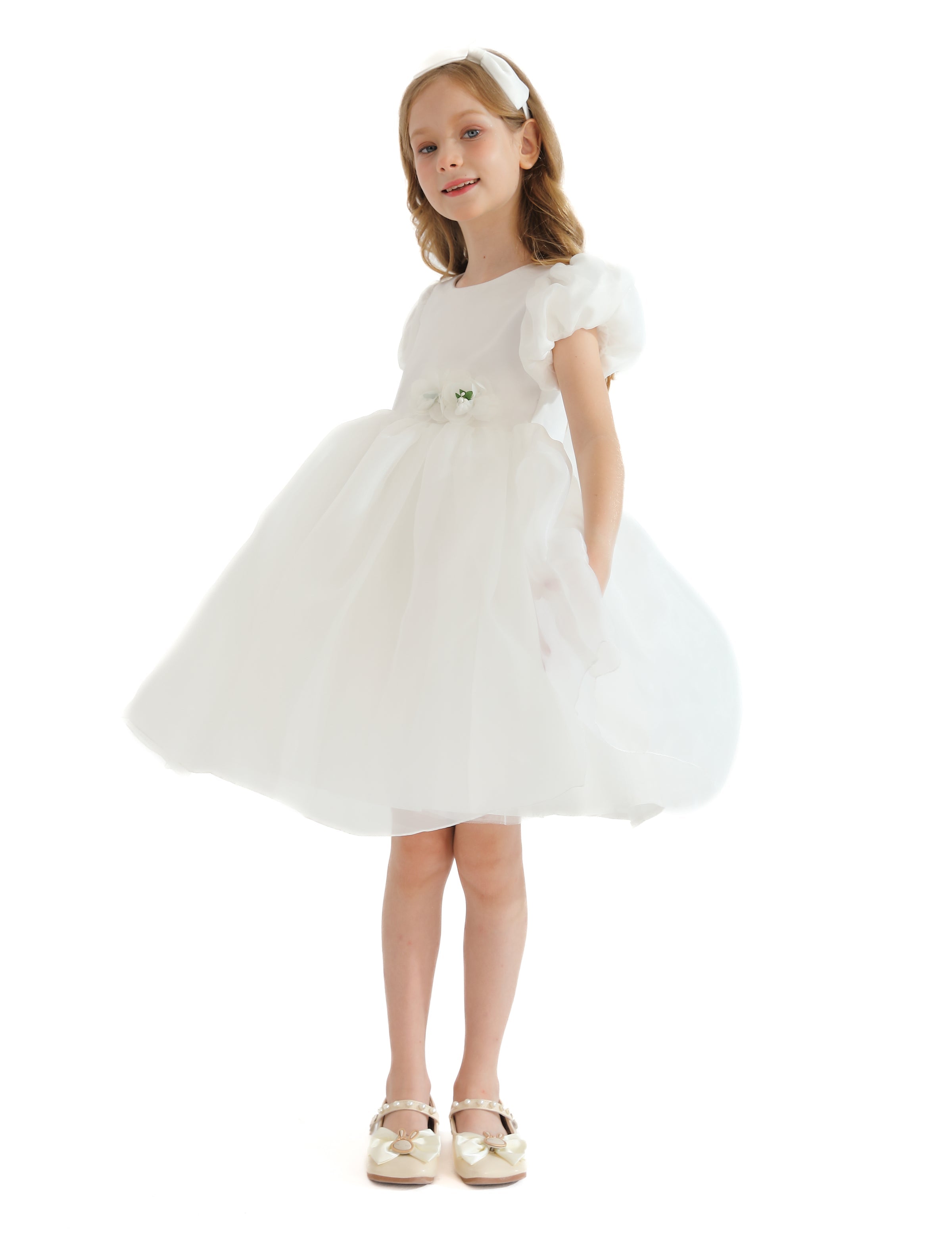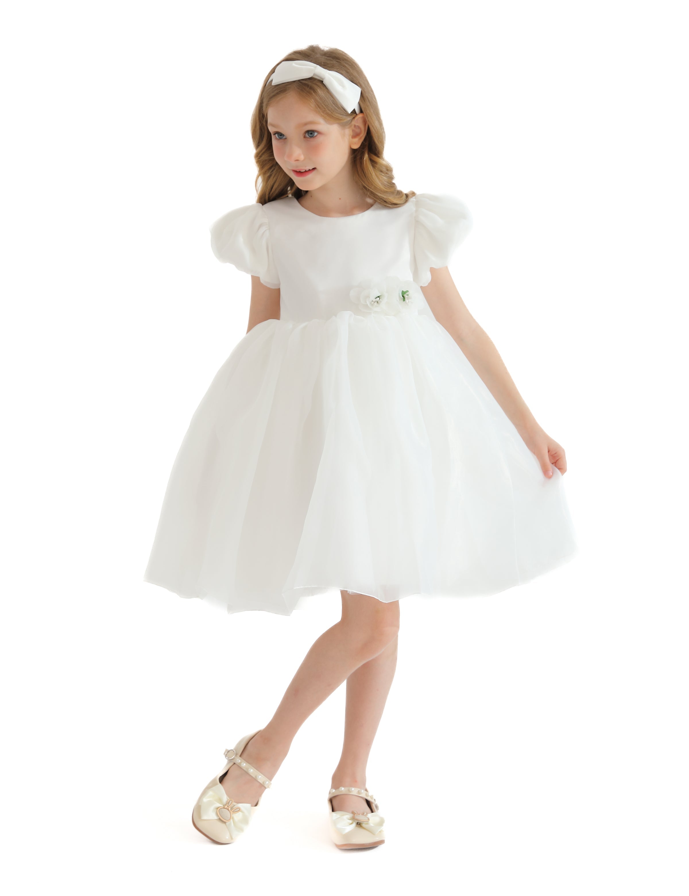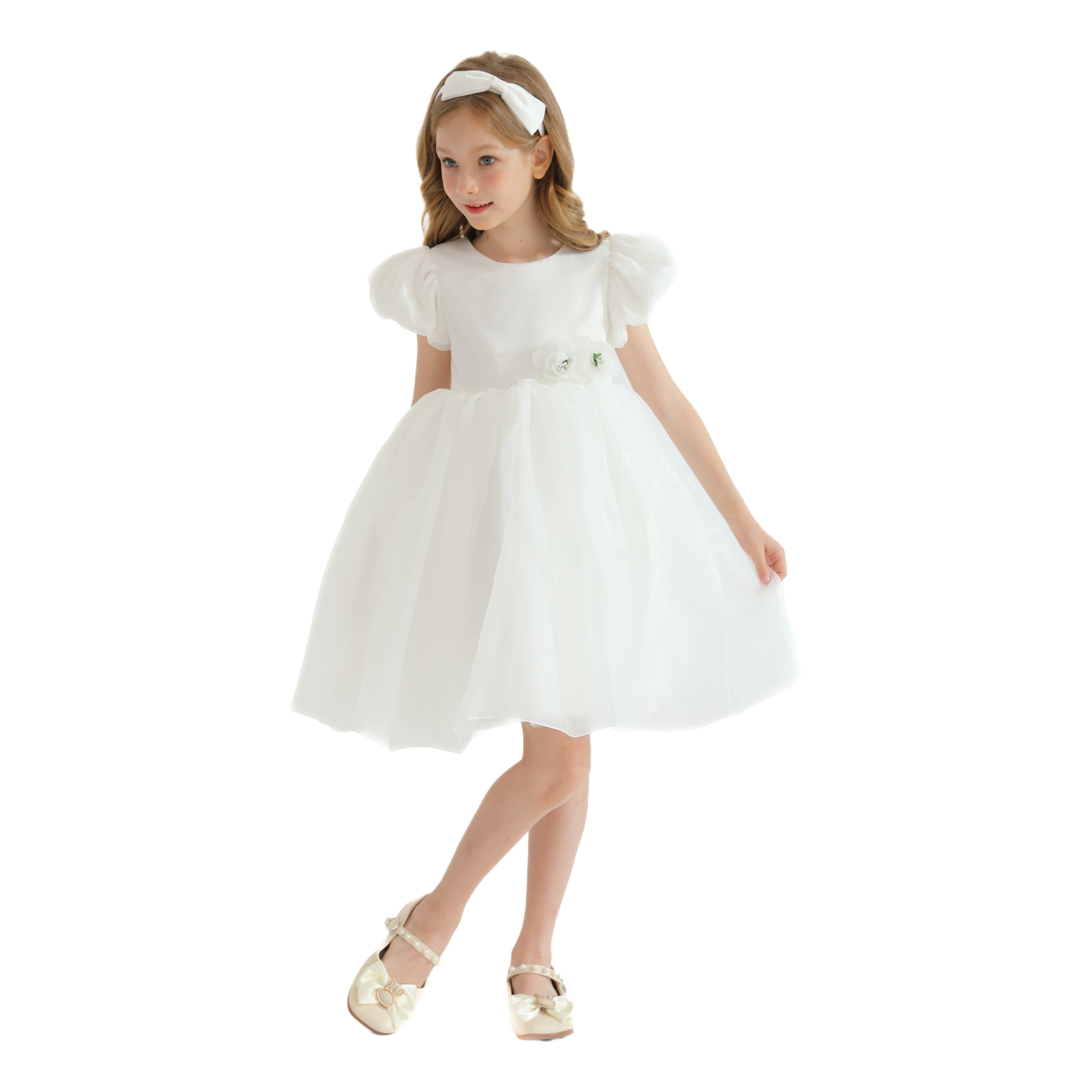 The White D'Amico Floral Teacup Dress for kid girls from Tulleen is a beautiful and elegant choice for any special occasion. This dress features a puff shoulder bodice, adding a touch of vintage-inspired charm and sophistication. Additionally, the floral embellishment at the hip provides a stylish accent that enhances the overall appeal of the dress.