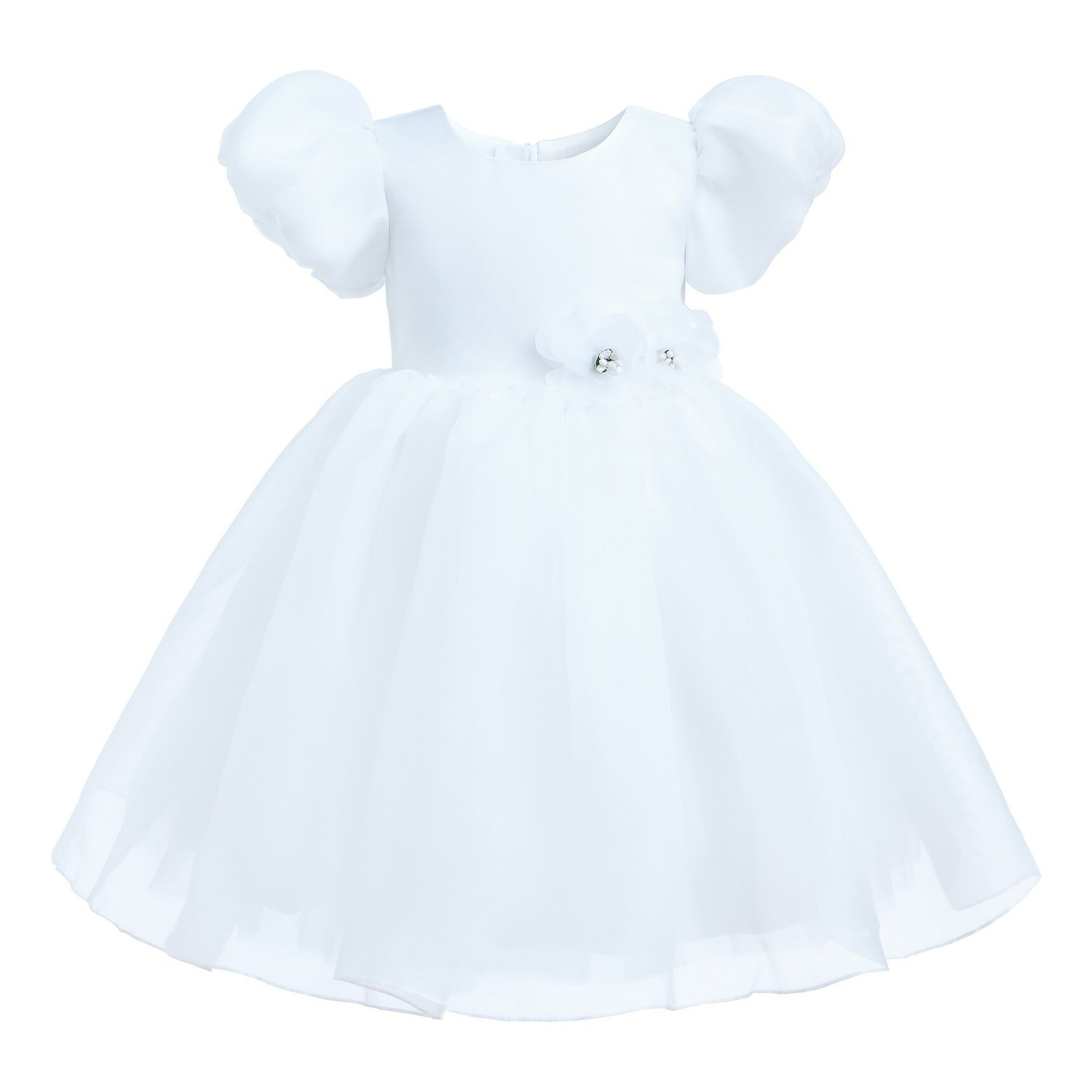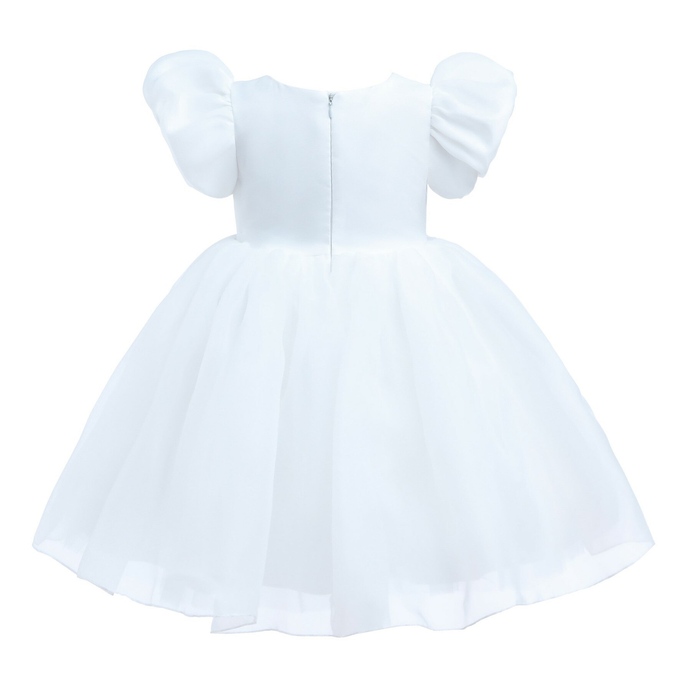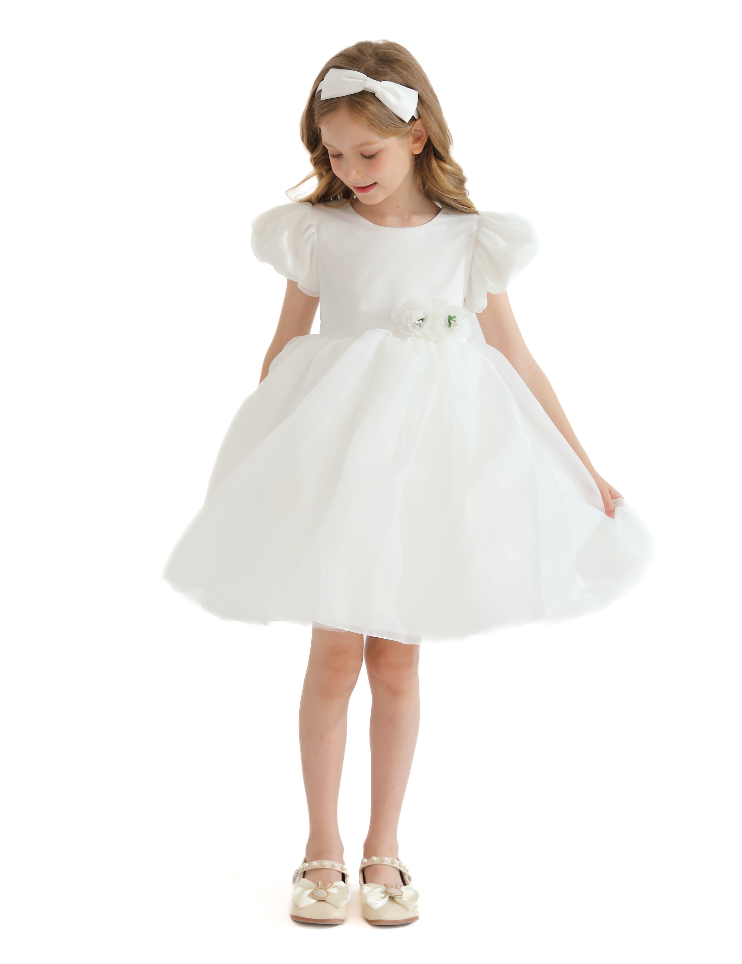 The White D'Amico Floral Teacup Dress for kid girls from Tulleen is a beautiful and elegant choice for any special occasion. This dress features a puff shoulder bodice, adding a touch of vintage-inspired charm and sophistication. Additionally, the floral embellishment at the hip provides a stylish accent that enhances the overall appeal of the dress.