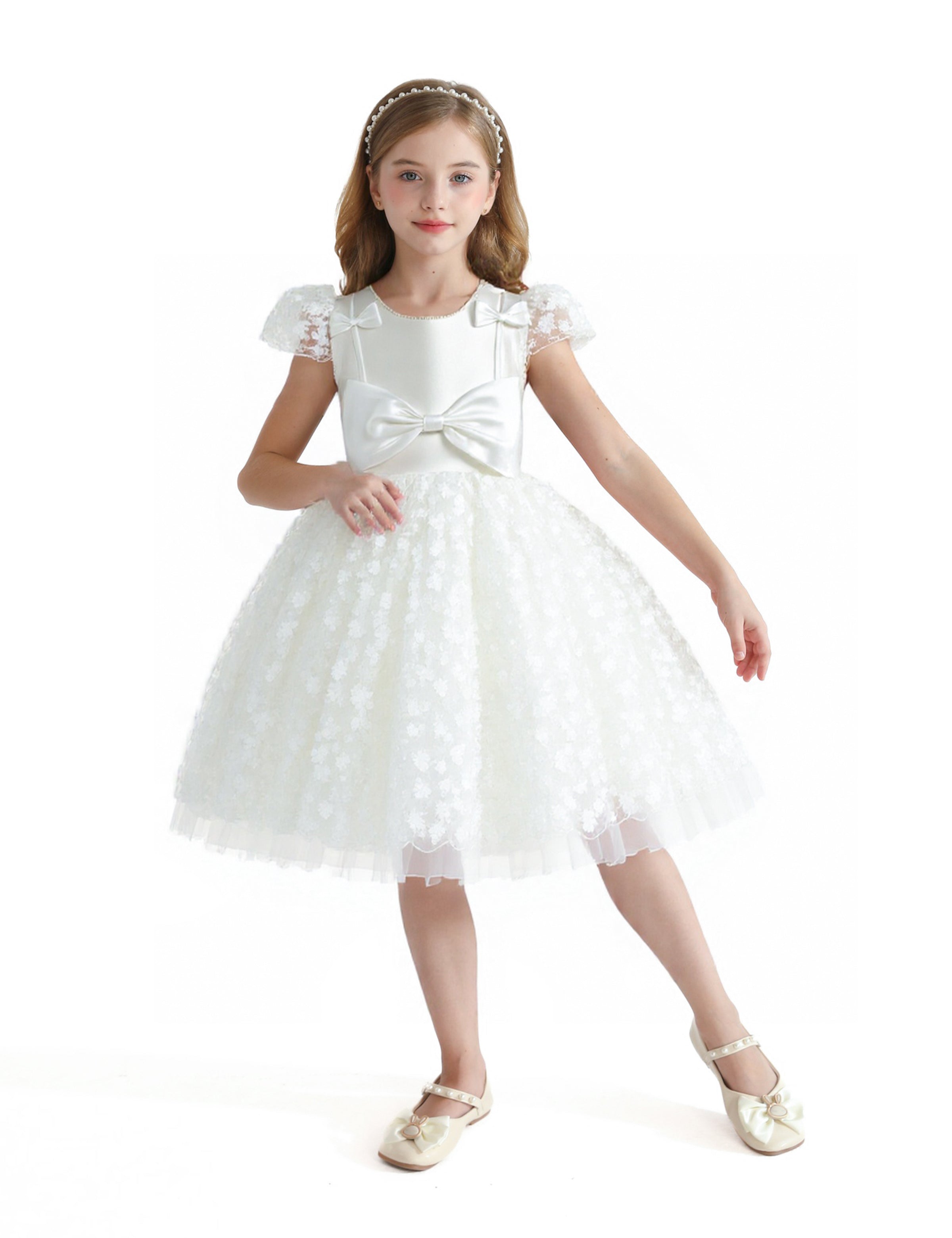 The beautifully layered floral silhouette creates a sense of volume and movement, adding a touch of whimsy to its refined design. A statement bow at the front, complemented by two delicate shoulder bows, enhances its graceful appeal, while a charming back tie bow provides the perfect finishing touch.