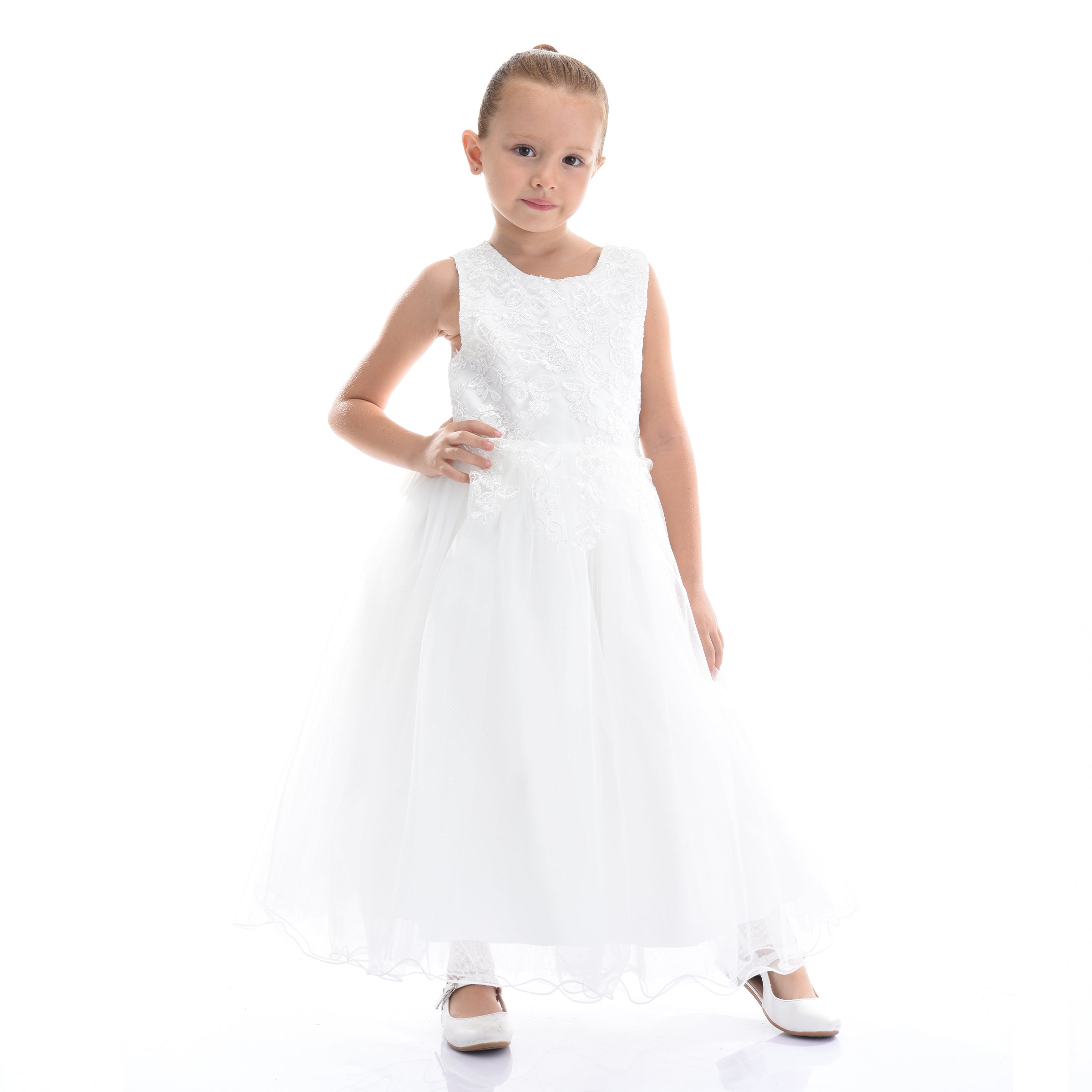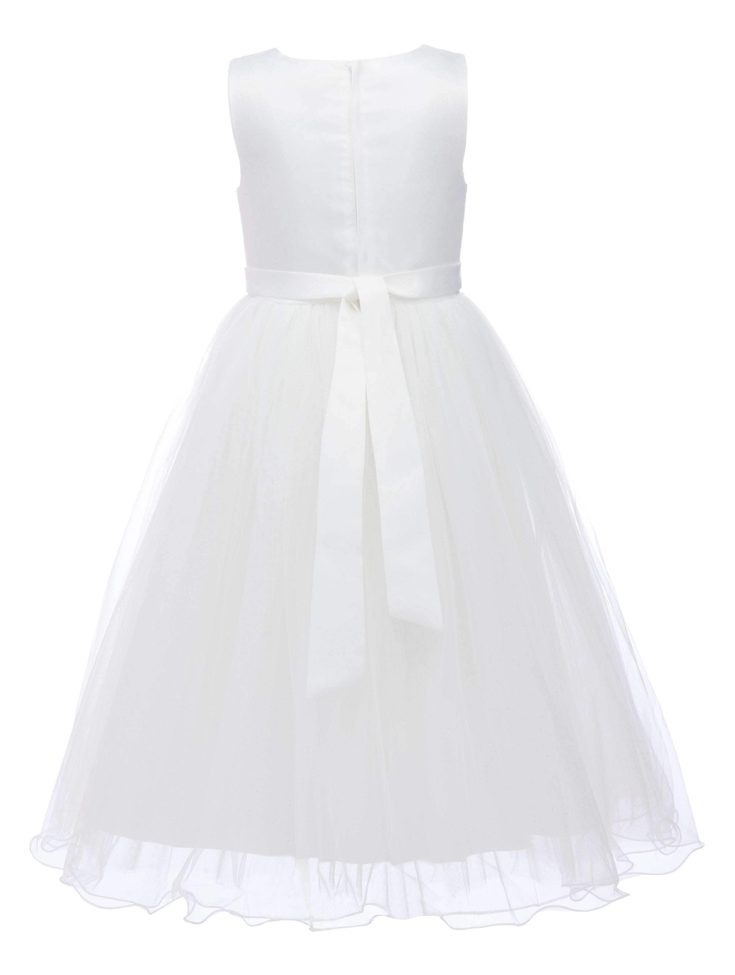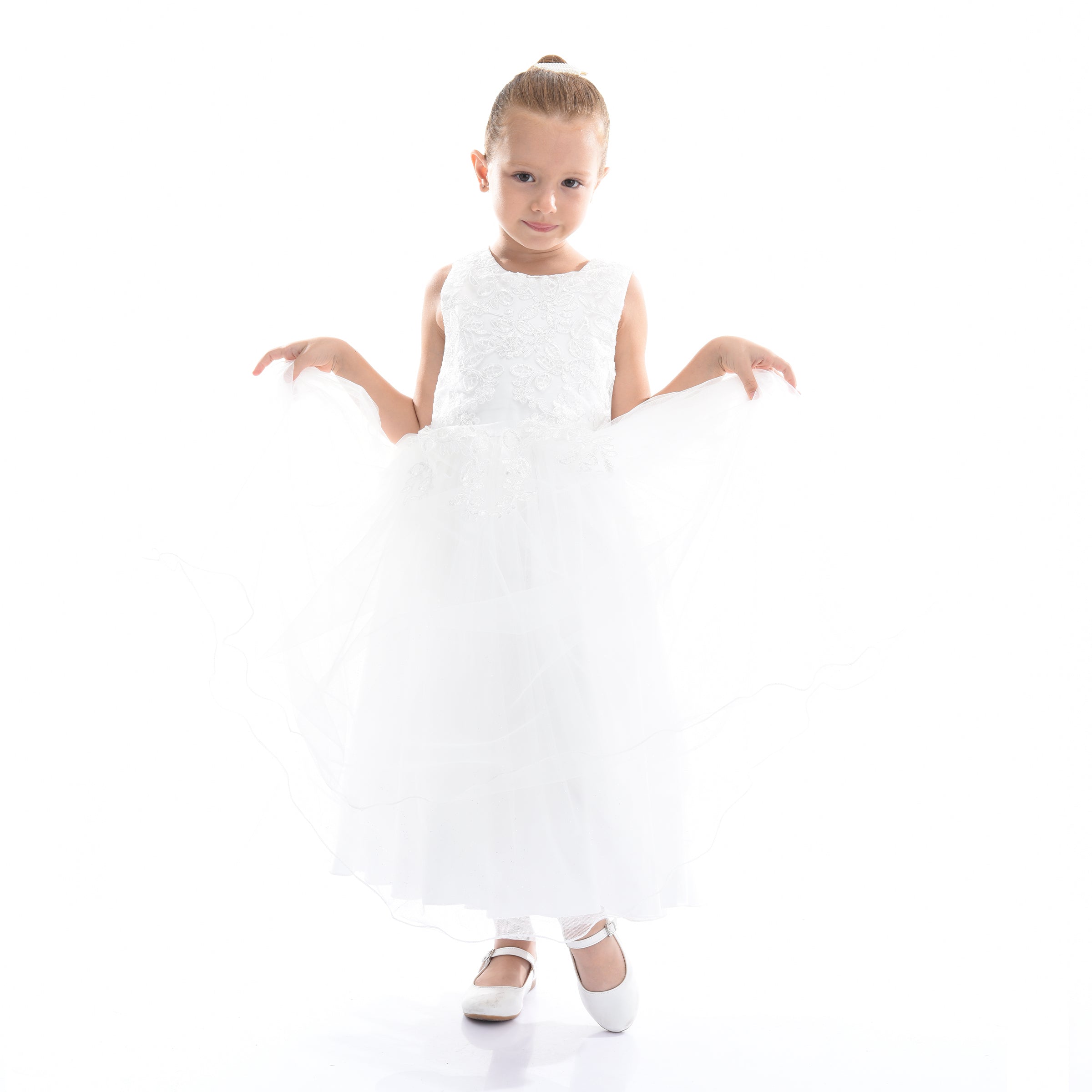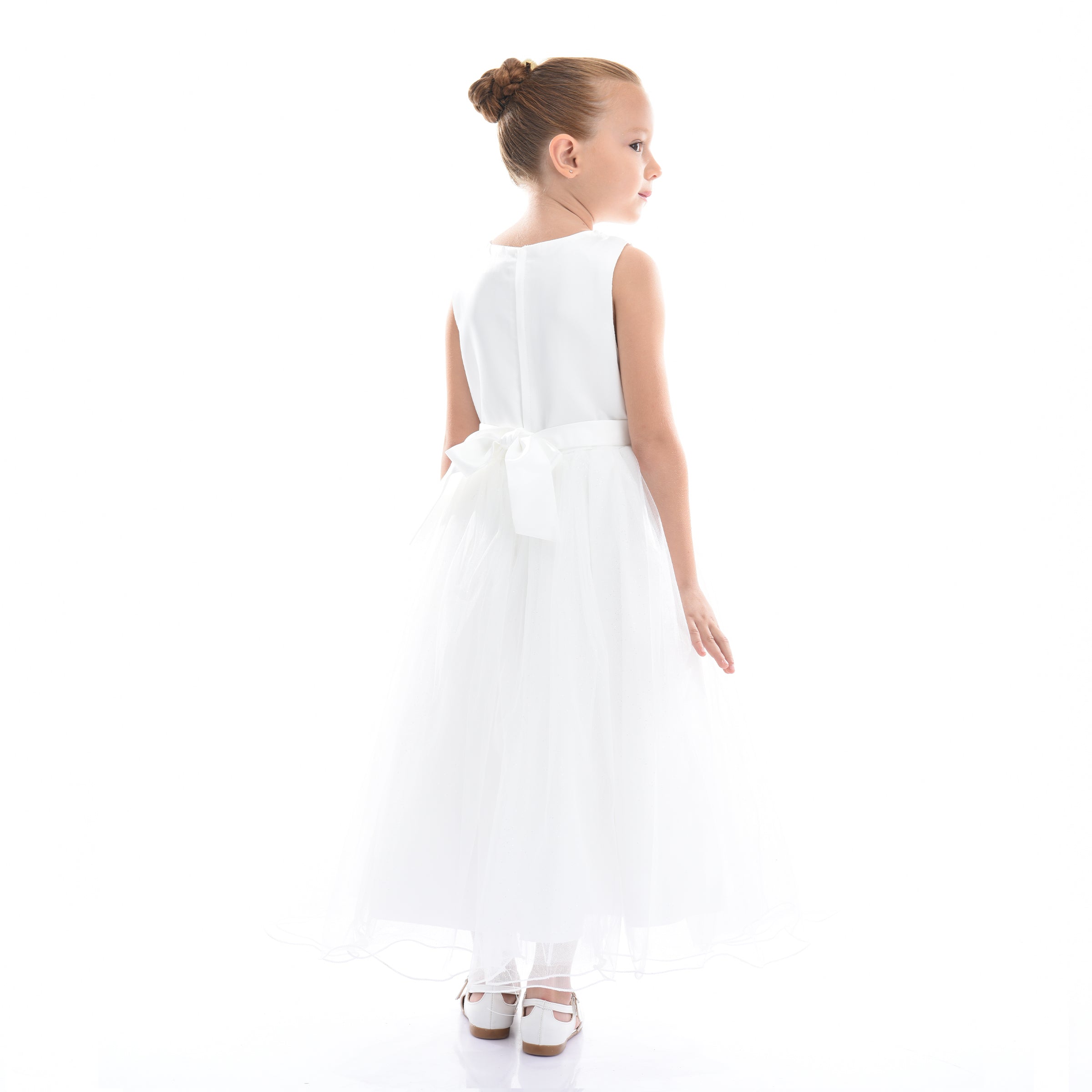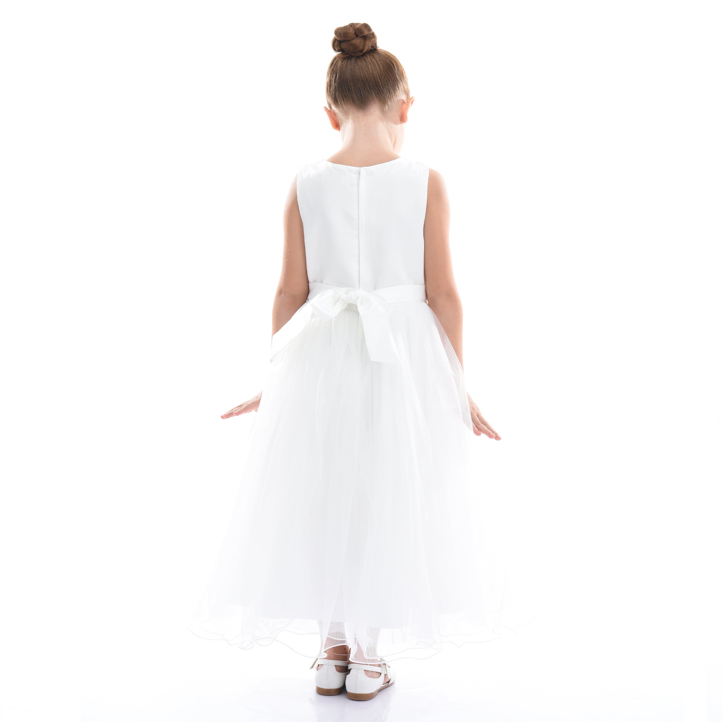 The White Halsey Embroidered Dress for kid girls from Tulleen is an exquisite and elegant choice for any special occasion. This dress features a white sleeveless bodice adorned with a beautiful white floral embroidered design, adding a touch of charm and sophistication. Additionally, the round neck provides a classic and comfortable fit. The white satin belt tied in the back enhances the dress's elegance, providing a stylish accent.