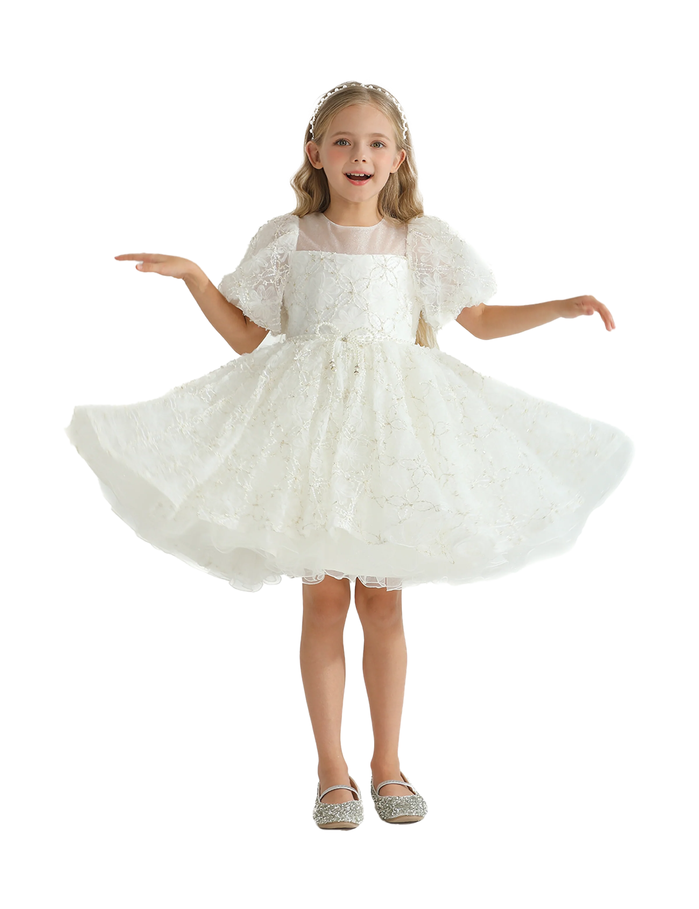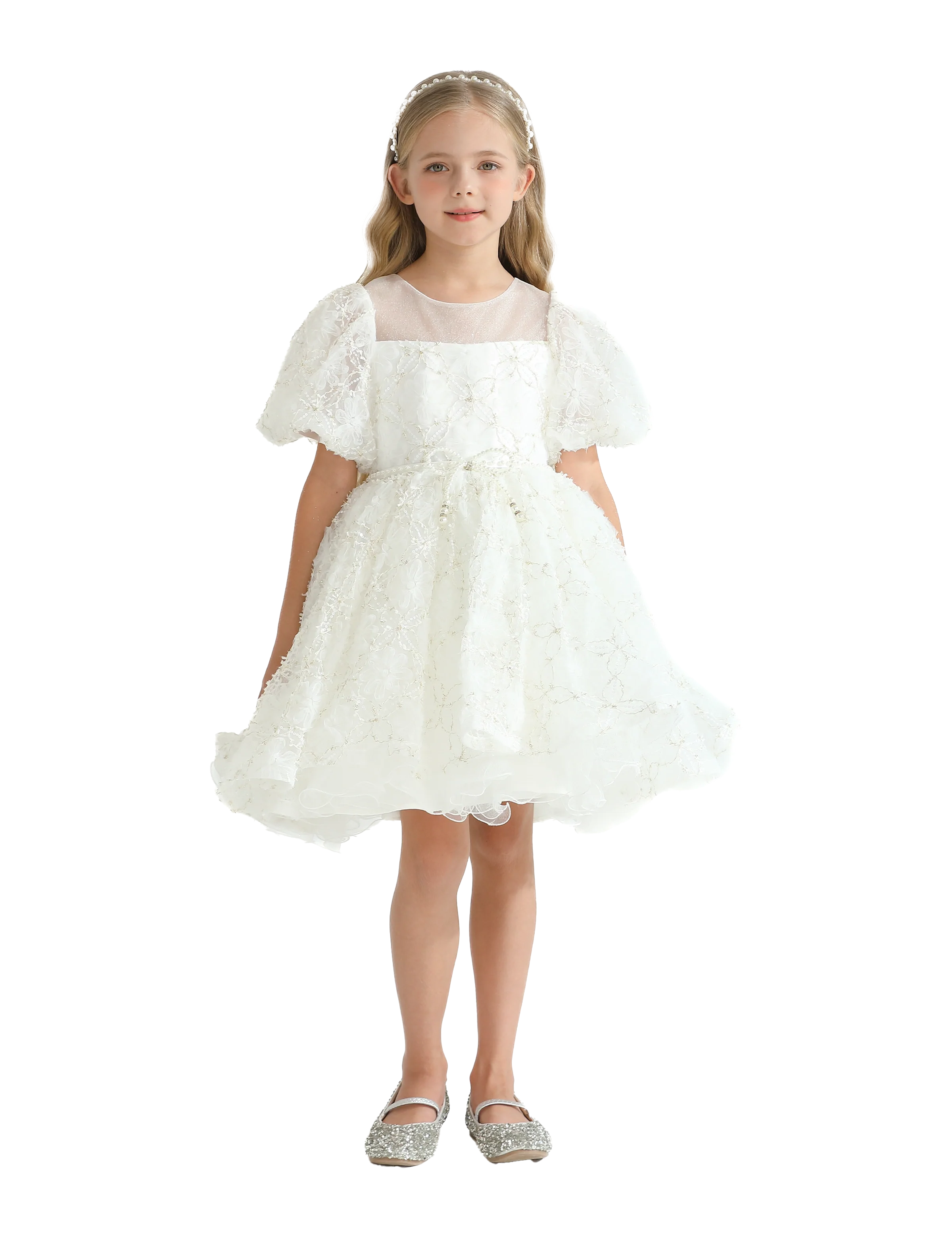 Introducing the elegant White Laced Tulle Flower Wynfair Dress by Tulleen, a stunning creation tailored for little girls who adore timeless beauty. This enchanting dress showcases a white tulle overlay adorned with delicate beadwork and intricate floral patterns, exuding charm and sophistication.