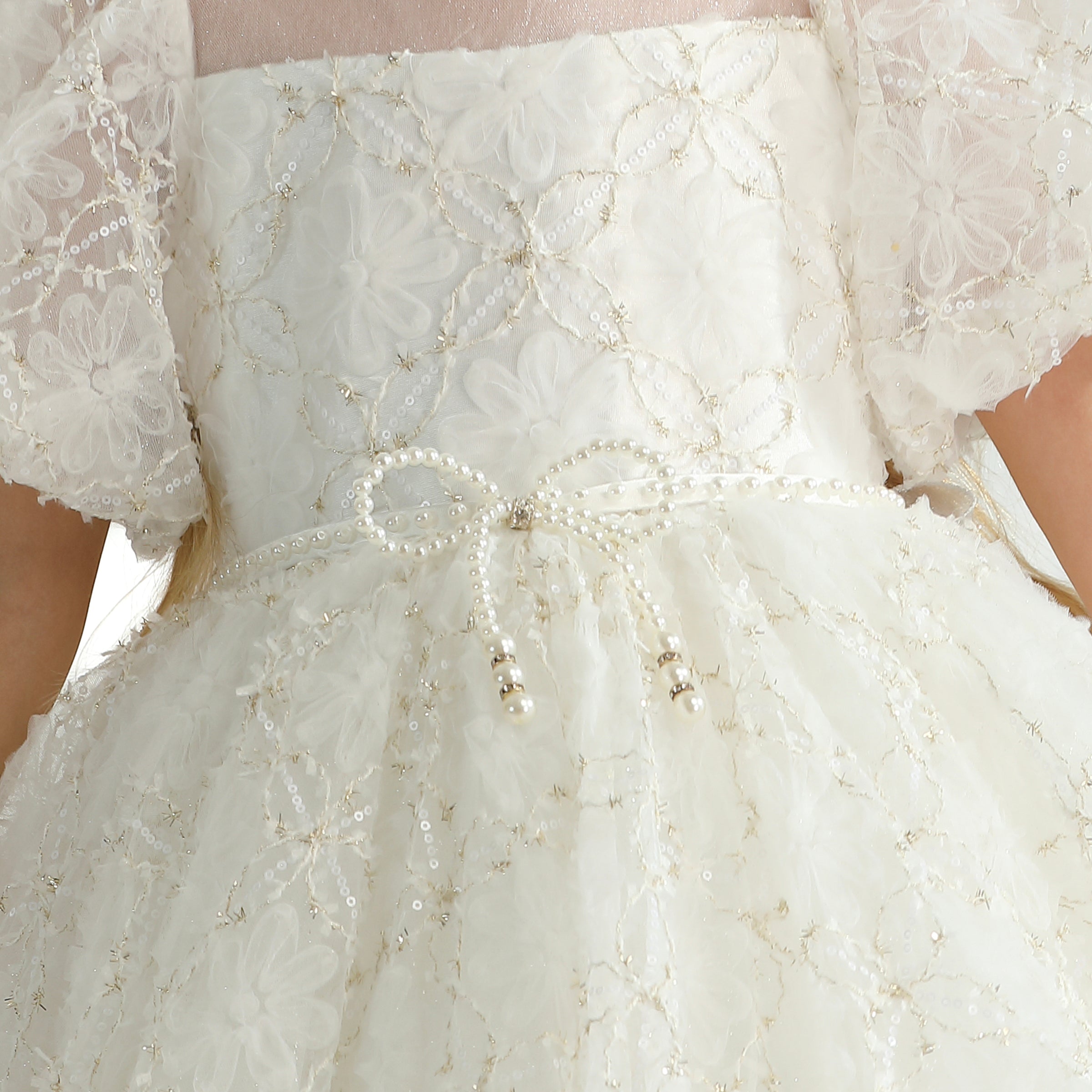 Ivory accents gracefully complement the design, while a pearl-lined ribbon adds an extra layer of refinement, making this dress truly one-of-a-kind. The soft, flowing tulle creates a dreamy silhouette, perfect for special occasions where elegance is key.