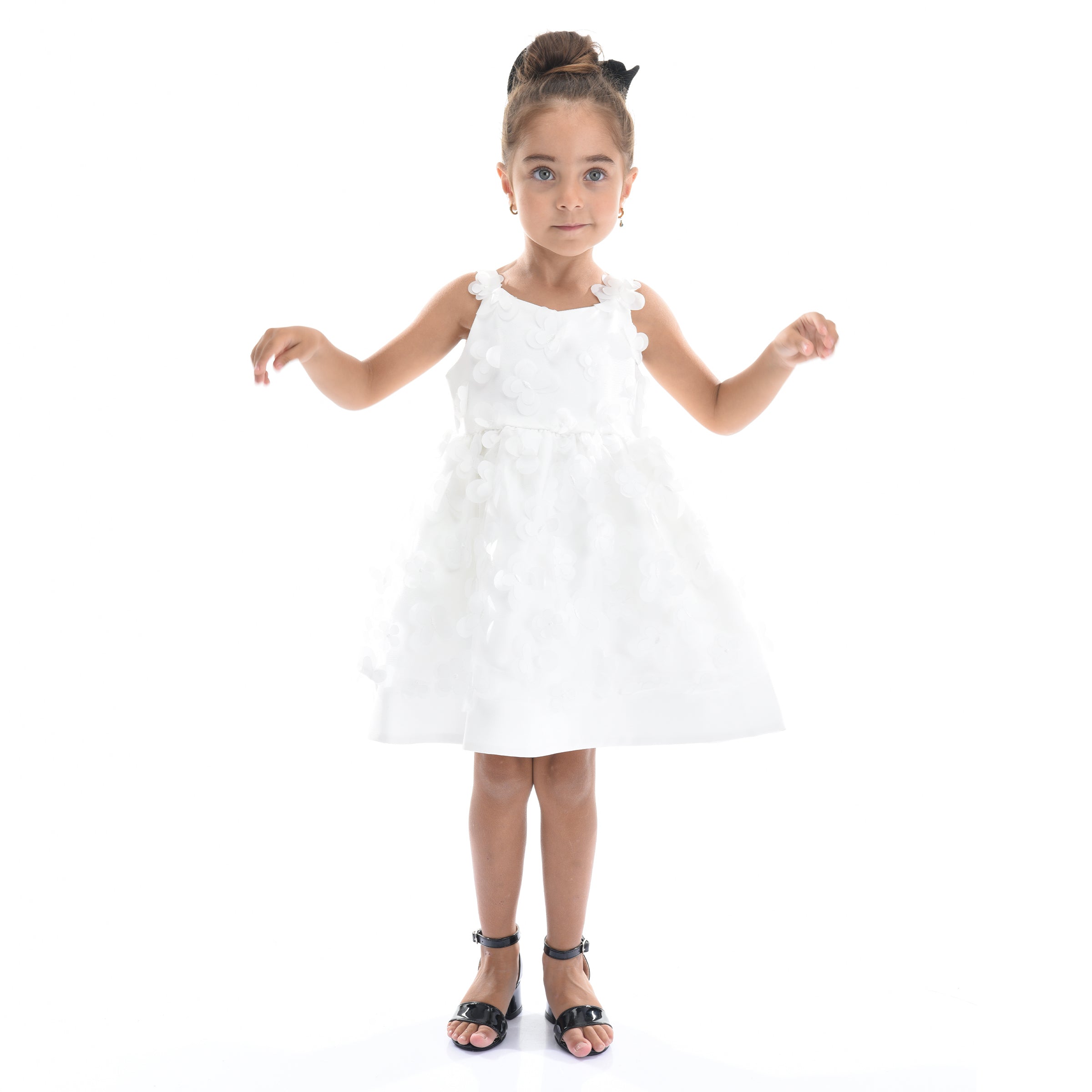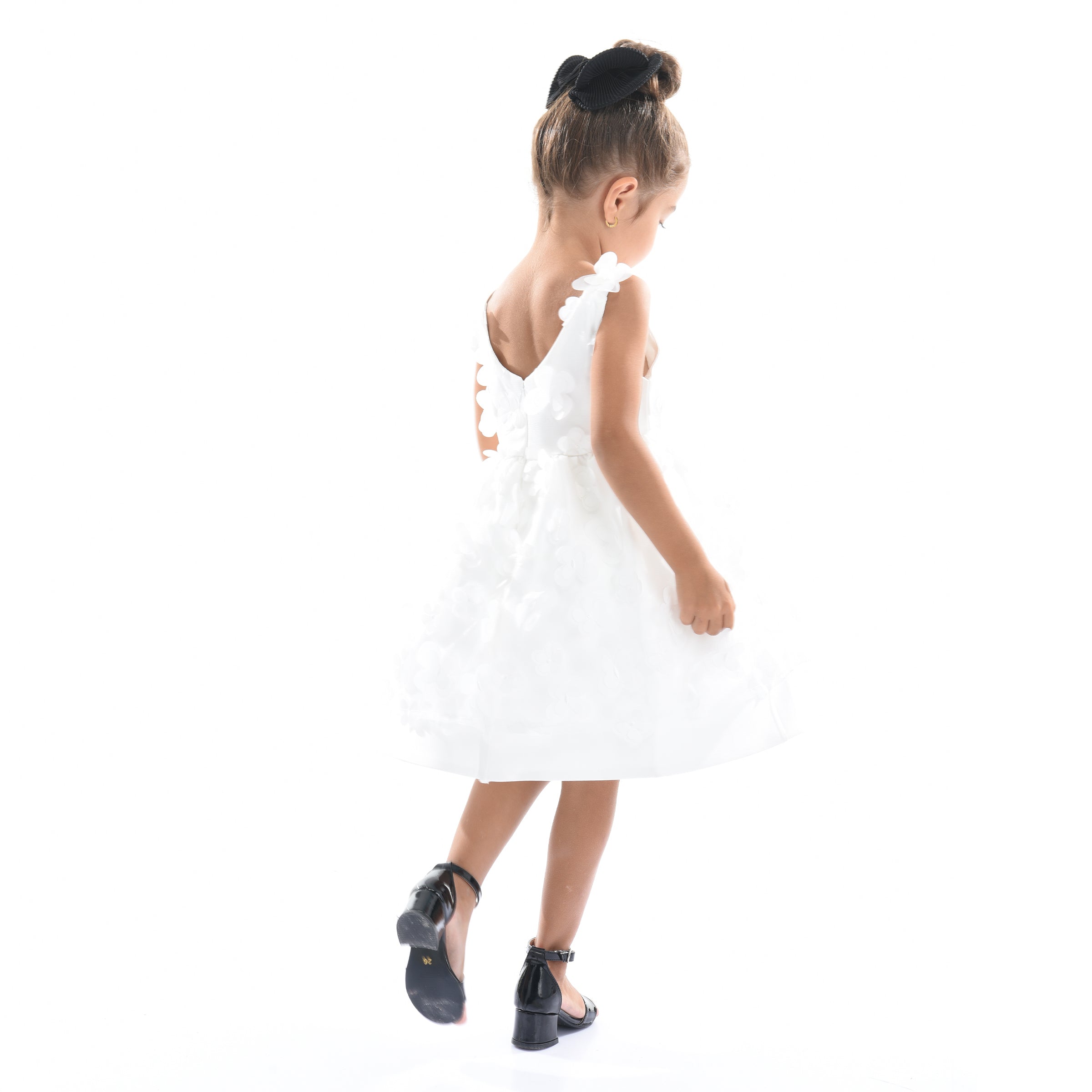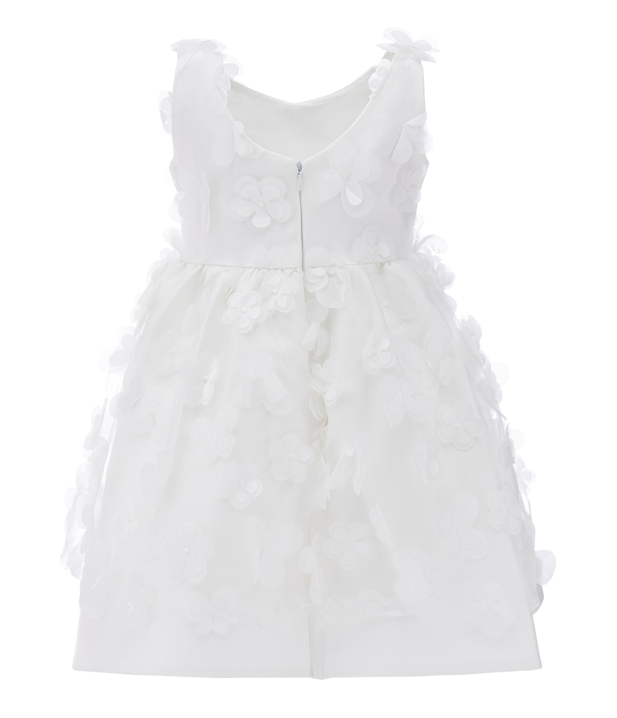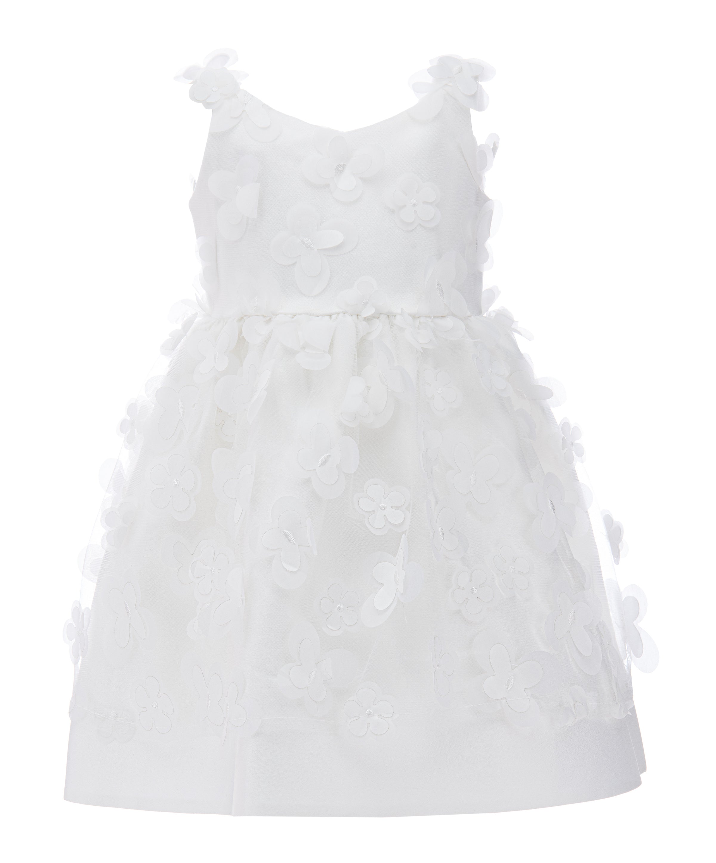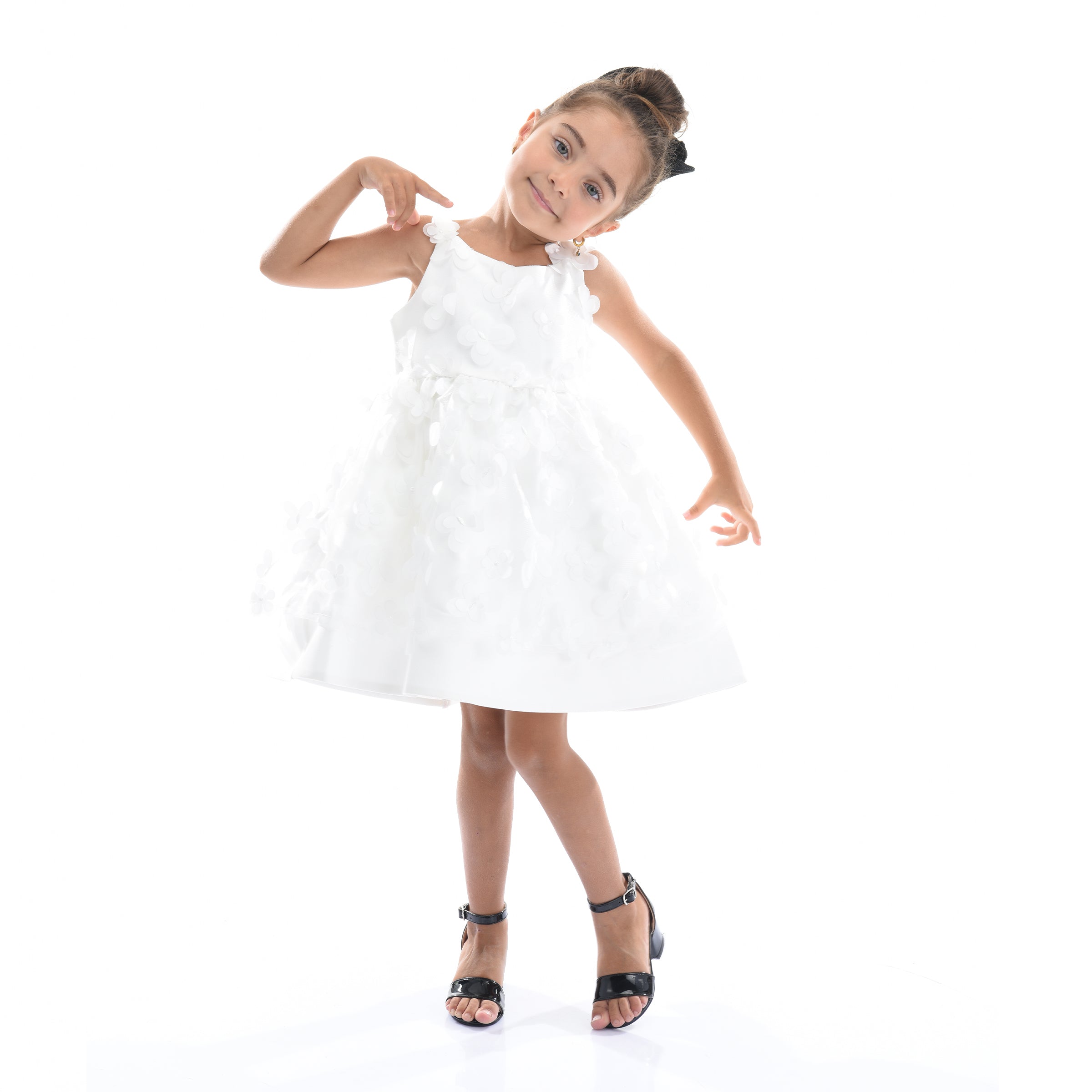 The White Lago Floral Dress for kid girls from Tulleen is a stunning piece, perfect for any special occasion. This dress is decorated with eye-catching 3D floral embellishments. The bodice features a double layer in clean white, adorned with mini cutout flowers that match the skirt. The beautiful design ensures your child stands out with elegance and charm.