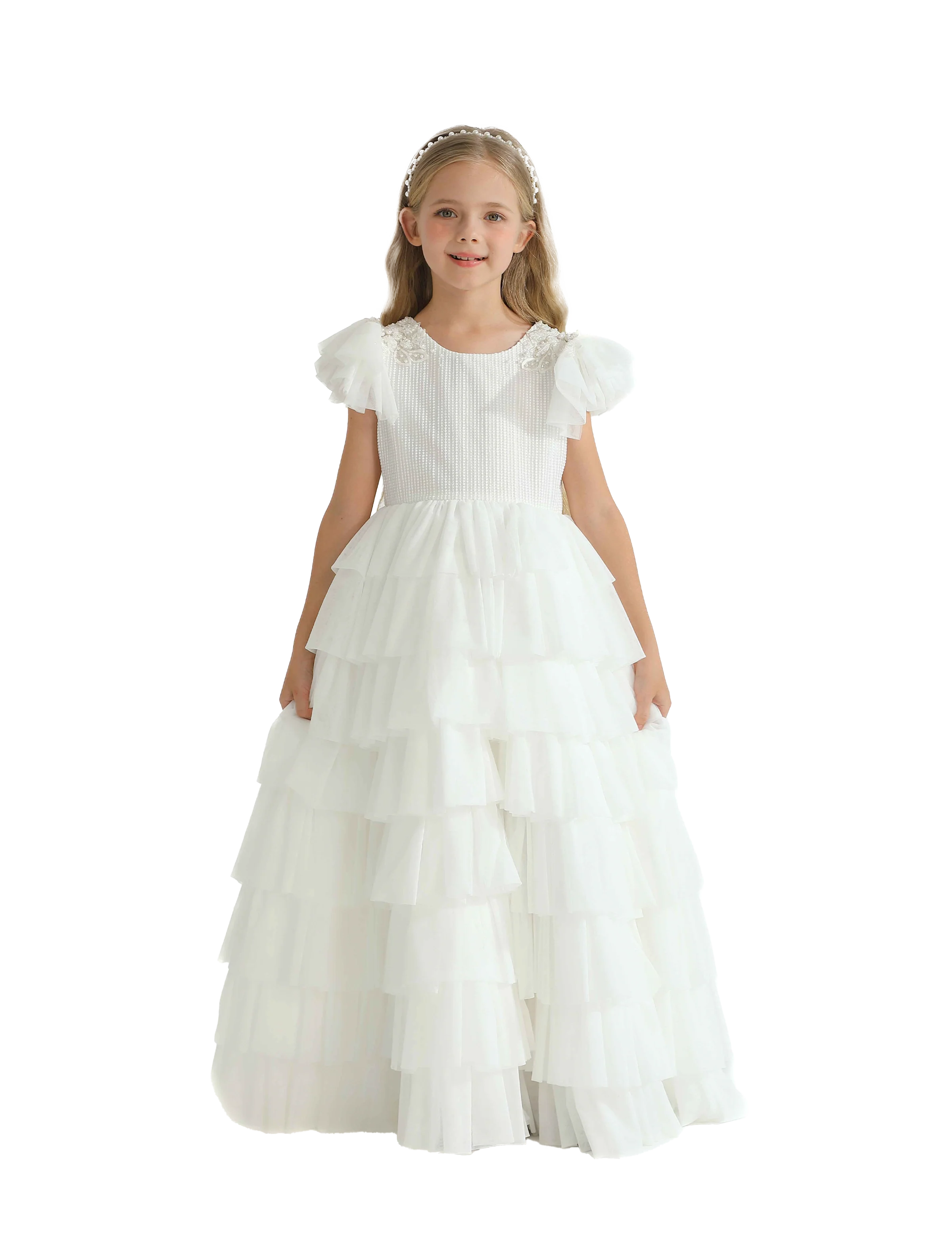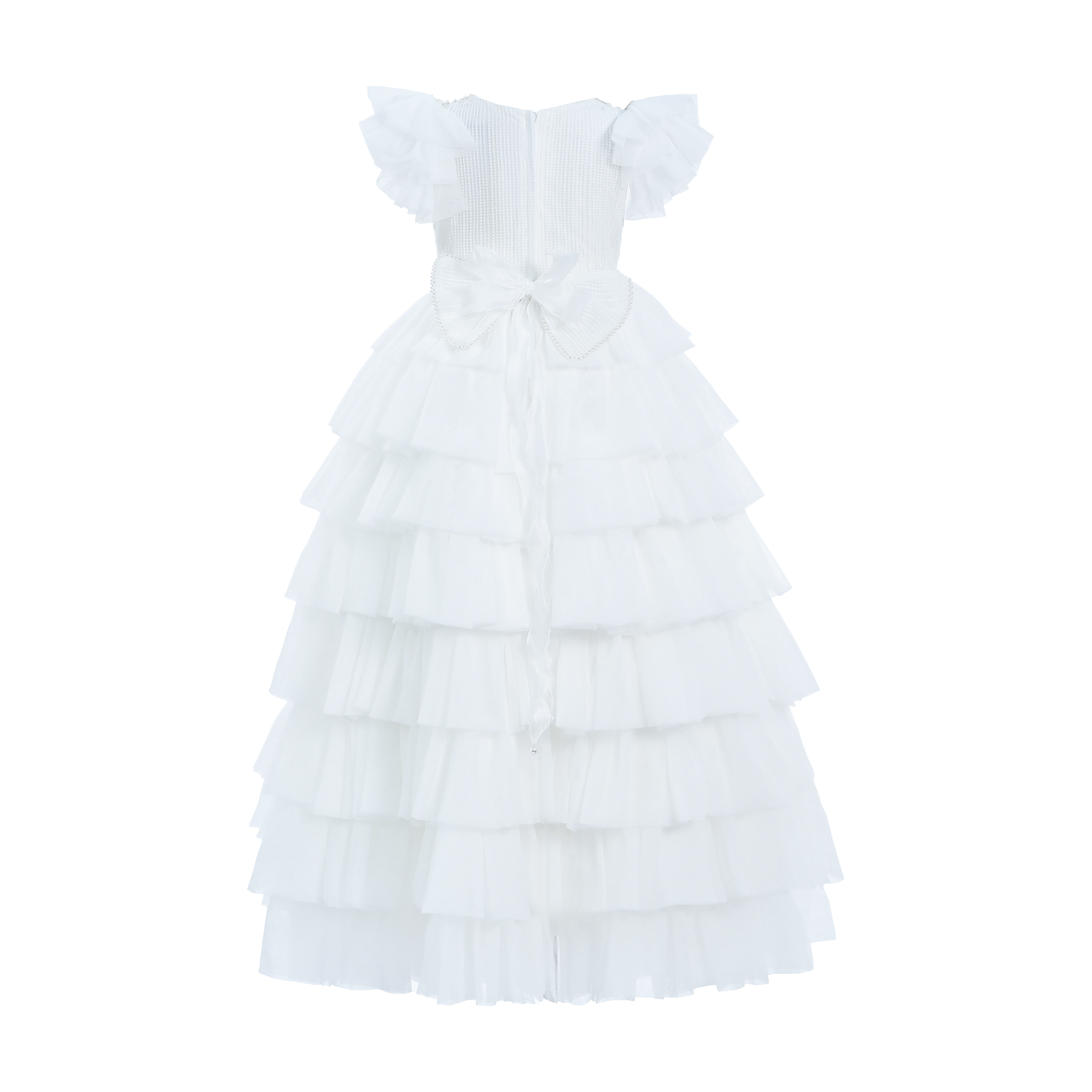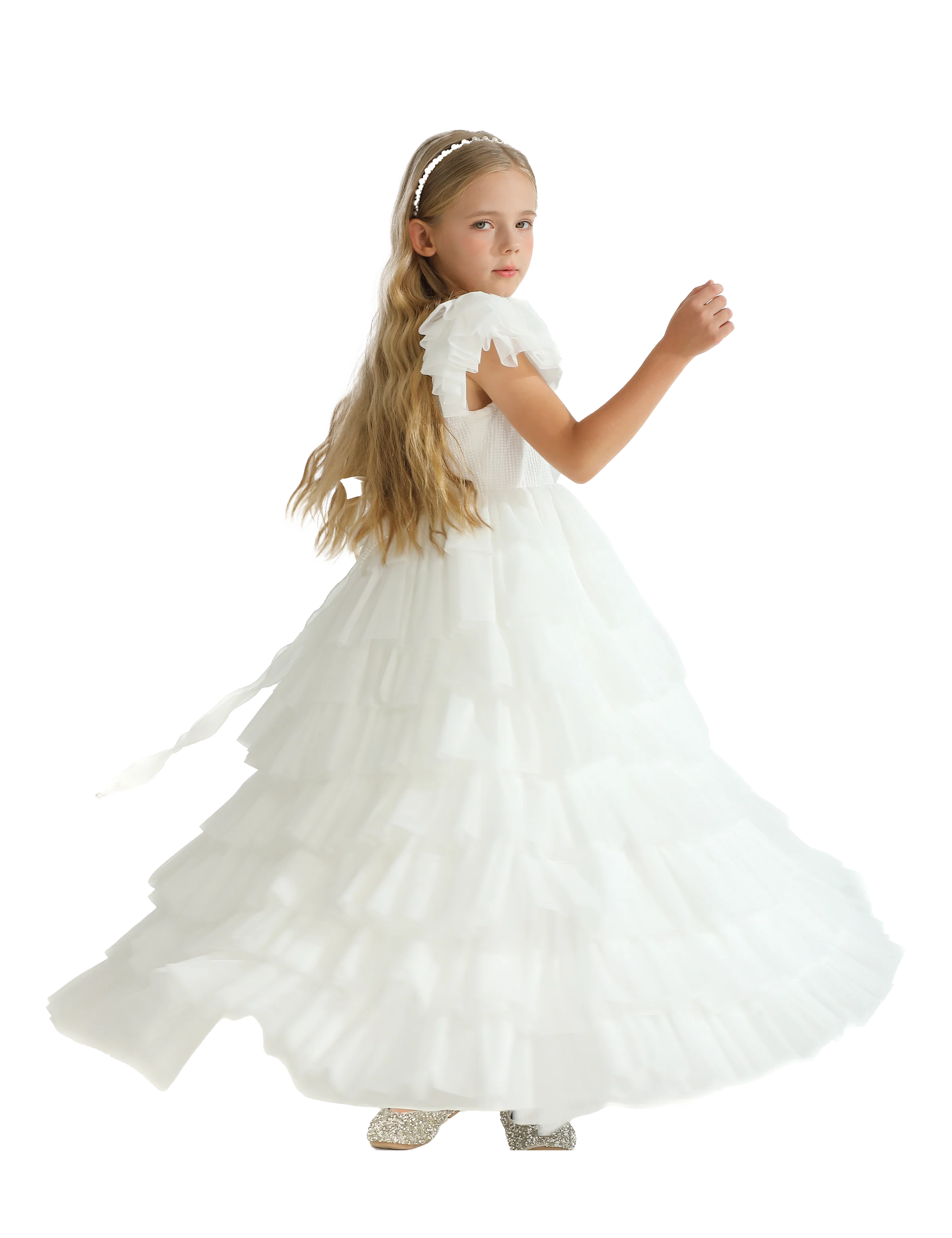 Introducing the graceful White Layered Tulle Abbyfield Dress by Tulleen, a charming blend of elegance and whimsy created for young girls with an eye for style. Designed in a soft cream-white hue, this dress exudes timeless sophistication, perfect for making a statement at any special occasion.