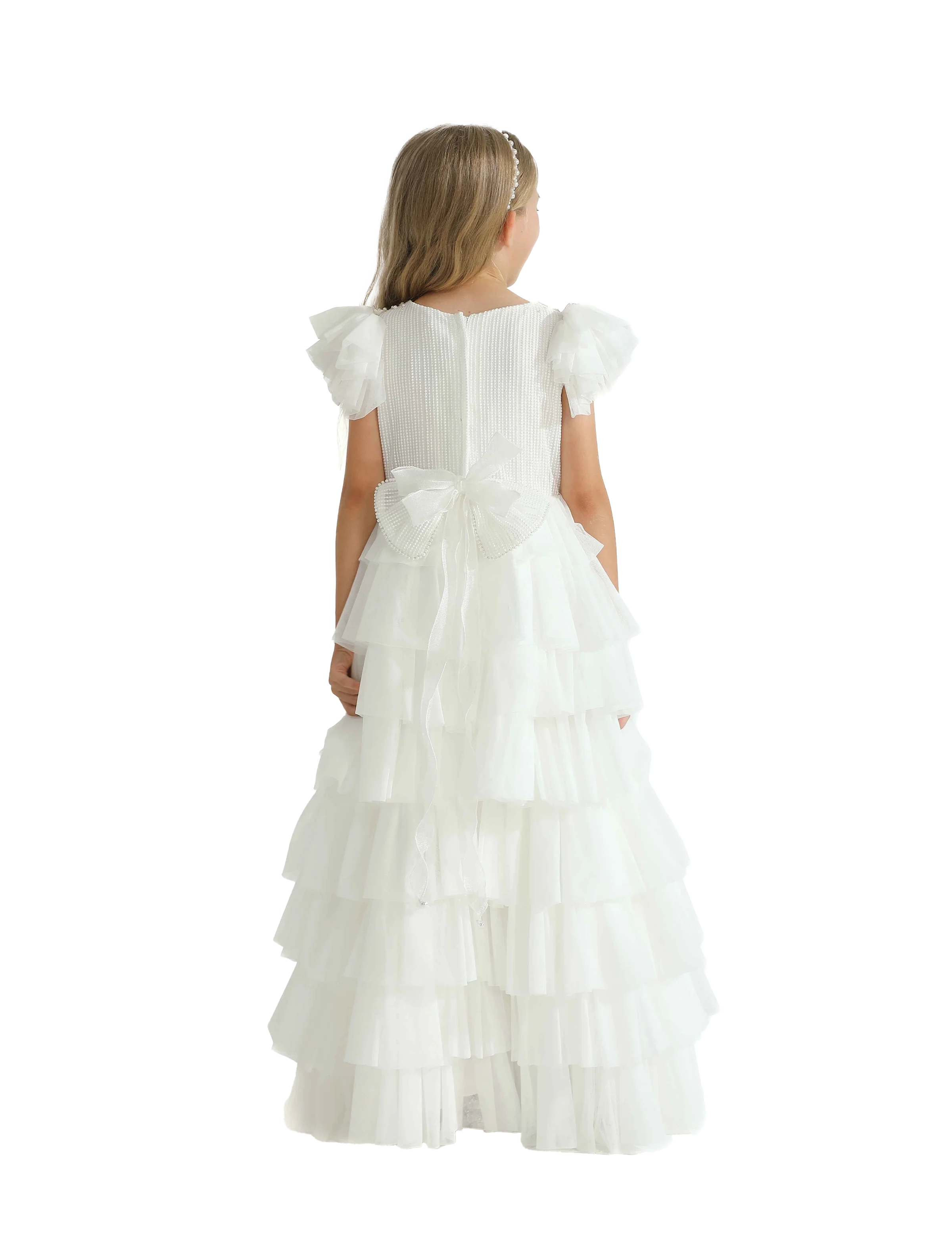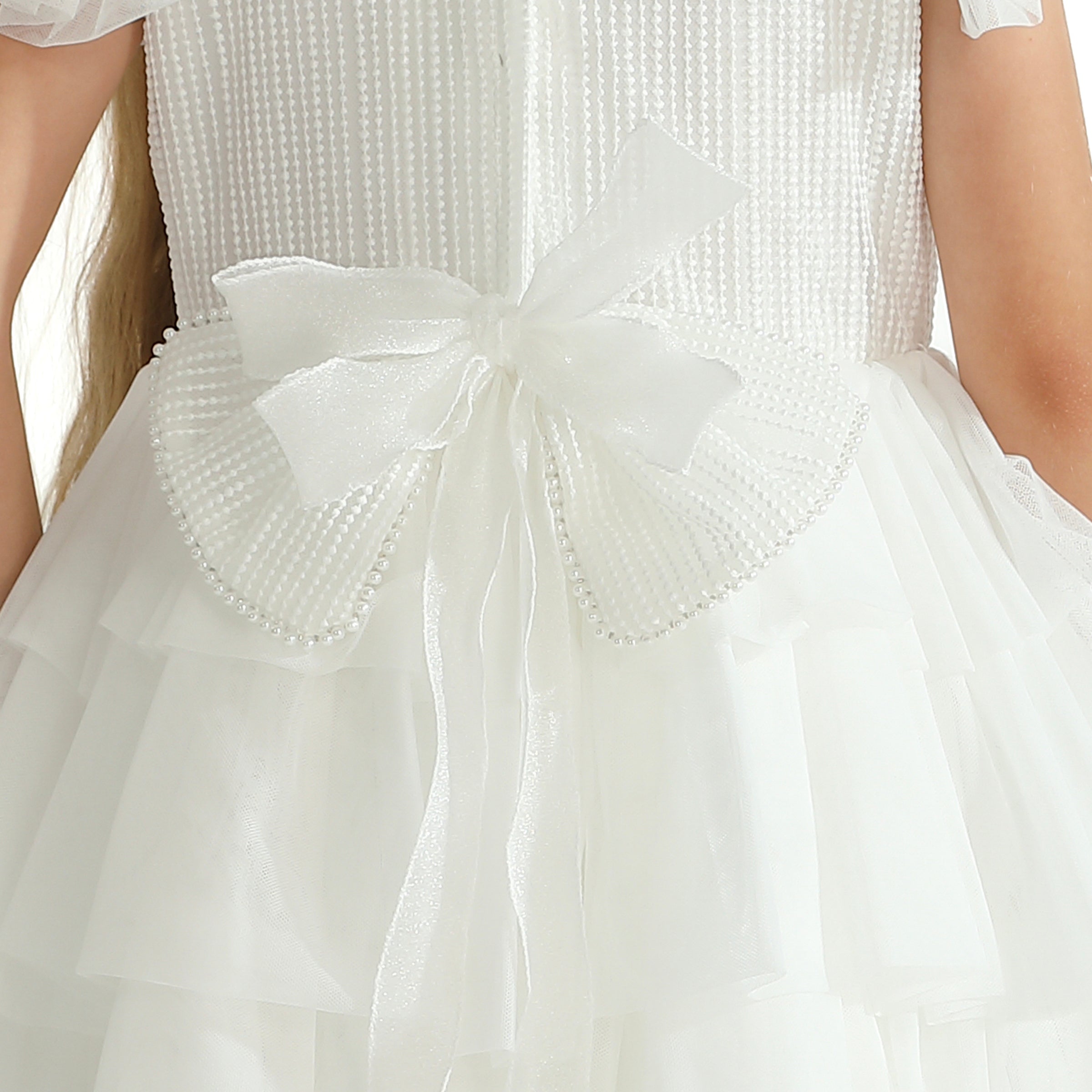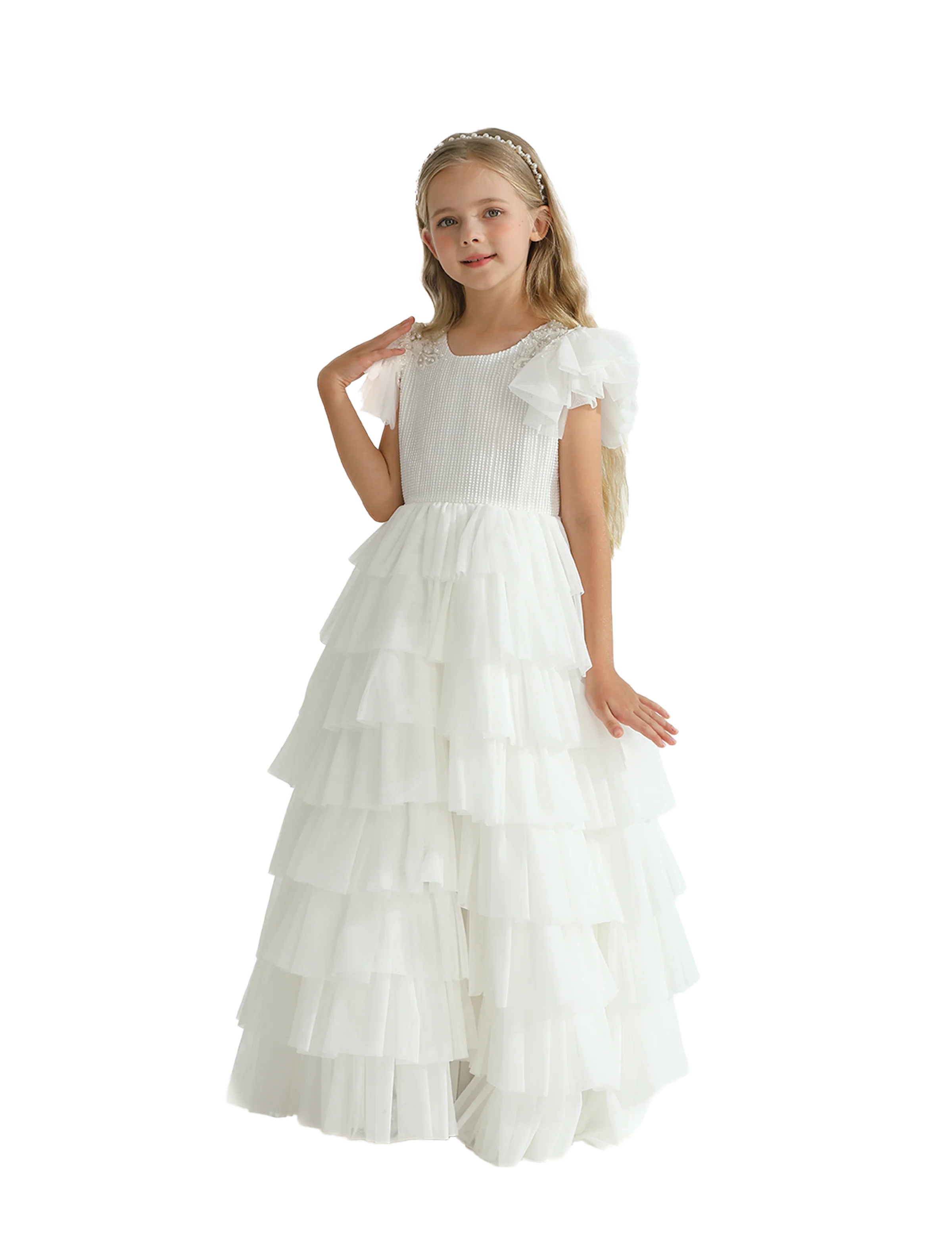 Introducing the graceful White Layered Tulle Abbyfield Dress by Tulleen, a charming blend of elegance and whimsy created for young girls with an eye for style. Designed in a soft cream-white hue, this dress exudes timeless sophistication, perfect for making a statement at any special occasion.