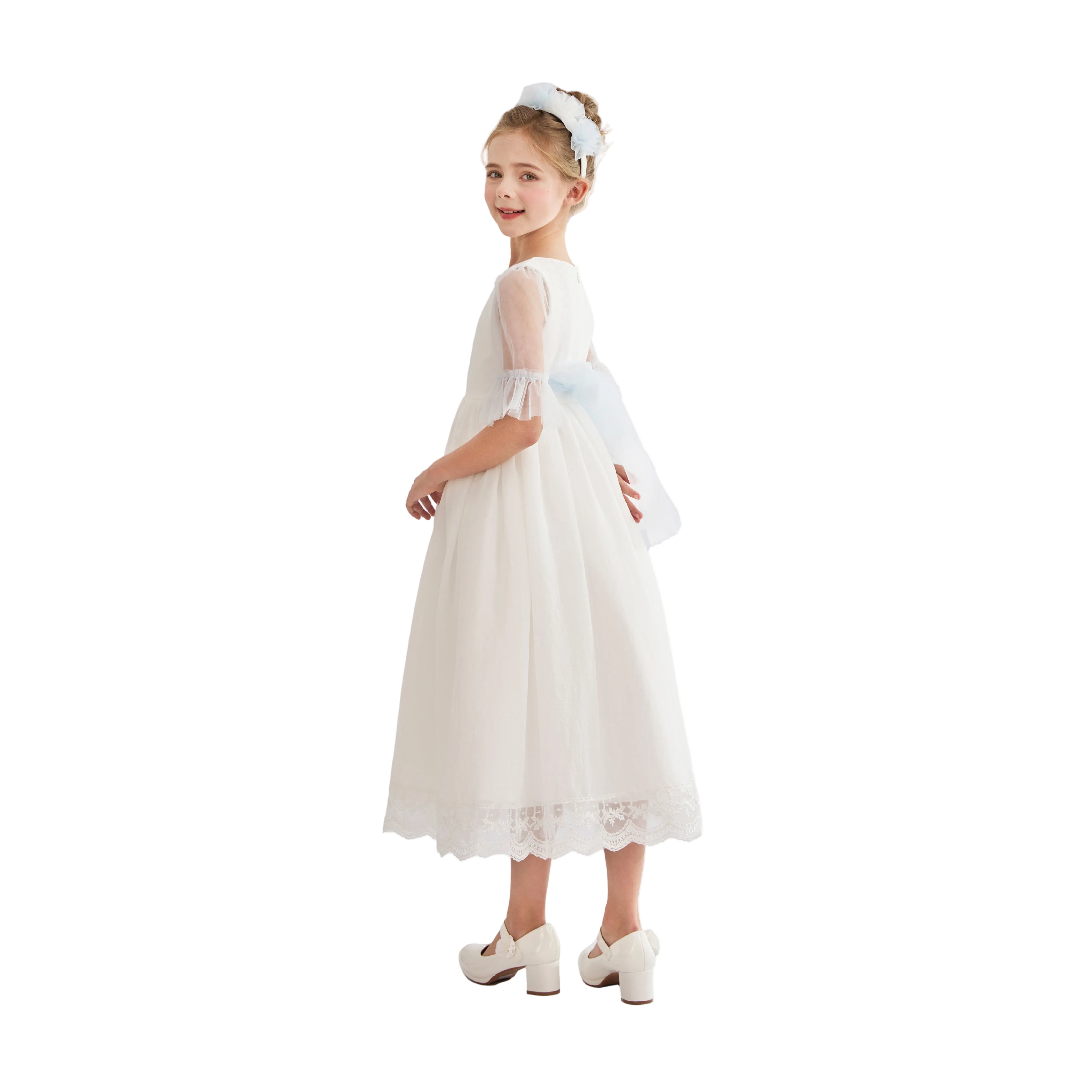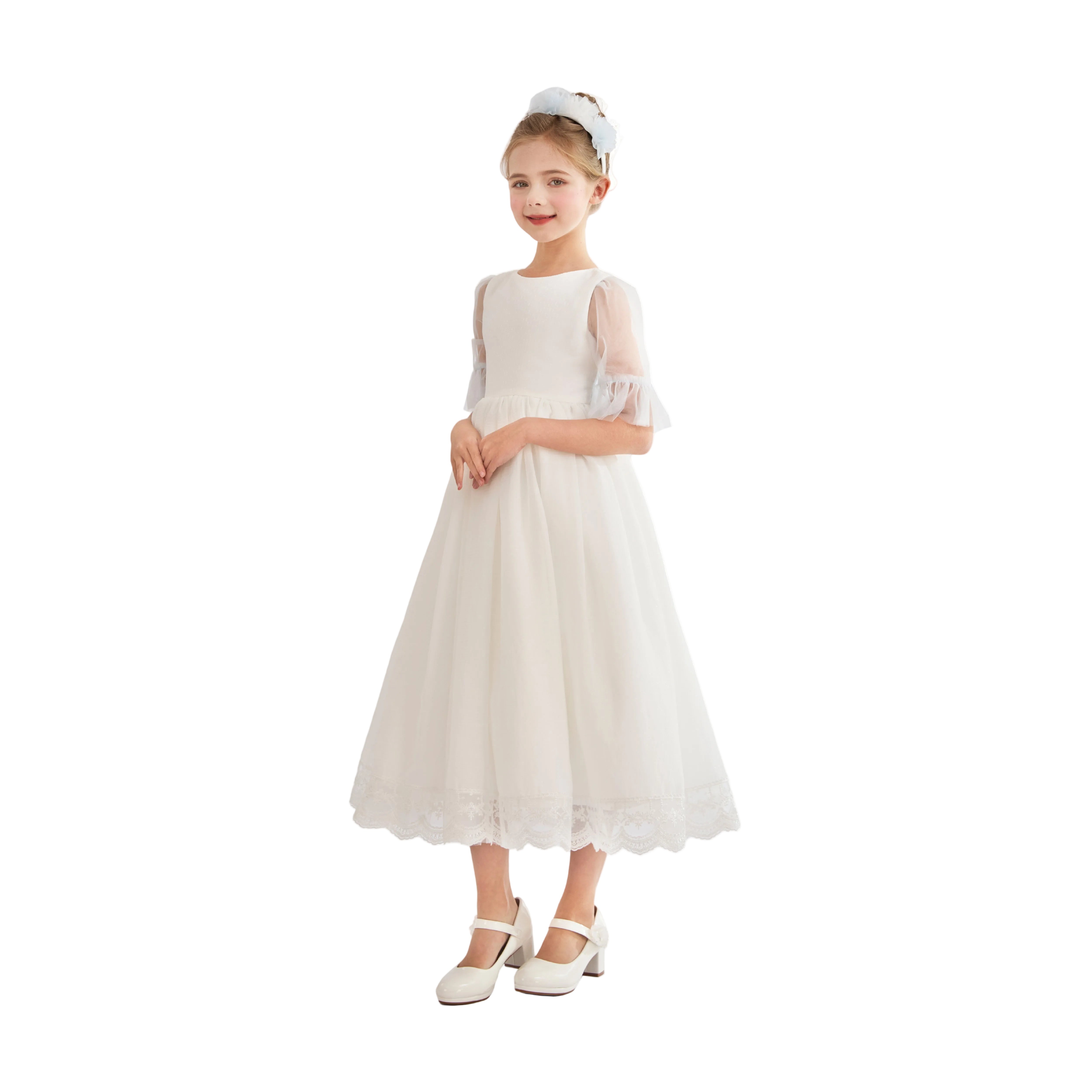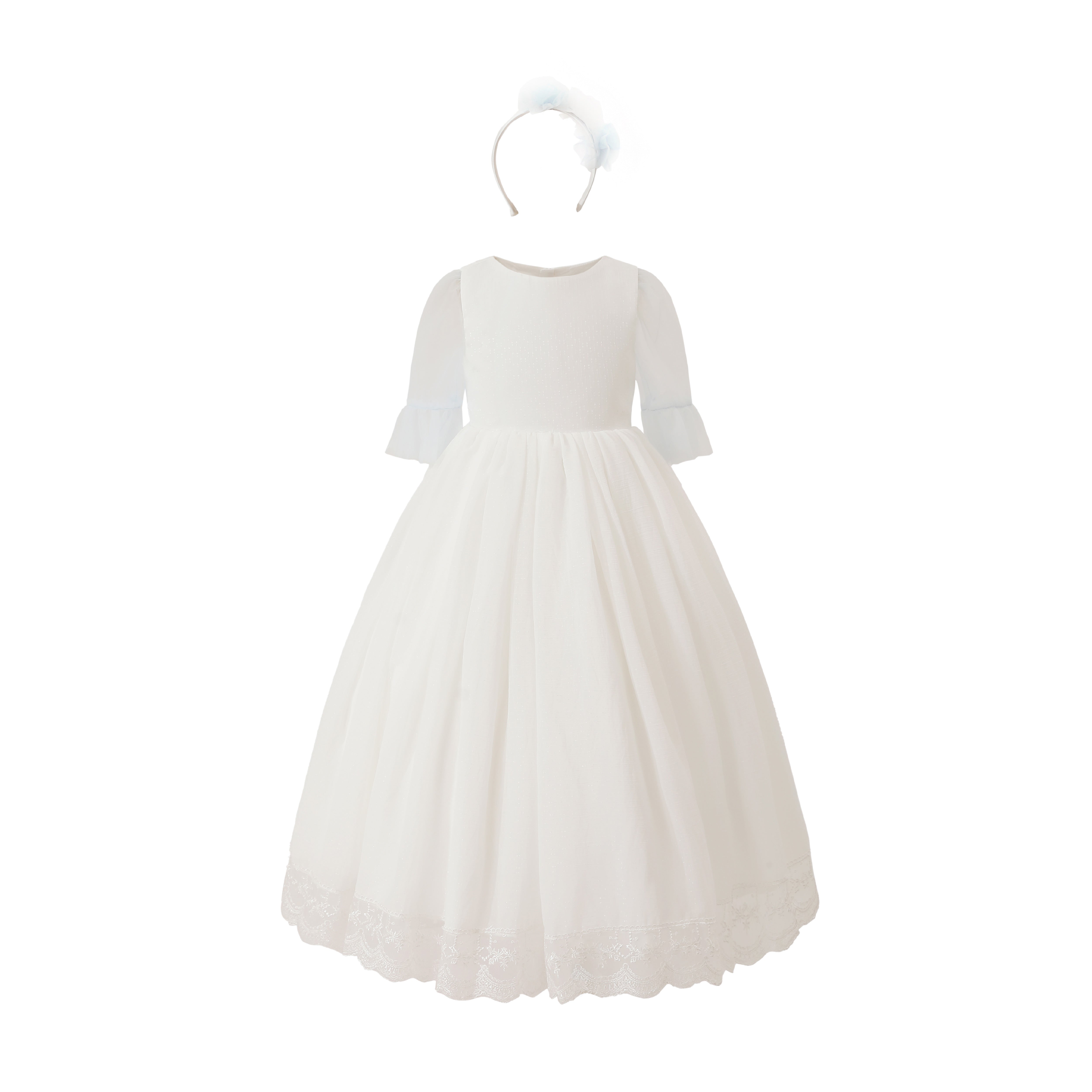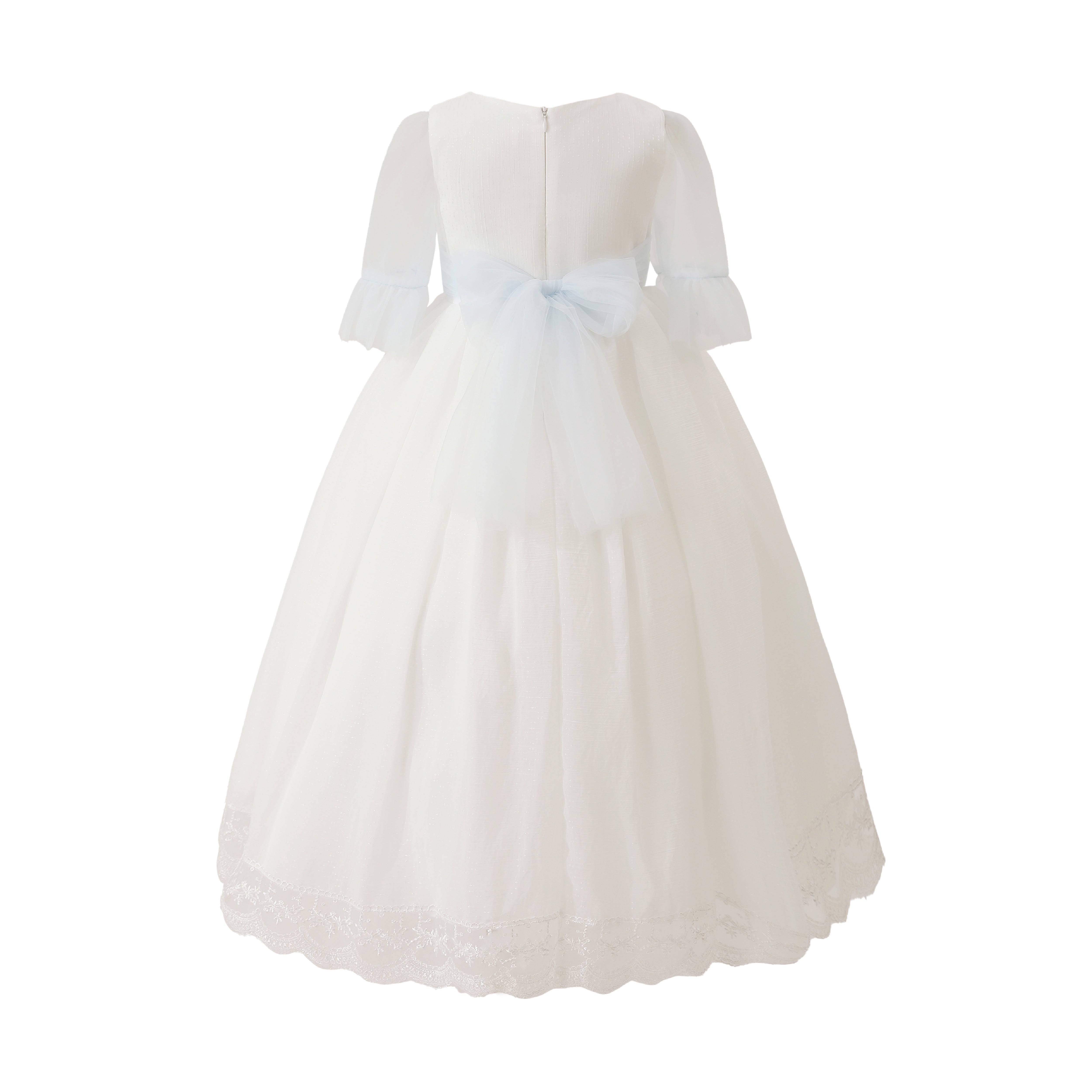 A timeless ceremonial dress crafted with elegance, featuring delicate lace details and graceful sleeve design. Perfect for weddings, communions, or formal celebrations.