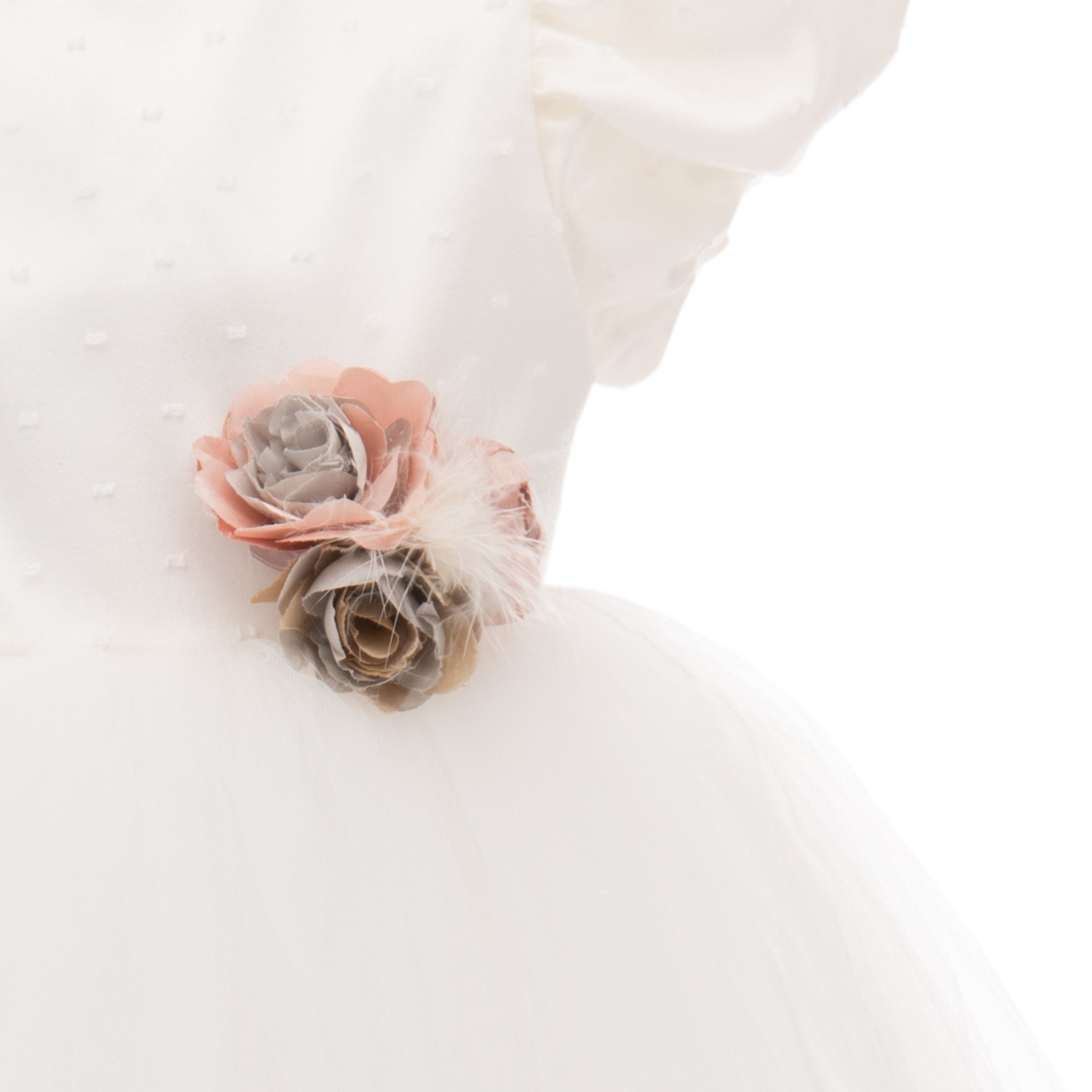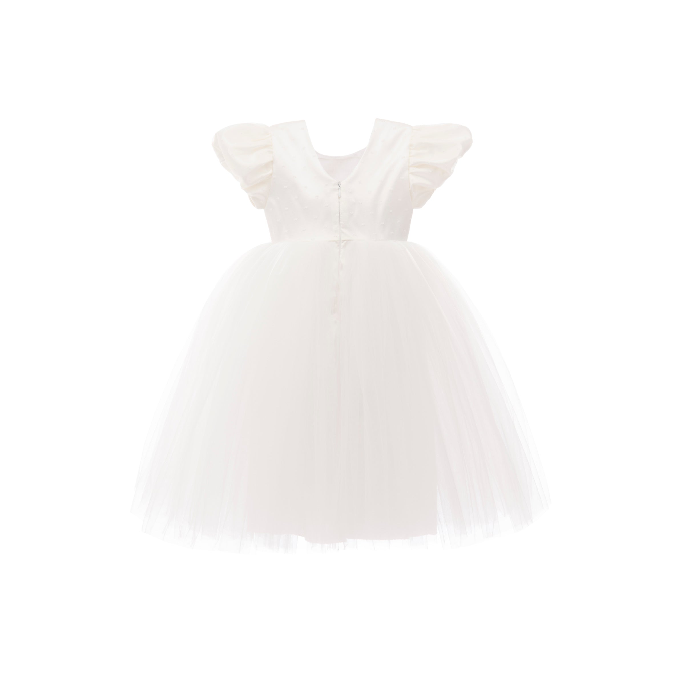 This white high-waist dress features a floral white embellishment perfectly around the waist, complemented with a clean hem around the neckline, ruffled short sleeves and flowing white skirt below.