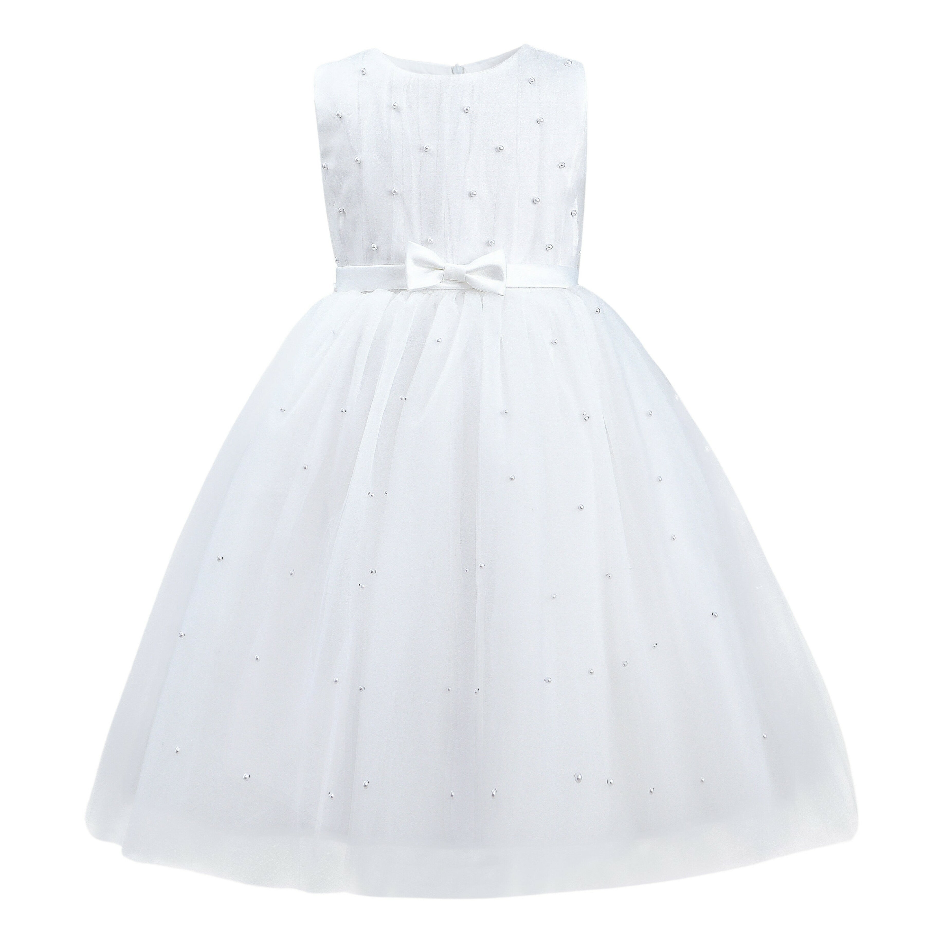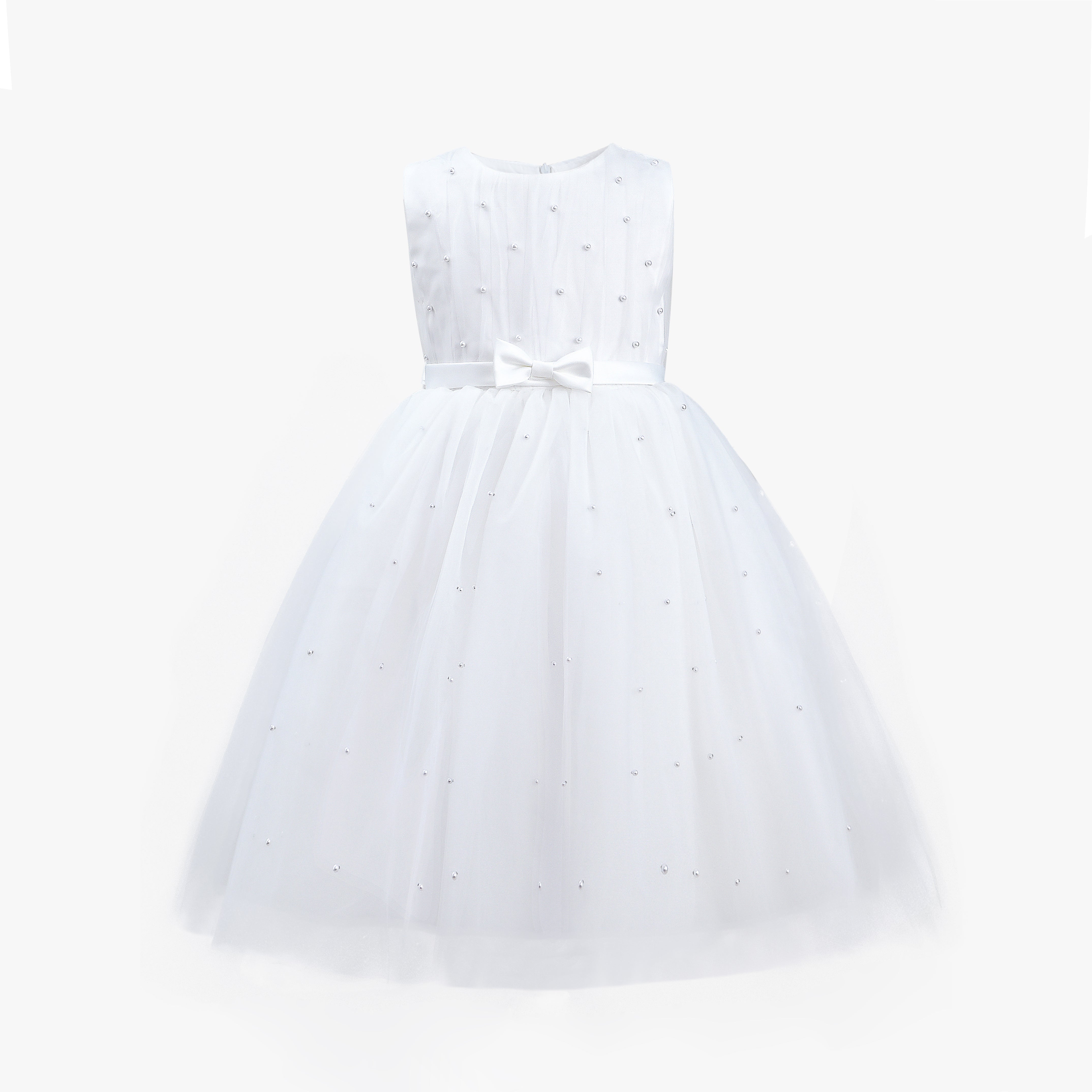Designed to be dry cleaned only, this dress maintains its quality and pristine appearance over time. Overall, the White Pearl Bow Tulle Dress combines elegance, comfort, and playful design elements, making it a perfect addition to any young girl's wardrobe. This dress ensures your child looks and feels special at any event.