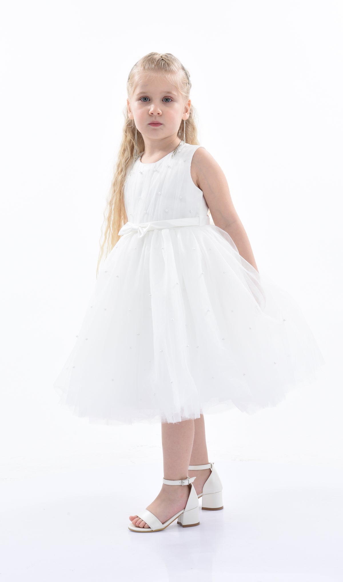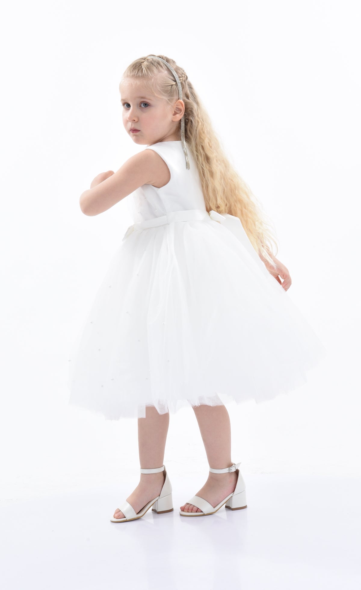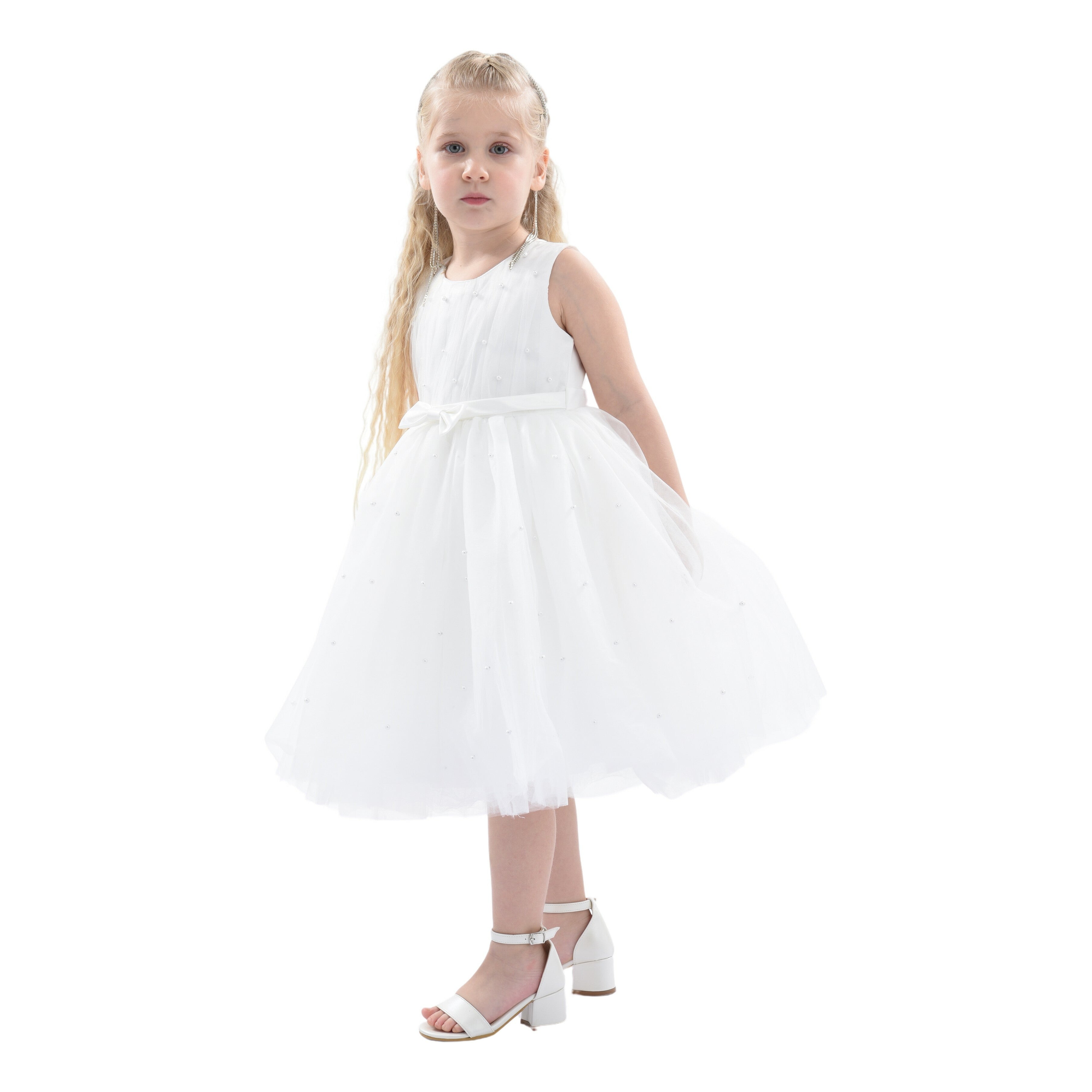 The White Pearl Bow Tulle Dress for kid and baby girls from Tulleen is a charming and playful choice for any special occasion. This dress features a sleeveless design that ensures comfort and ease of movement, making it perfect for active young girls.