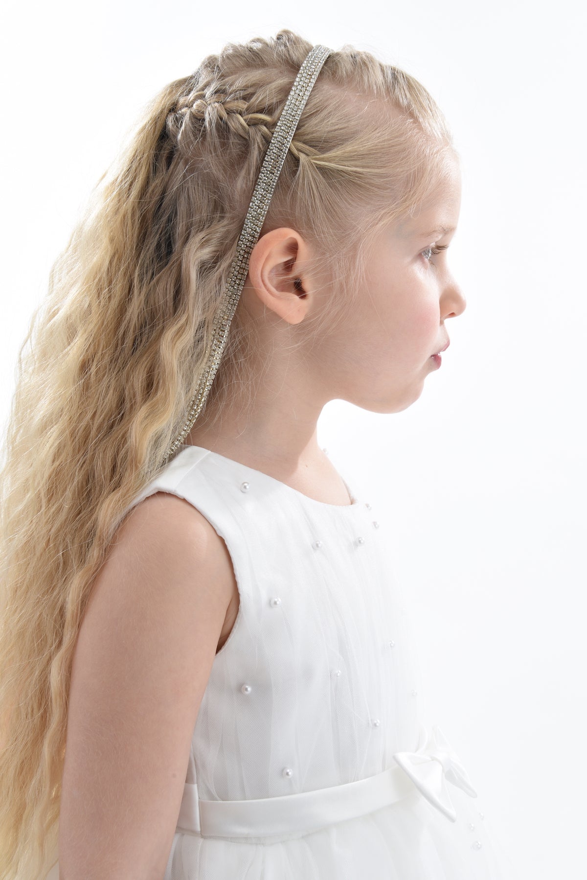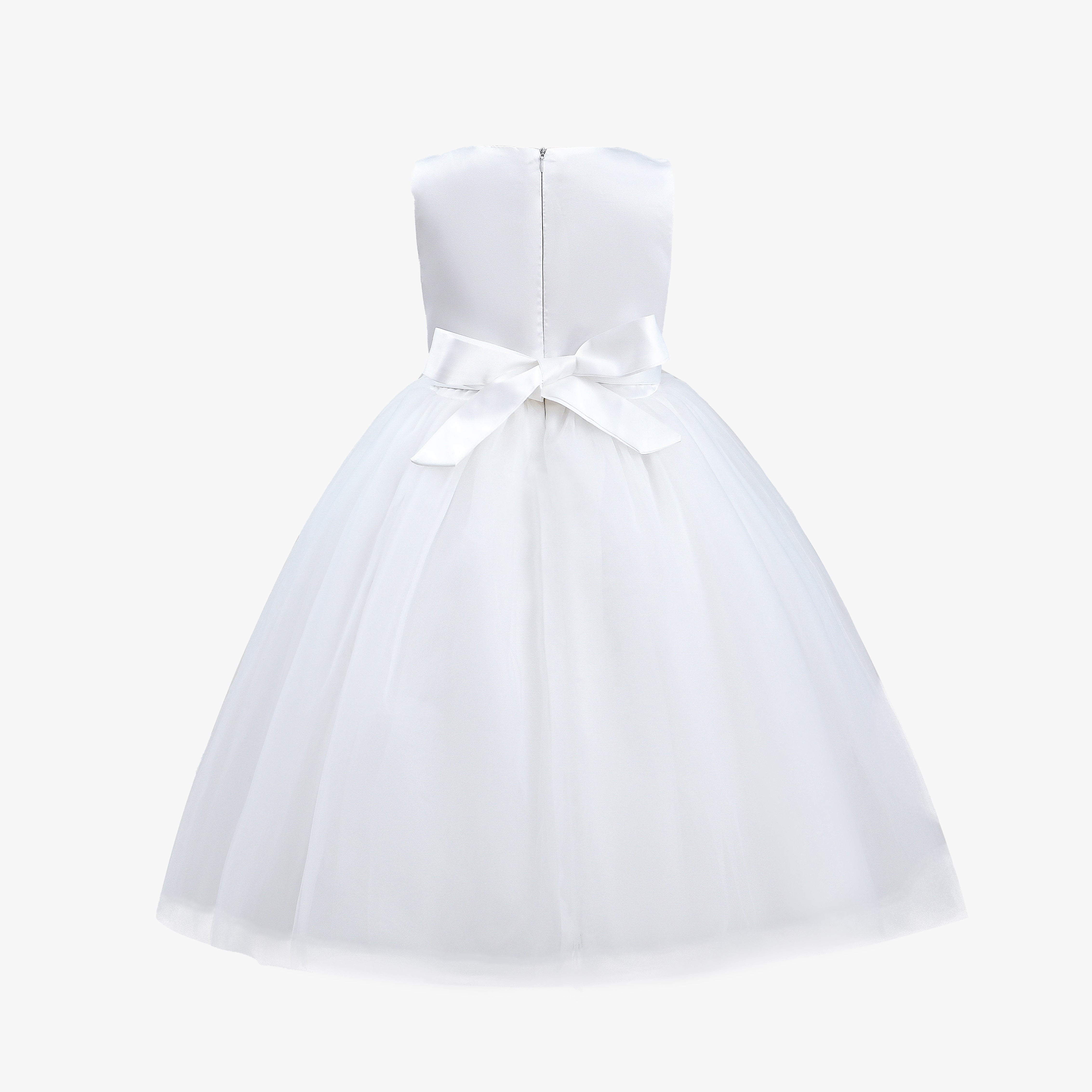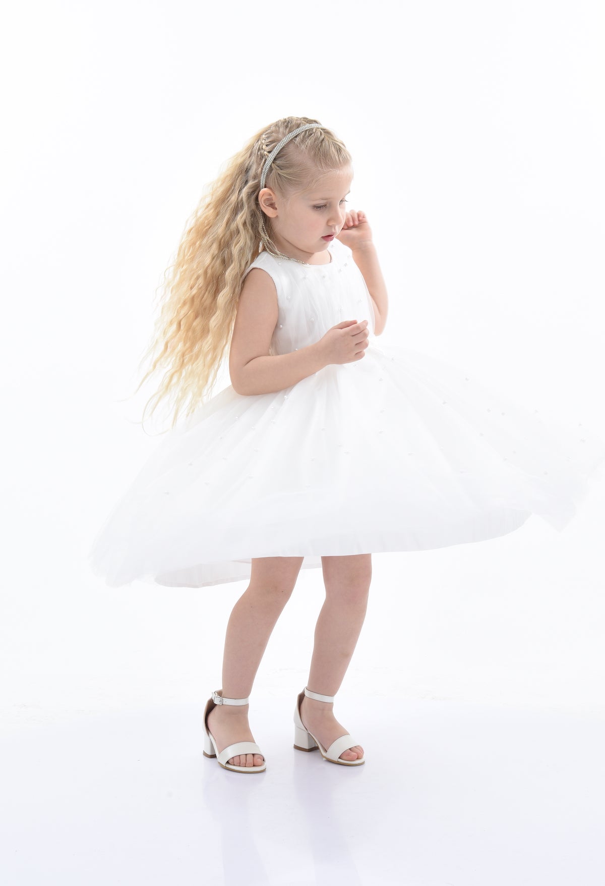 The White Pearl Bow Tulle Dress for kid and baby girls from Tulleen is a charming and playful choice for any special occasion. This dress features a sleeveless design that ensures comfort and ease of movement, making it perfect for active young girls.