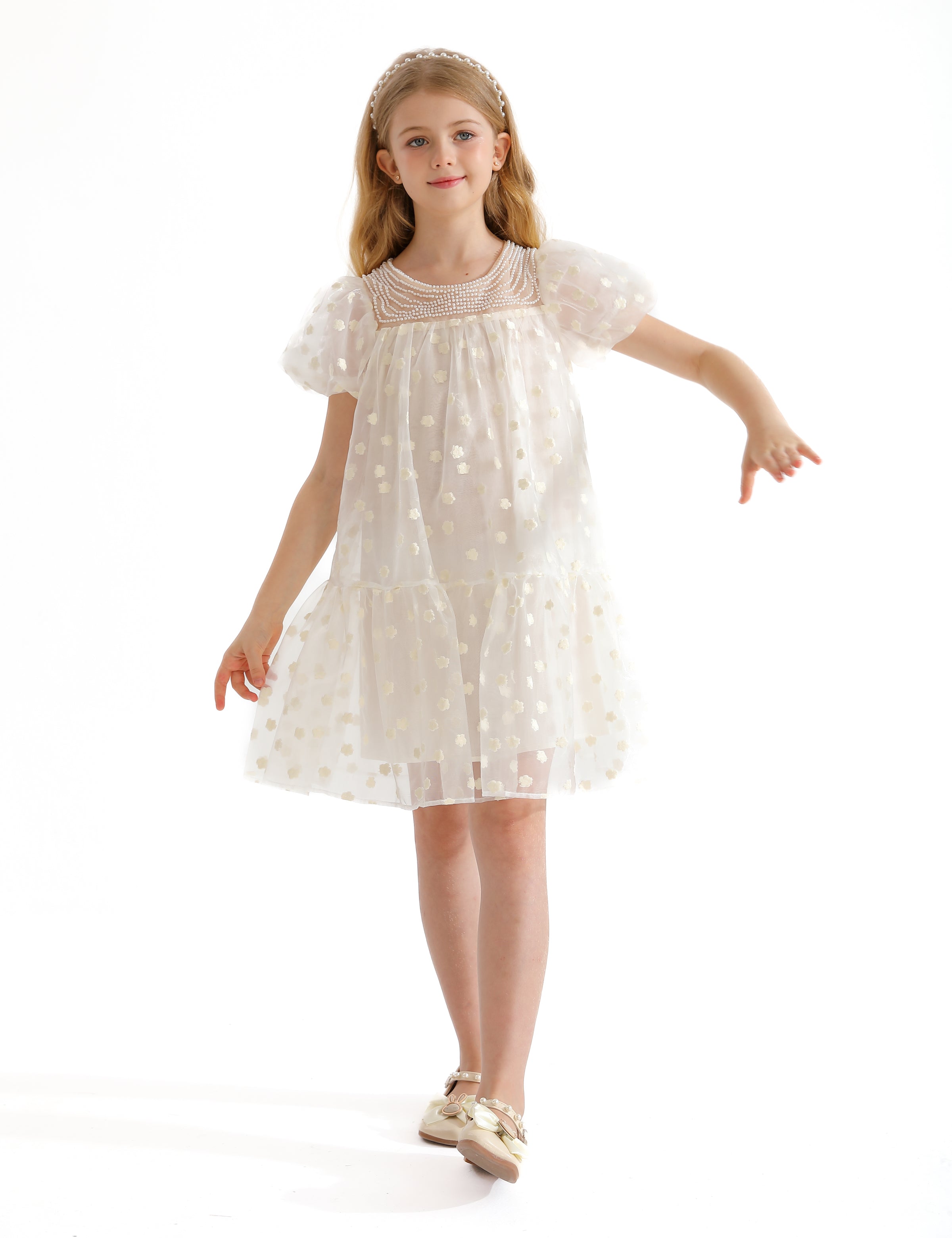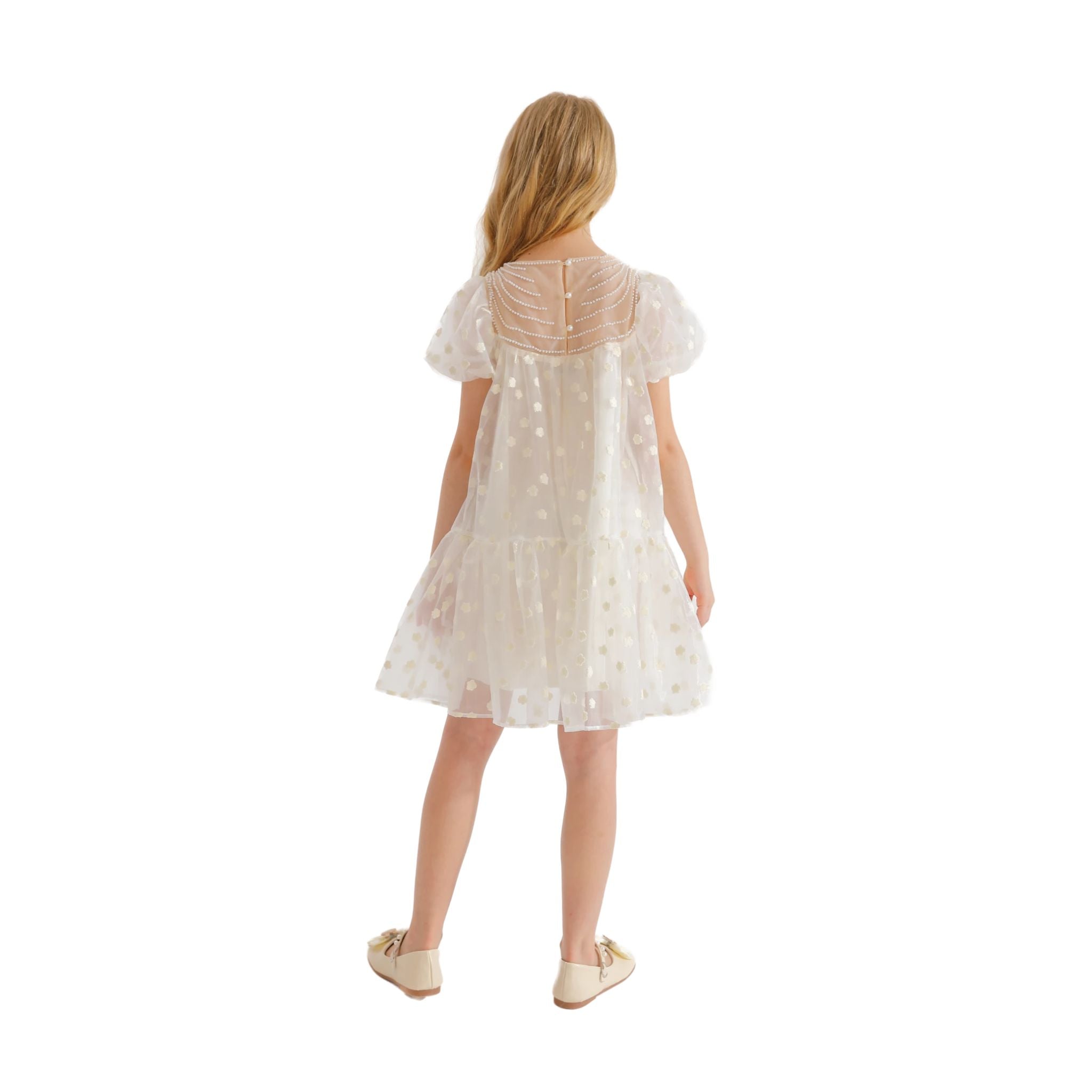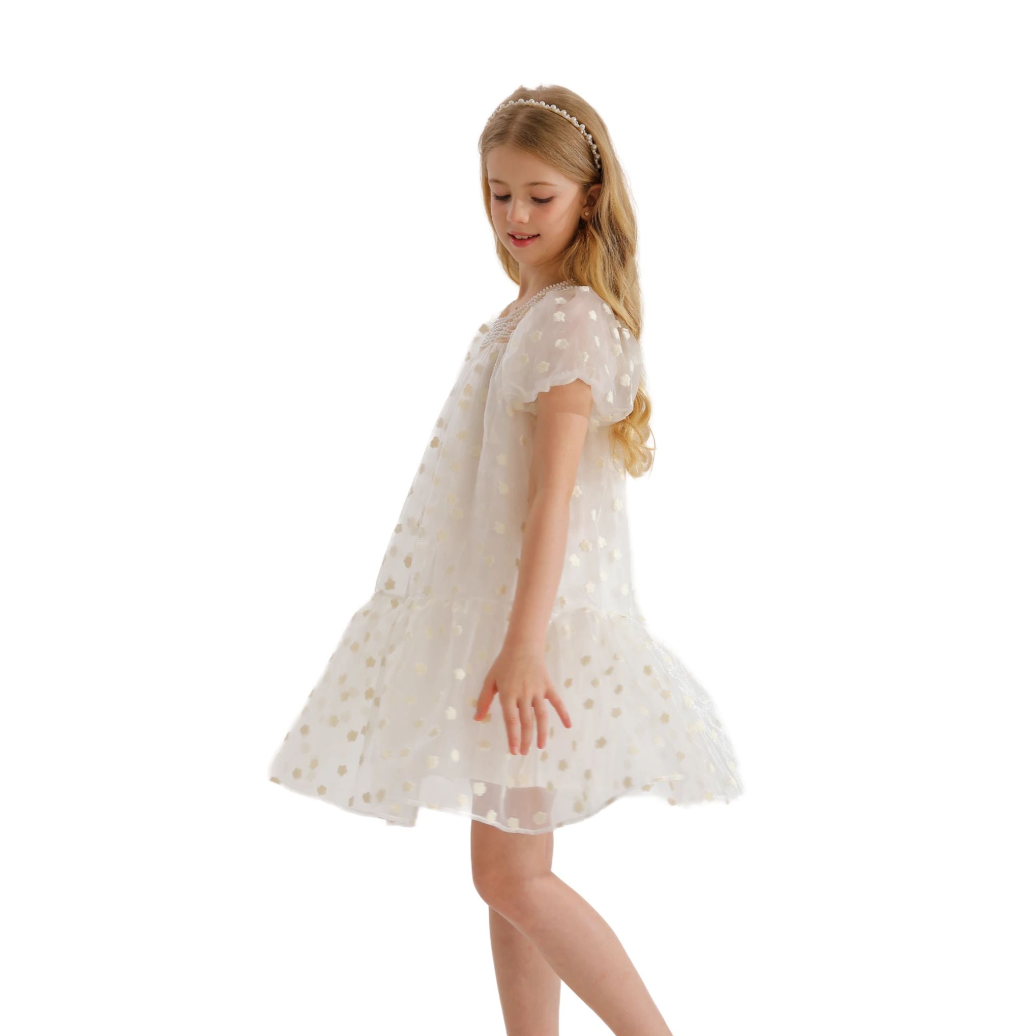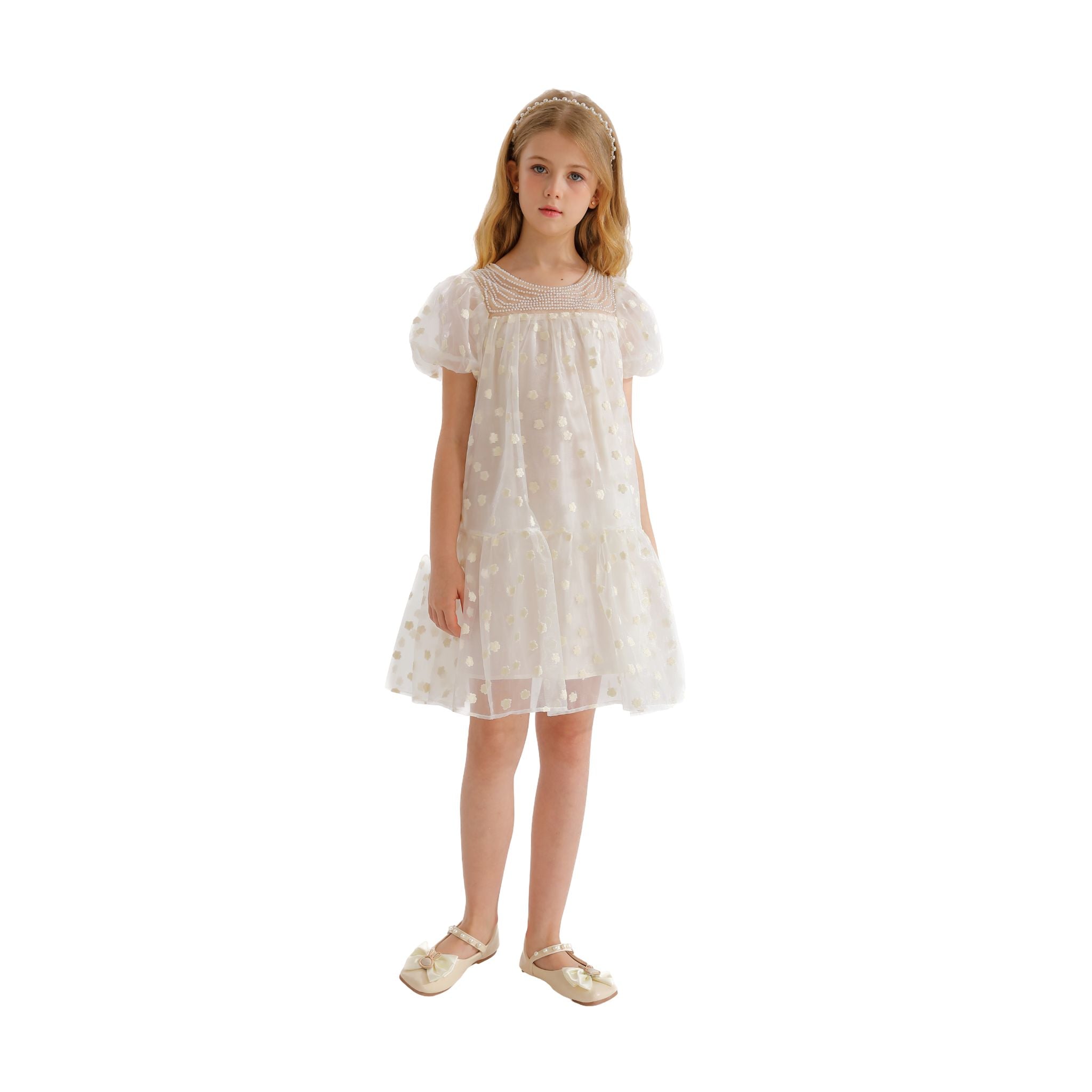 The White Perivale Floral Print Teacup Overlay Dress for kid girls from Tulleen is a delightful and elegant choice for any special occasion. This dress features an all-over floral polka dot print that adds a playful and charming touch.