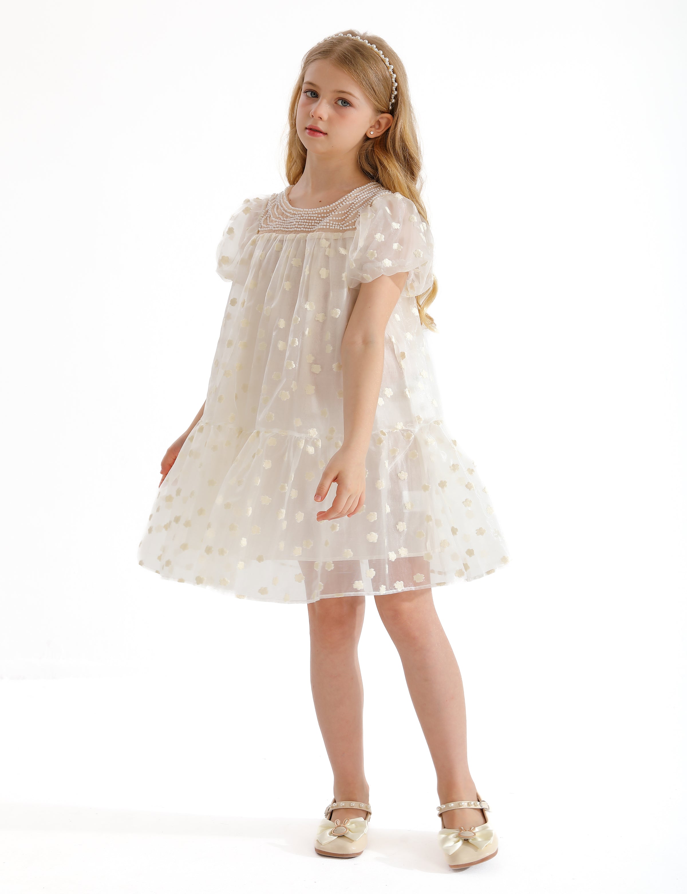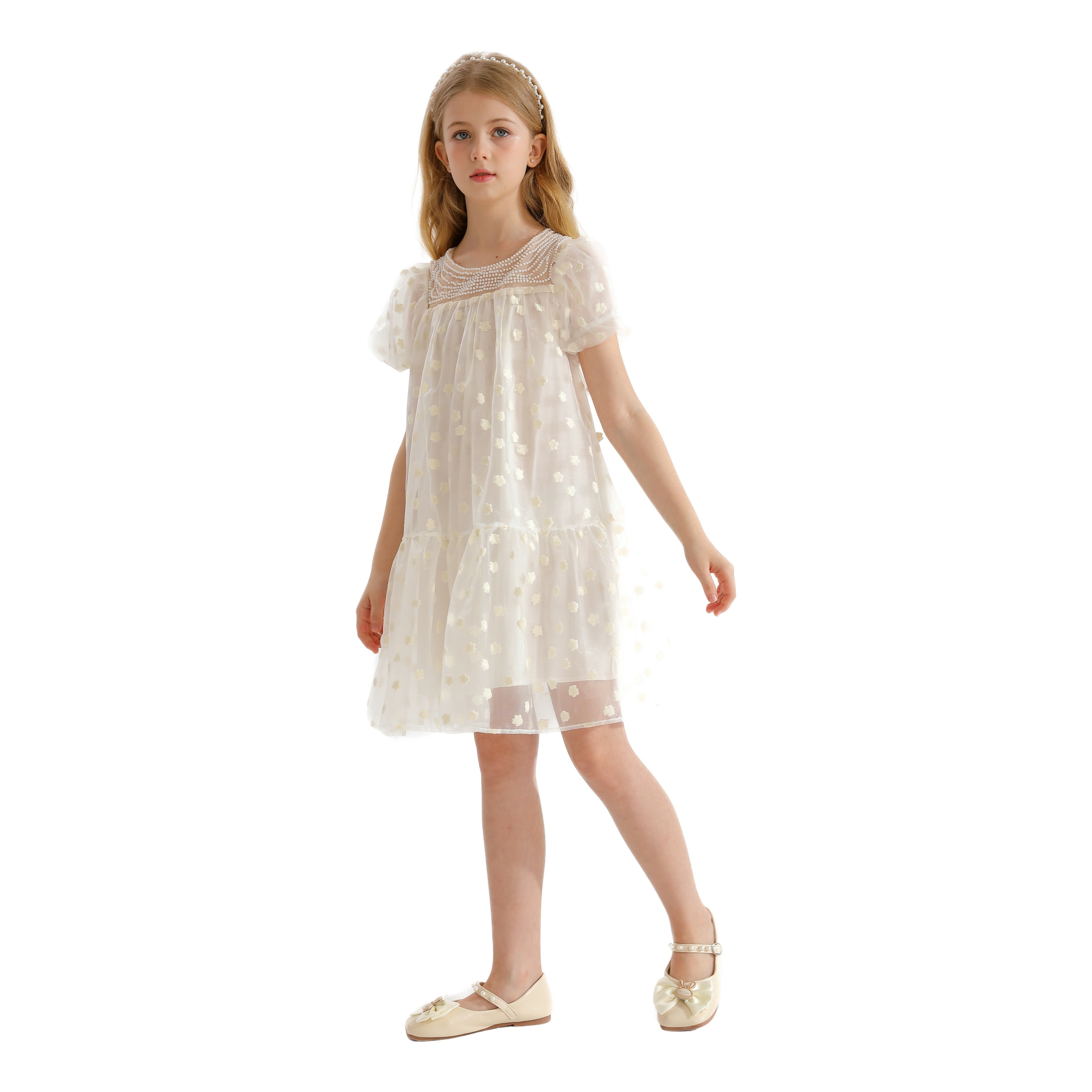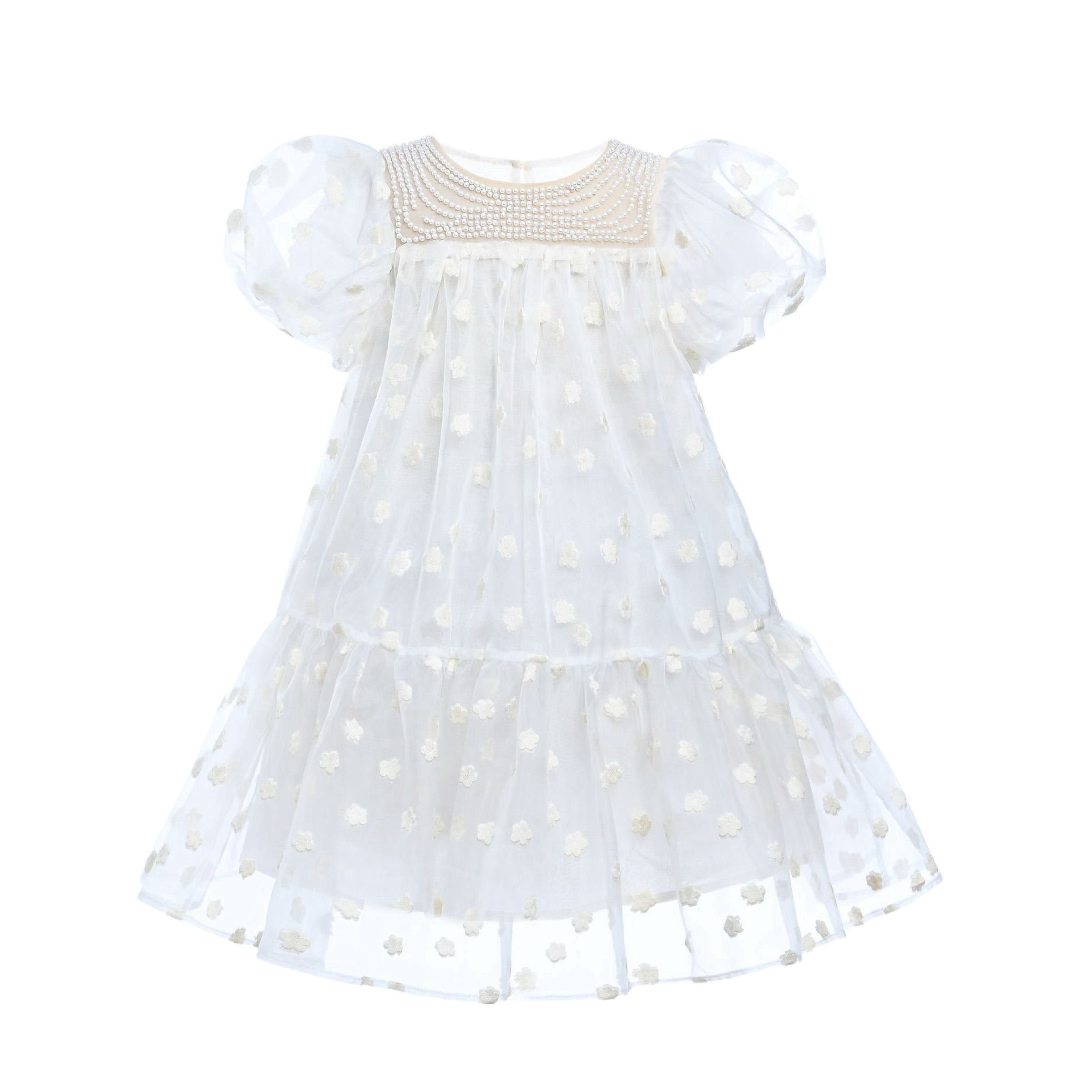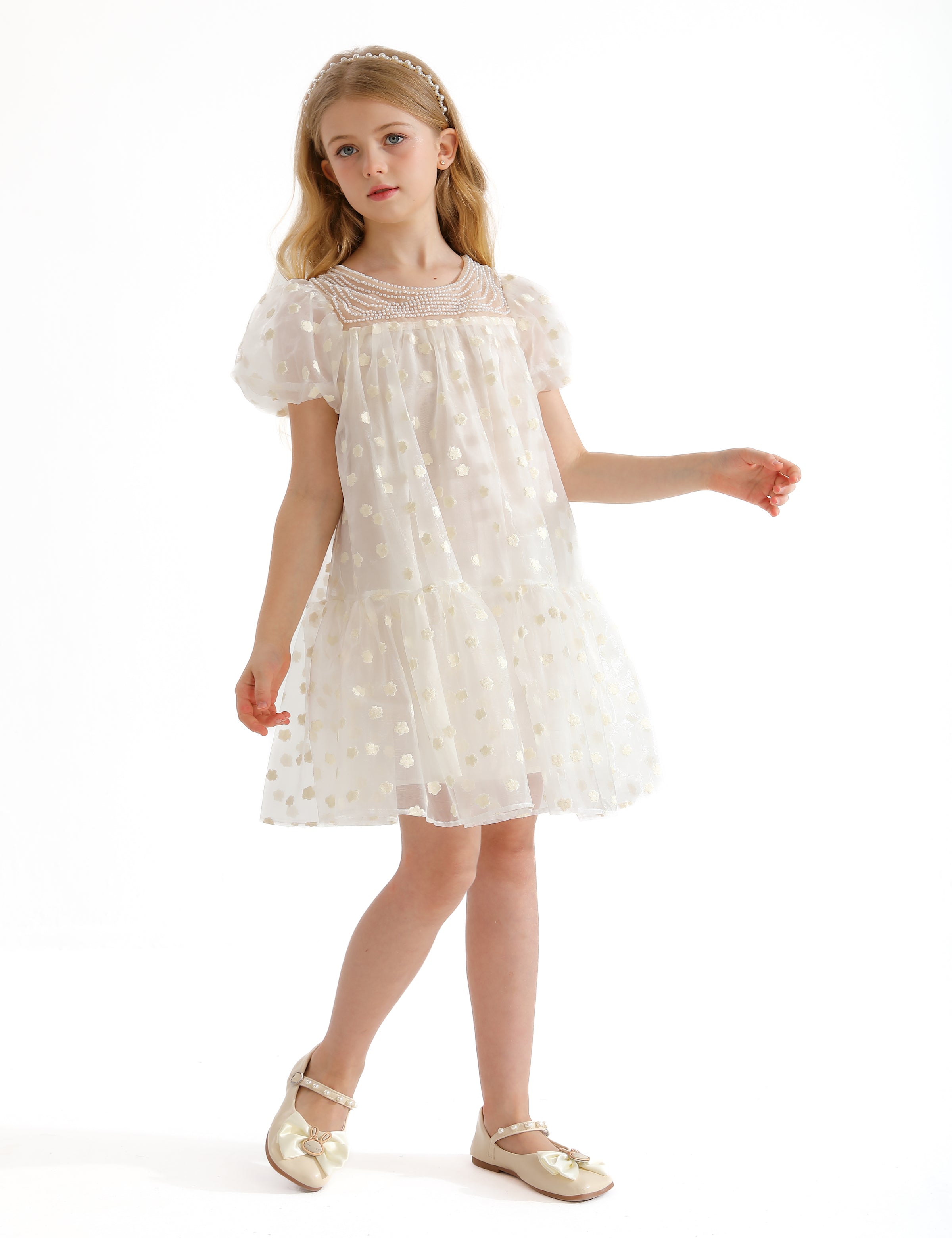 The White Perivale Floral Print Teacup Overlay Dress for kid girls from Tulleen is a delightful and elegant choice for any special occasion. This dress features an all-over floral polka dot print that adds a playful and charming touch.