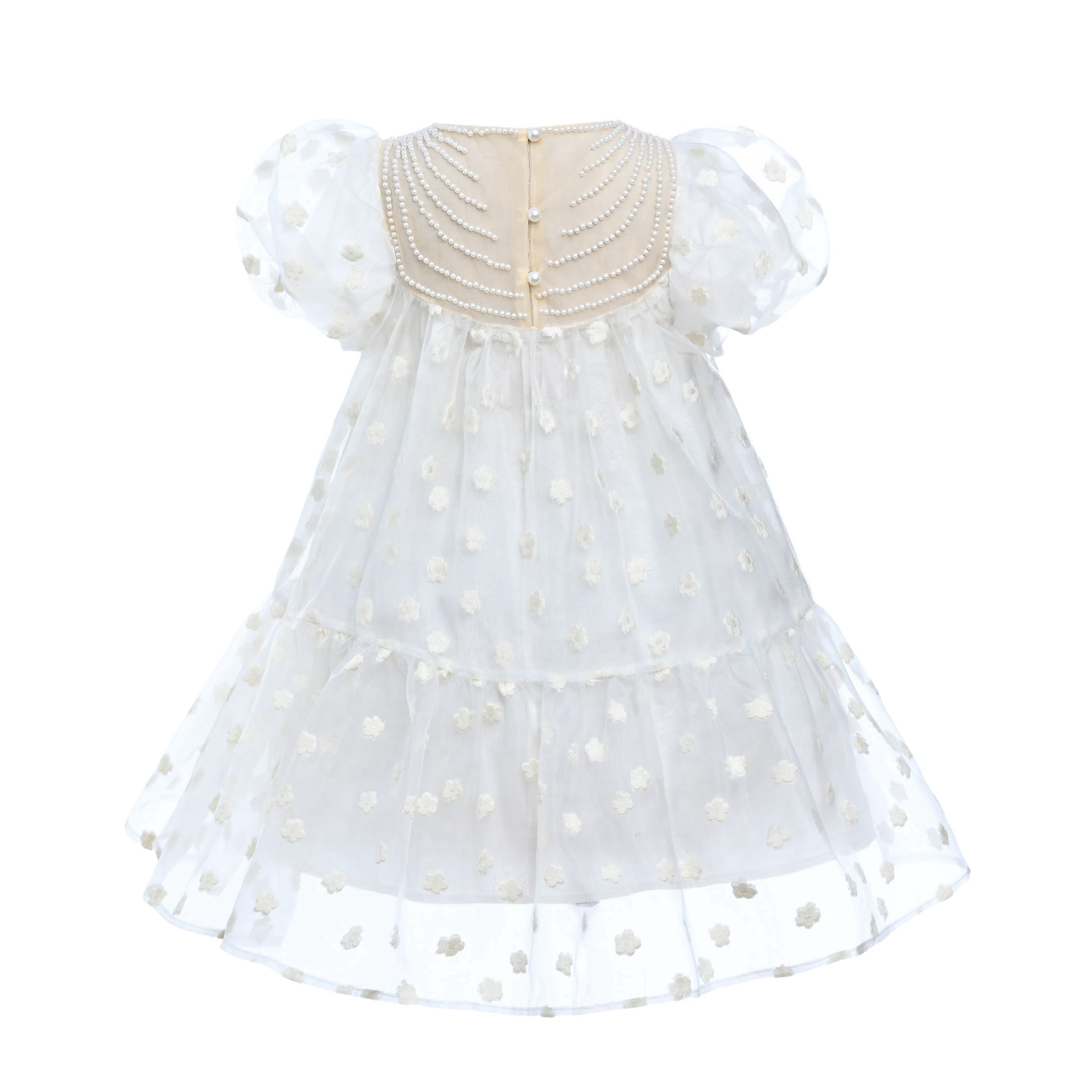 Additionally, the large teacup puff shoulders enhance the dress's whimsical appeal, making it stand out. The round neck with a beige upper bodice and pearl design around the shoulders adds a sophisticated and refined detail.