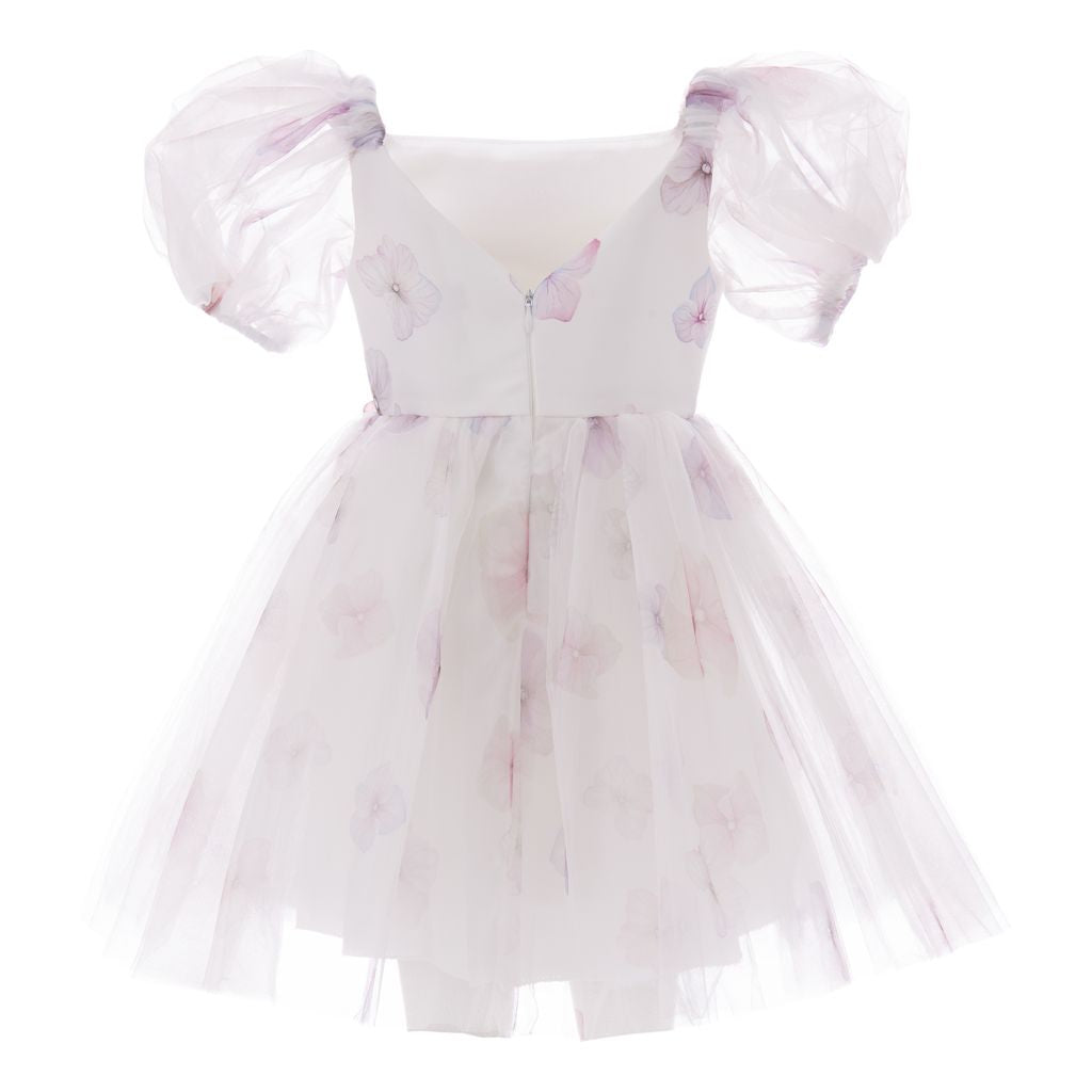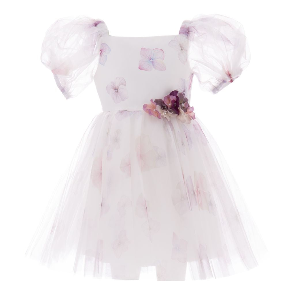 The White Plazoleta Floral Print Puff Shoulder Dress for kid girls from Tulleen is a charming and visually striking garment, perfect for special events. This dress features a vibrant pink floral design set against a crisp white backdrop, offering a fresh and appealing look. The floral bouquet at the hem adds a delightful touch of detail, enhancing the dress's visual appeal.