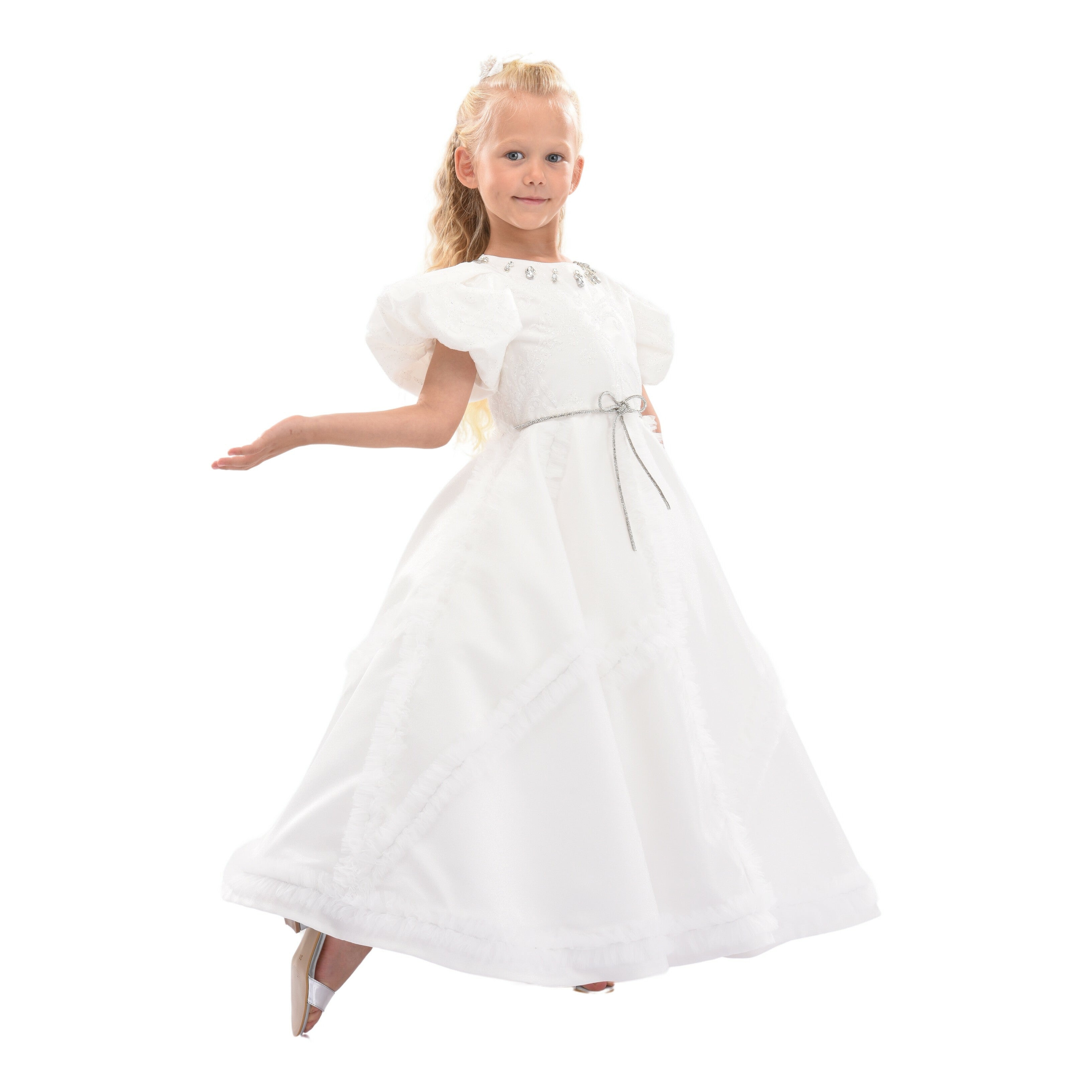 Moreover, the dress features satin puff shoulders, providing a luxurious feel and a regal aura. The neckline is embellished with a dazzling gem design, enhancing the dress's overall charm. Additionally, a silver glitter belt with elegant loops cinches the waistline, providing an elegant silhouette. Made from 100% polyester with a lining of 65% cotton and 35% polyester, this dress ensures both durability and comfort.