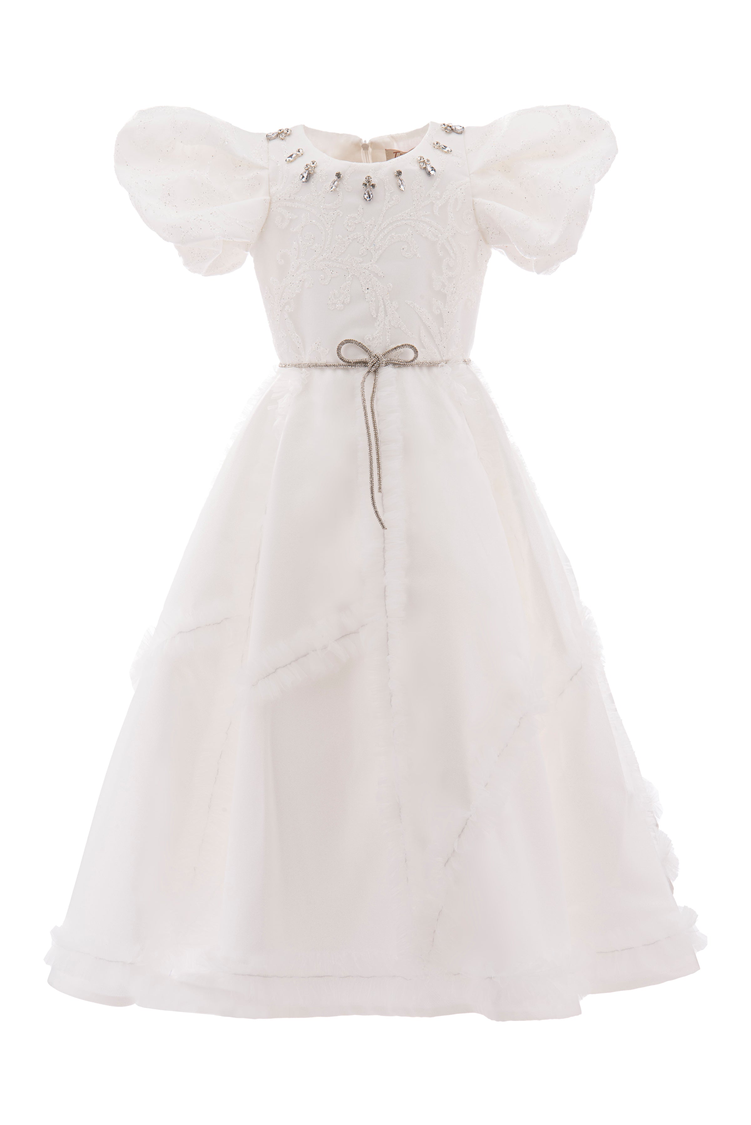 The White Raineri Gem Shimmer Overlay Dress for kid girls from Tulleen exudes sophistication and charm, perfect for any special occasion. The focal point of this dress is its immaculate white bodice, adorned with exquisite floral embroidery. Delicate blooms intertwine, creating a whimsical pattern that adds elegance to the dress.