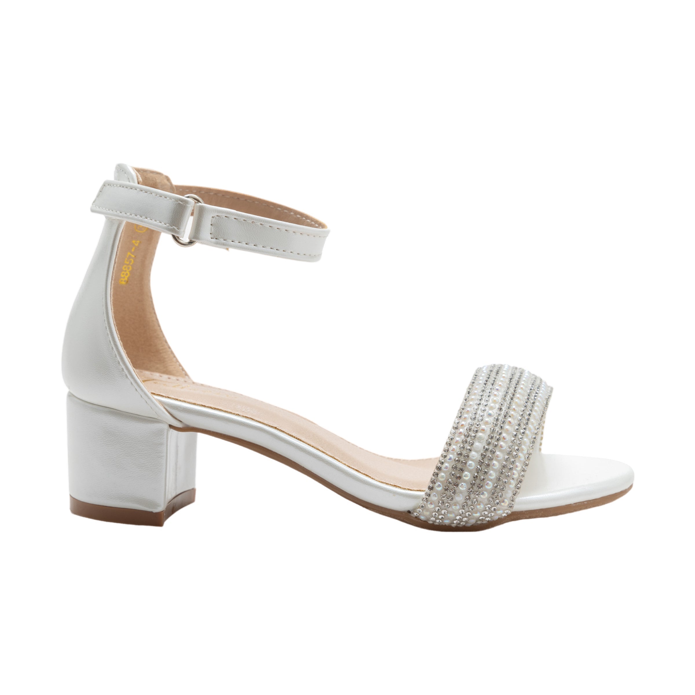 Introducing the White Rhinestone Band Block Heels by Tulleen, designed to dazzle with their pearl white metallic finish and sparkling rhinestone band. These heels feature a radiant pearl shine that adds a touch of elegance to any outfit, making them perfect for little girls who love to shine.