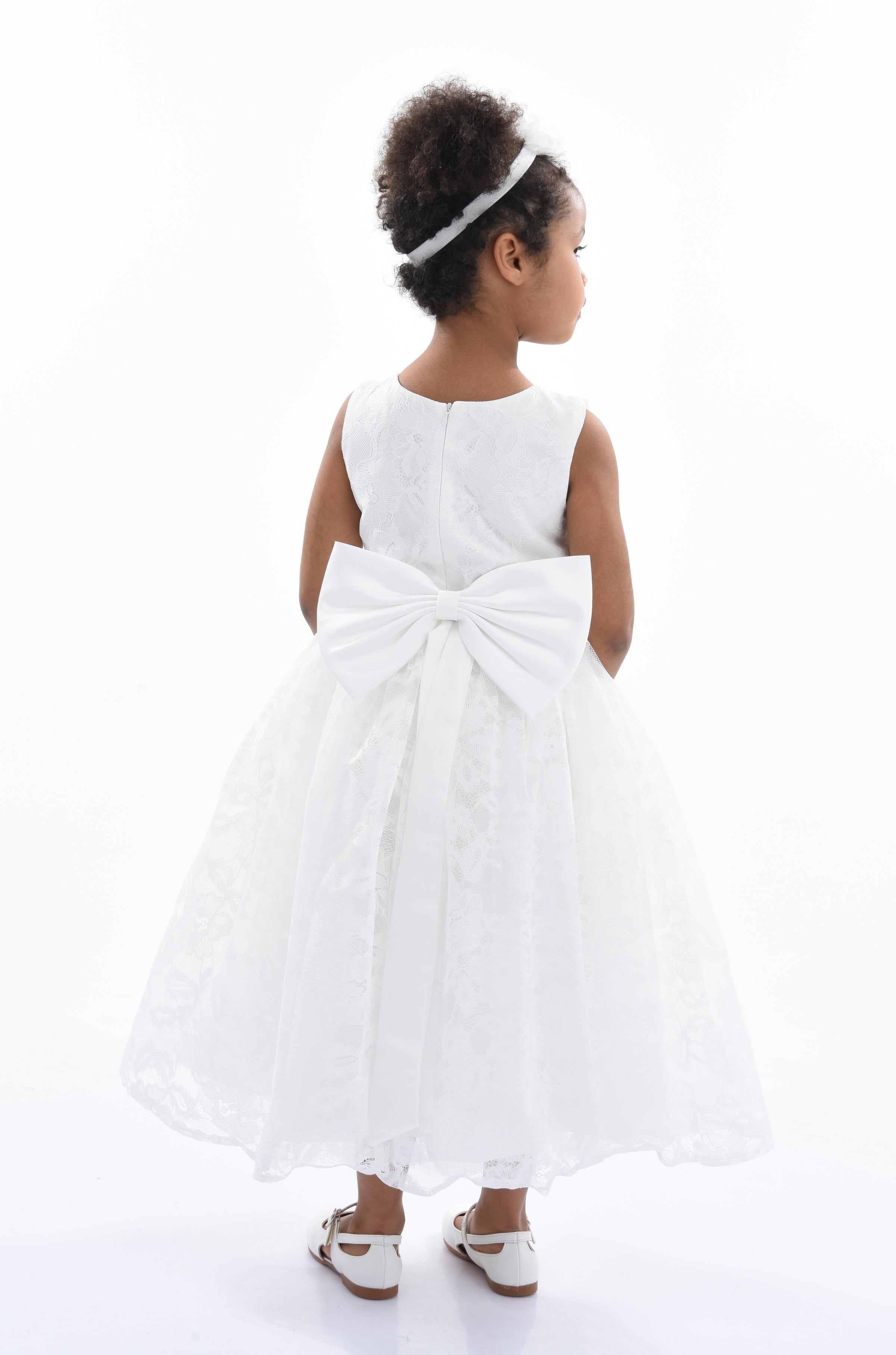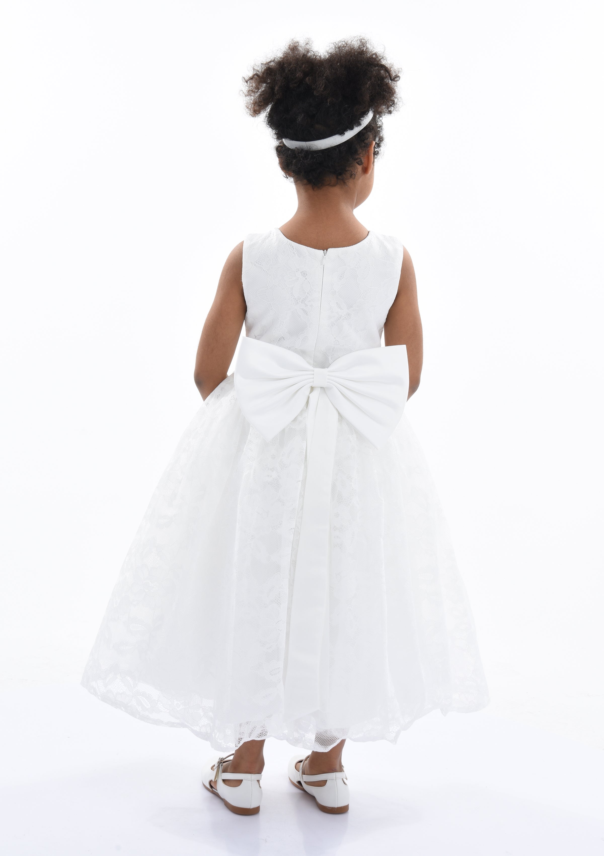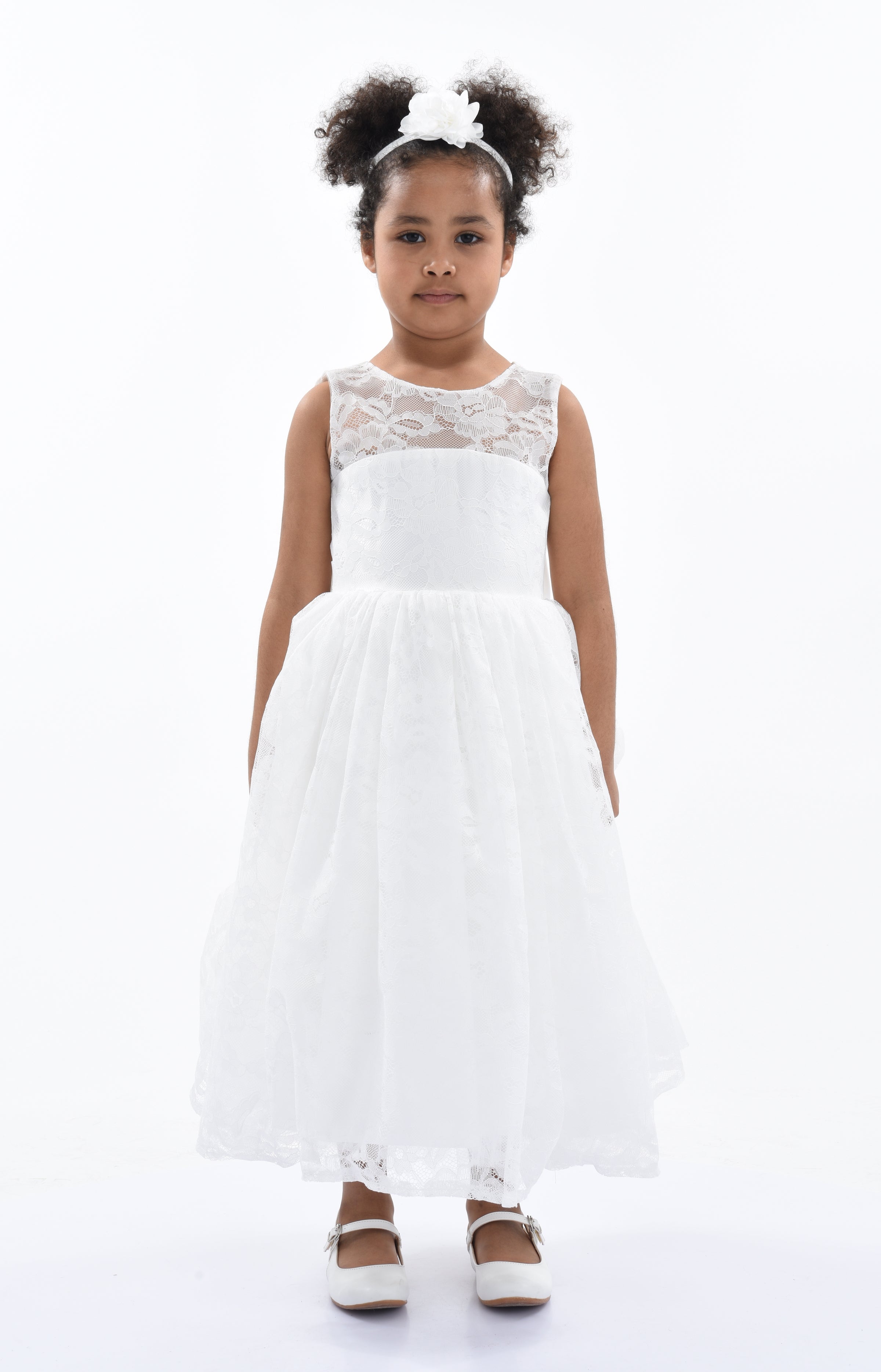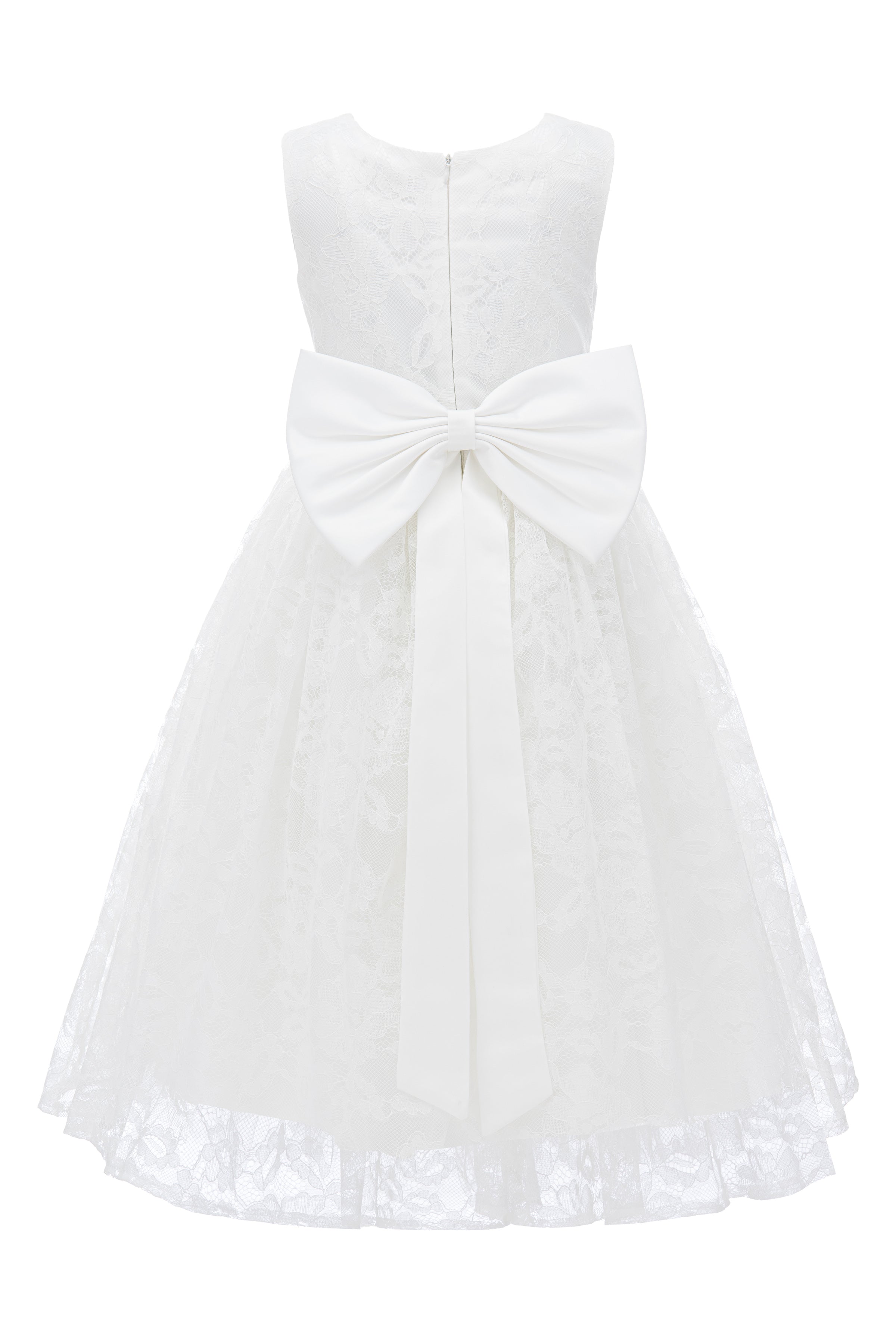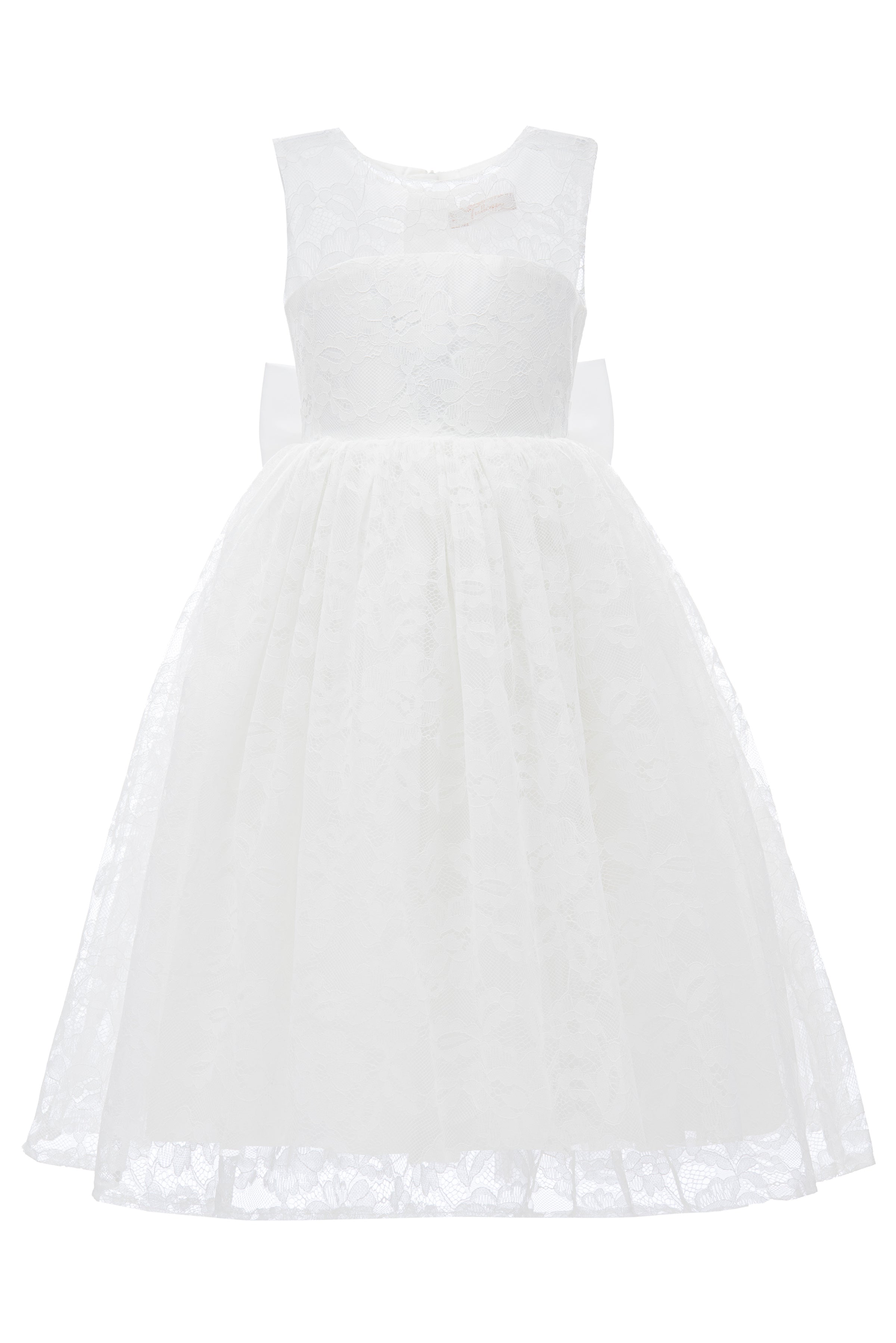The White Rossemere Lace Embroidered Tulle Dress for kid girls from Tulleen is a stunning choice for any special occasion. The U-shaped bodice features intricate white lace embroidery, adding timeless beauty. The dress comes with a satin belt that ties elegantly in the back, adding a touch of shine.