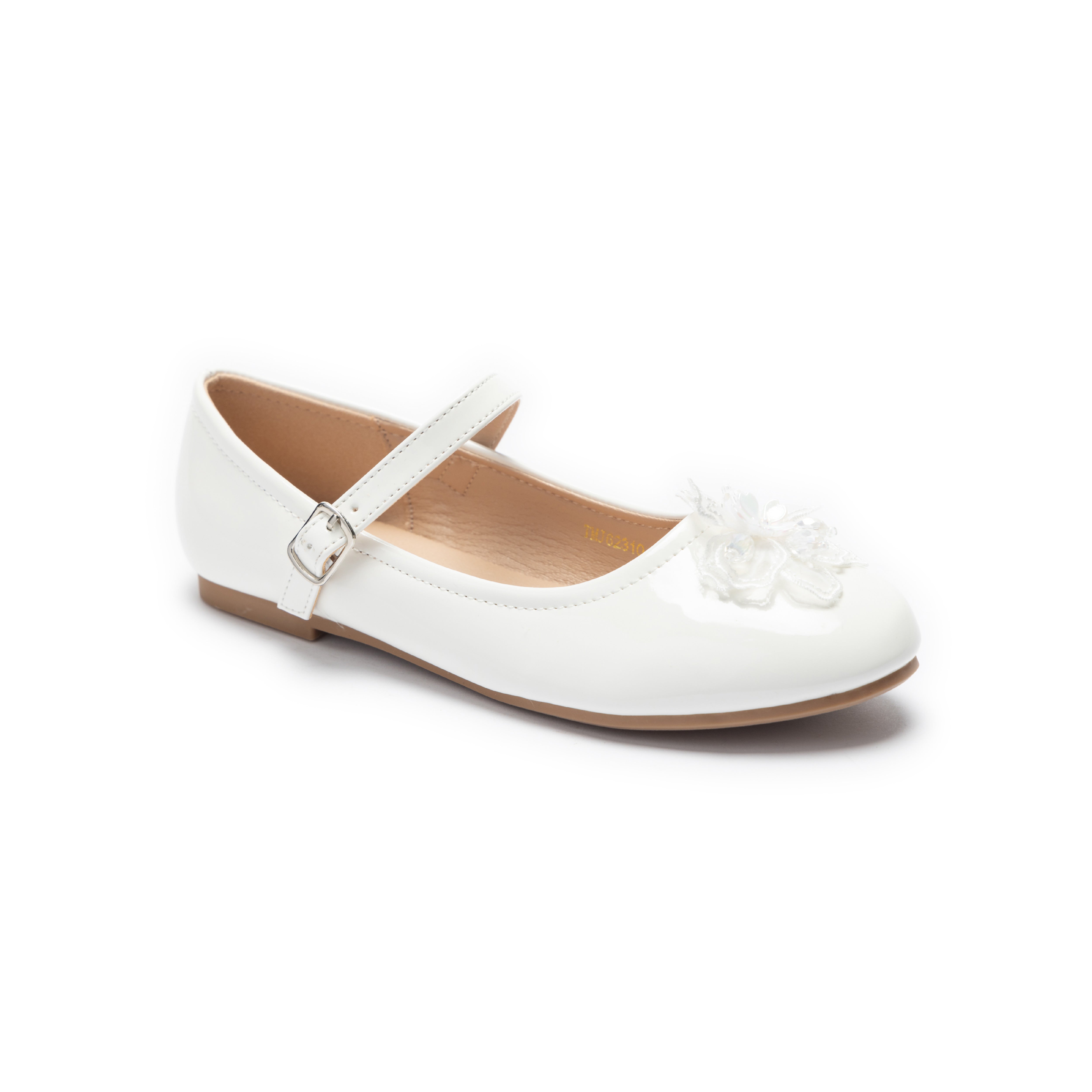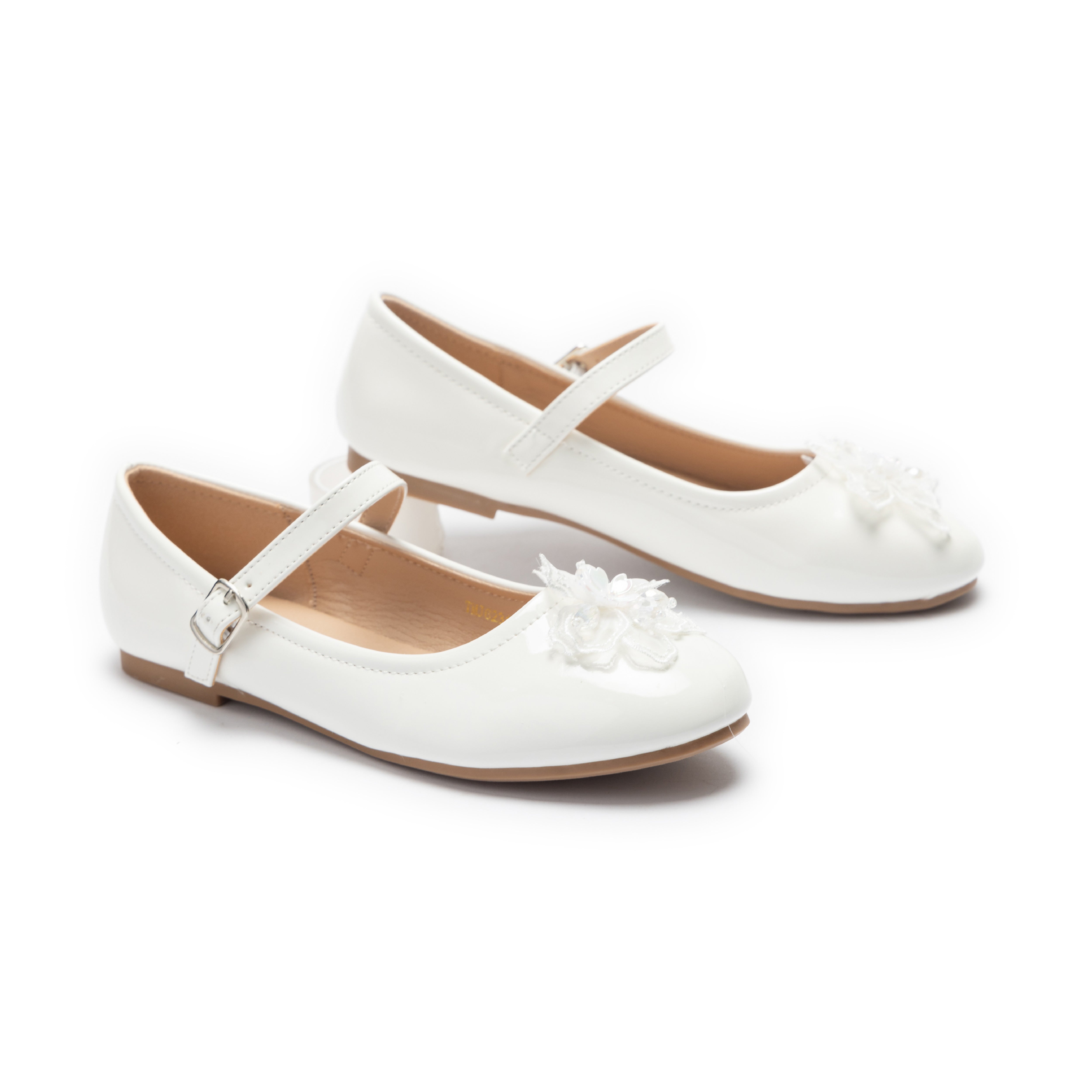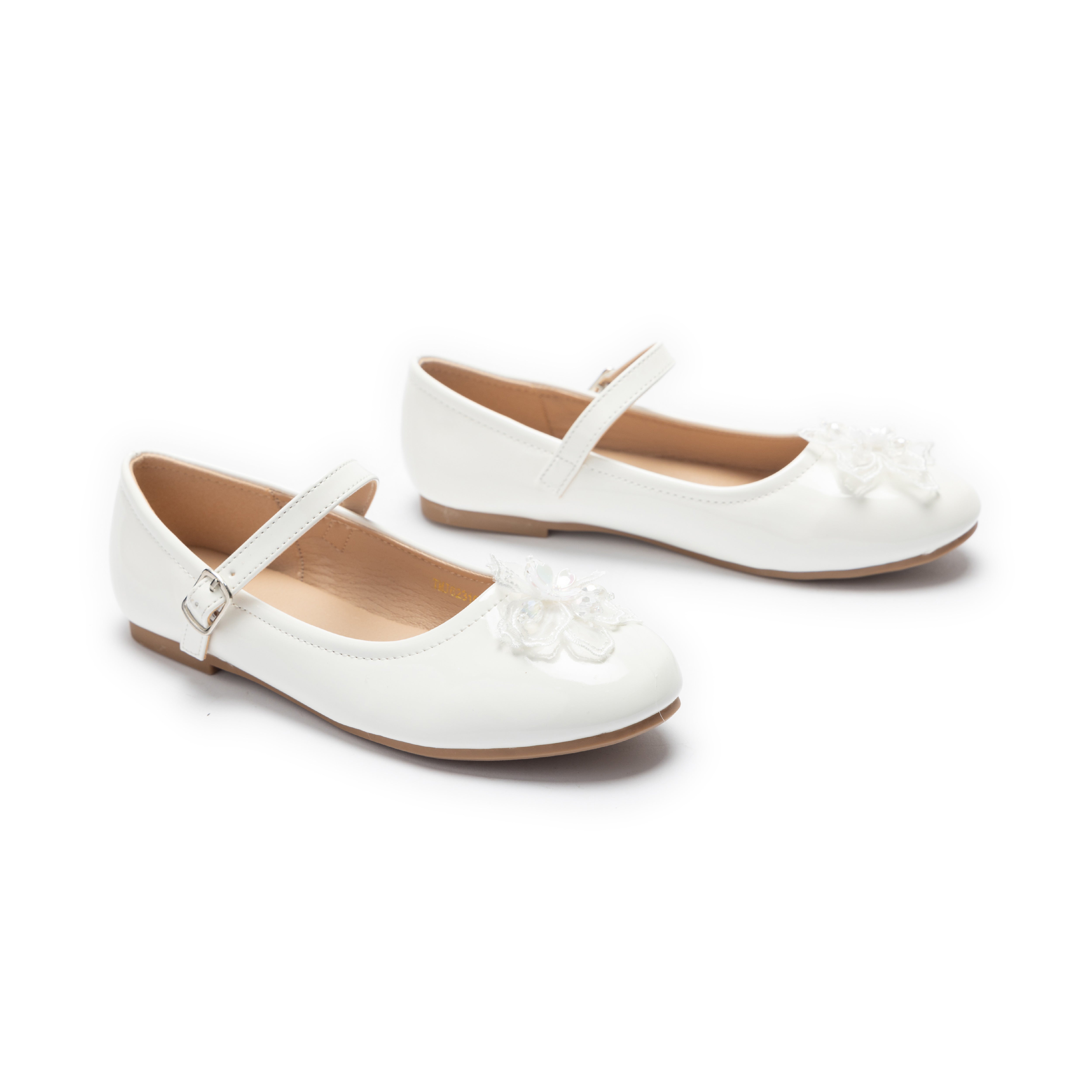 The Selene shoes combine timeless charm with a glossy finish, rounded toe, and floral embellishments at the front. Their secure buckle strap and soft lining make them both elegant and comfortable for special occasions.