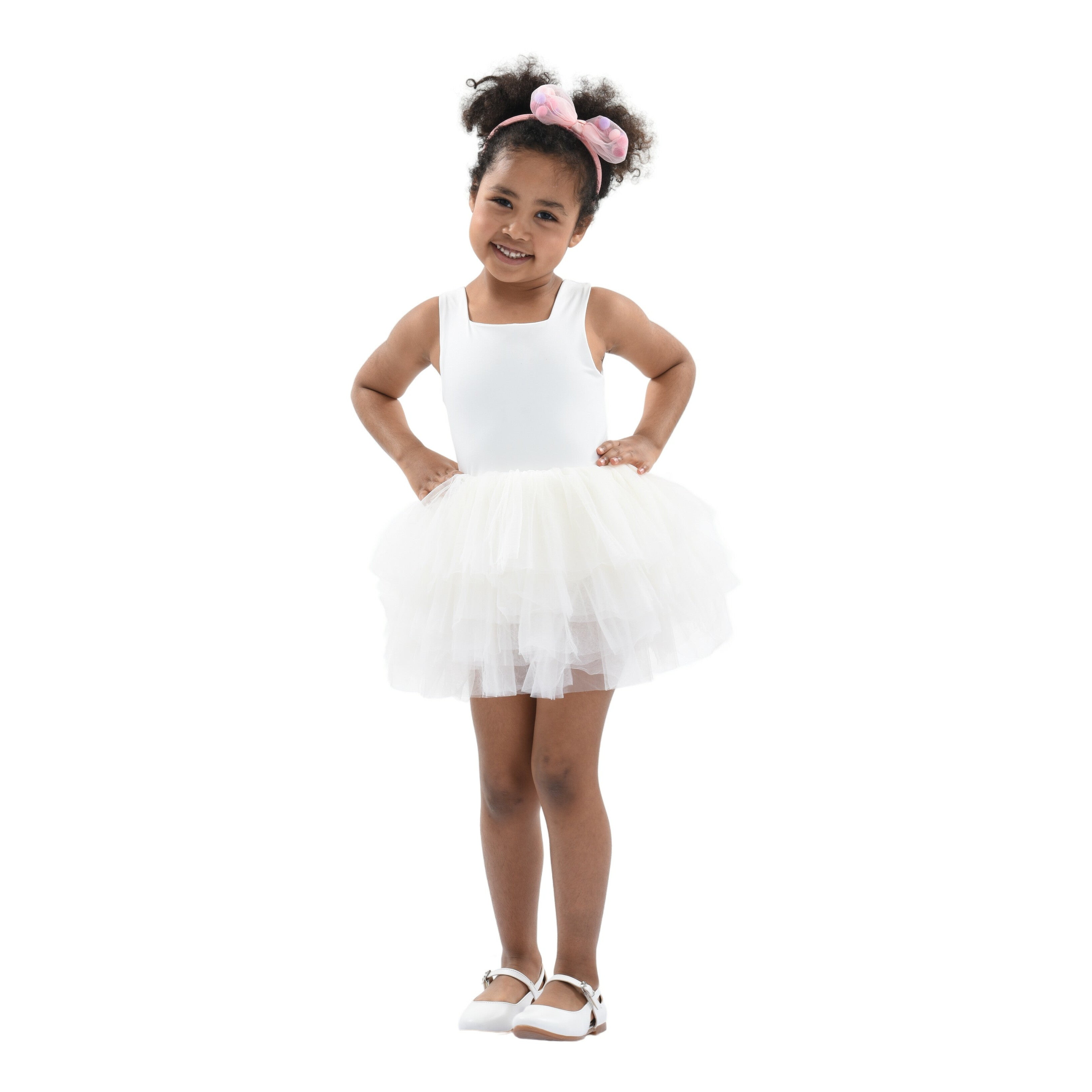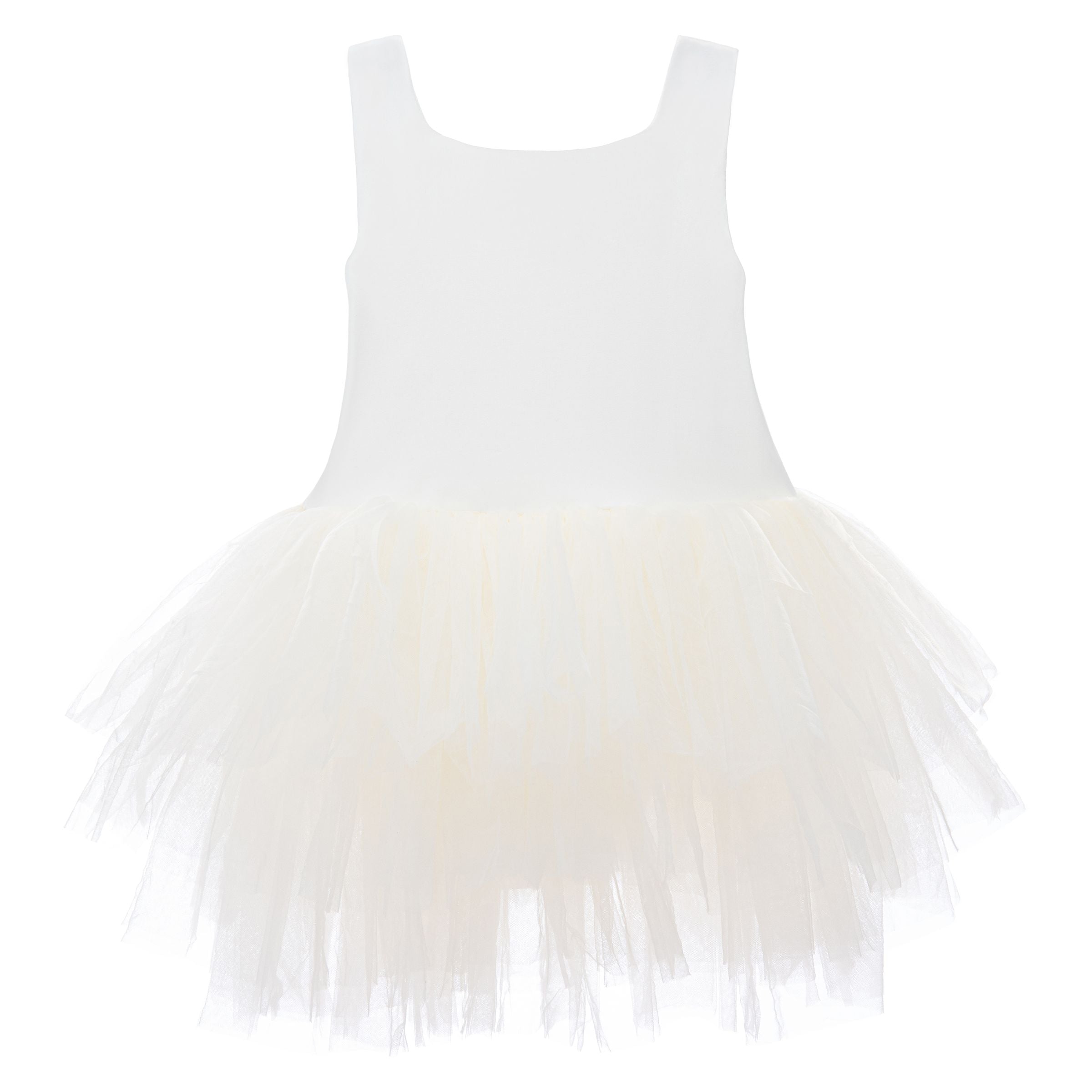 The White Solid Tutu Dress from Mimi Tutu is an enchanting outfit for baby girls. This adorable dress features thin sleeves and a square neck, offering a timeless and sophisticated look. The multiple layers of lightweight lush tulle create a voluminous and airy skirt, perfect for twirling and dancing. The navy tulle underlay adds a touch of contrast, enhancing the dress's overall elegance.