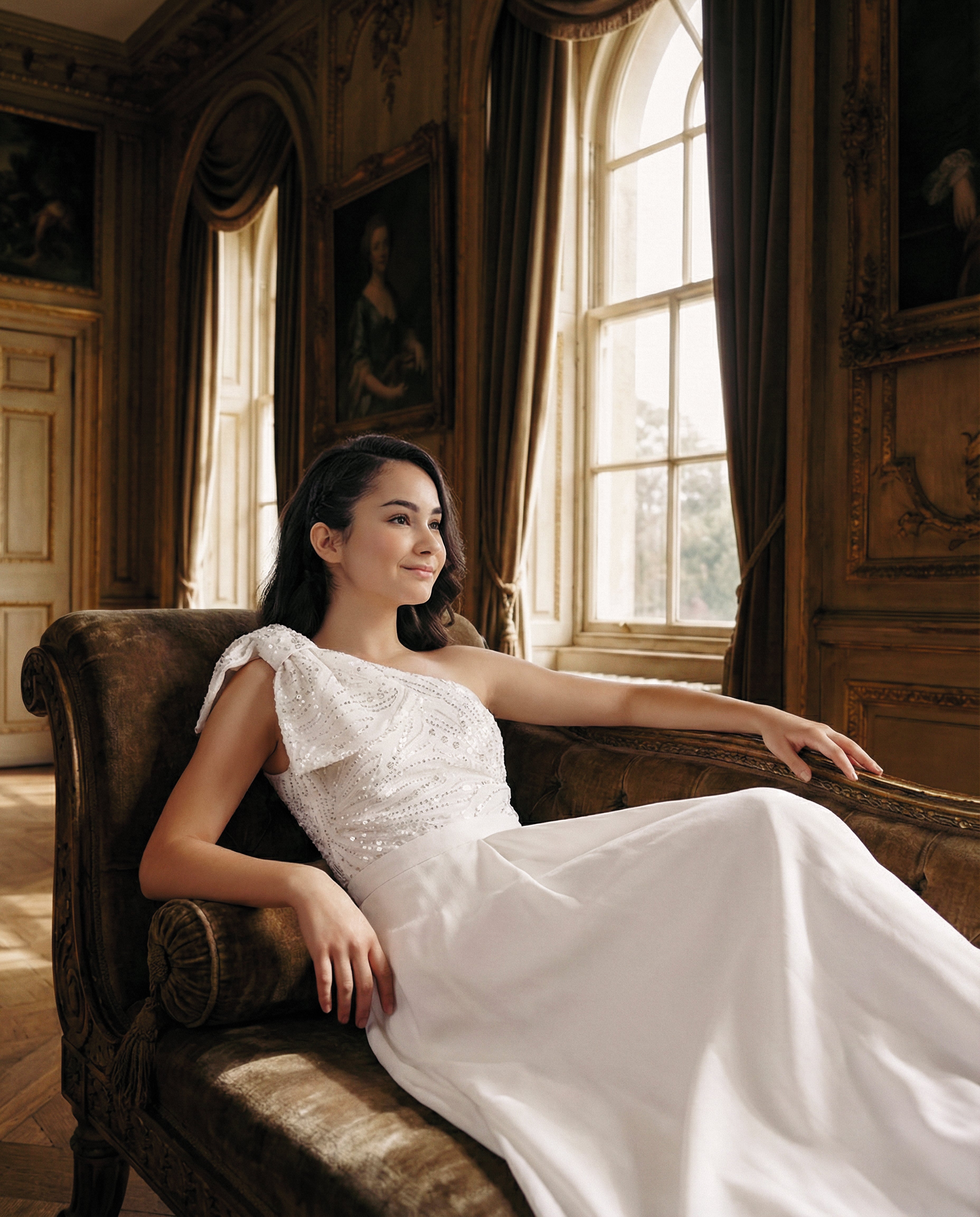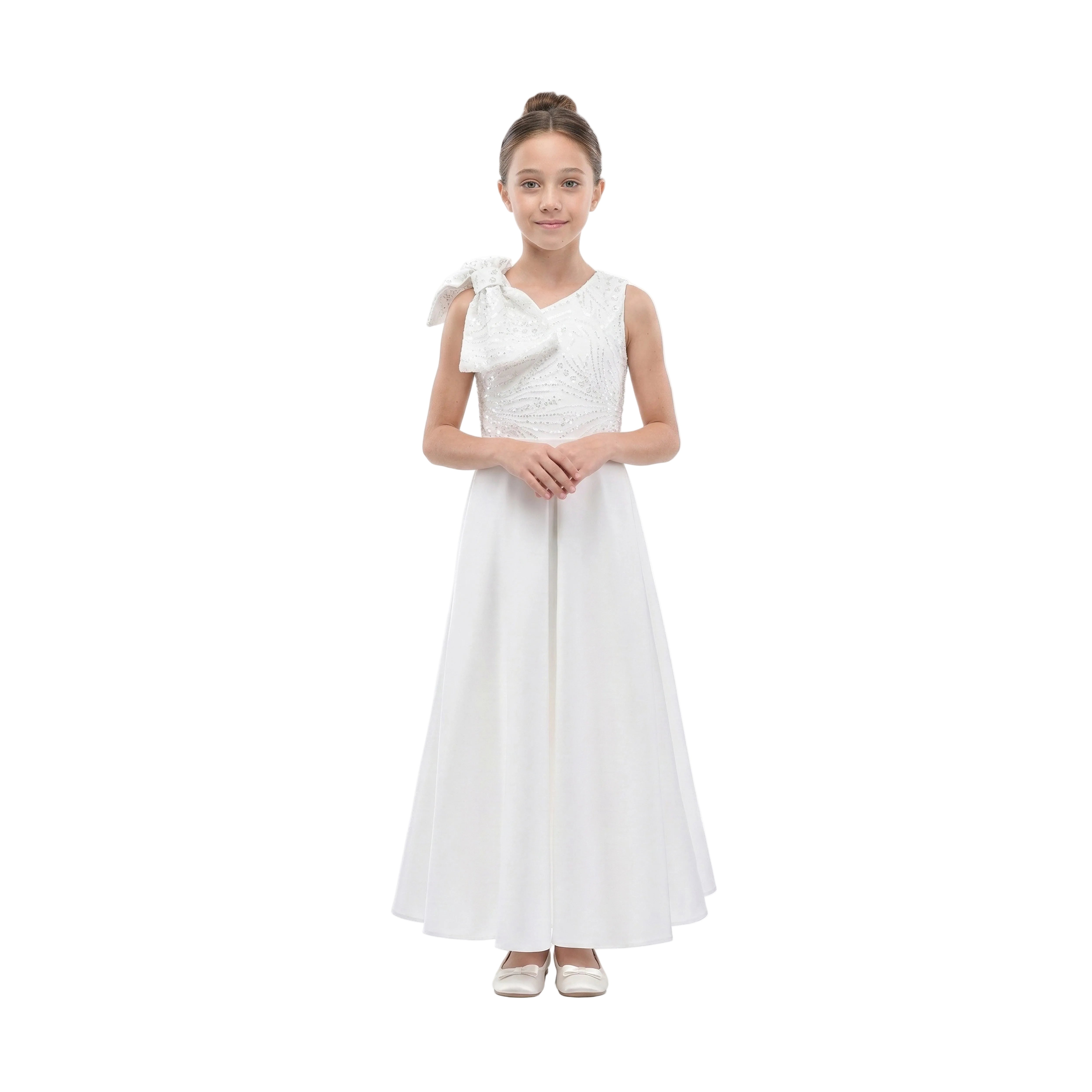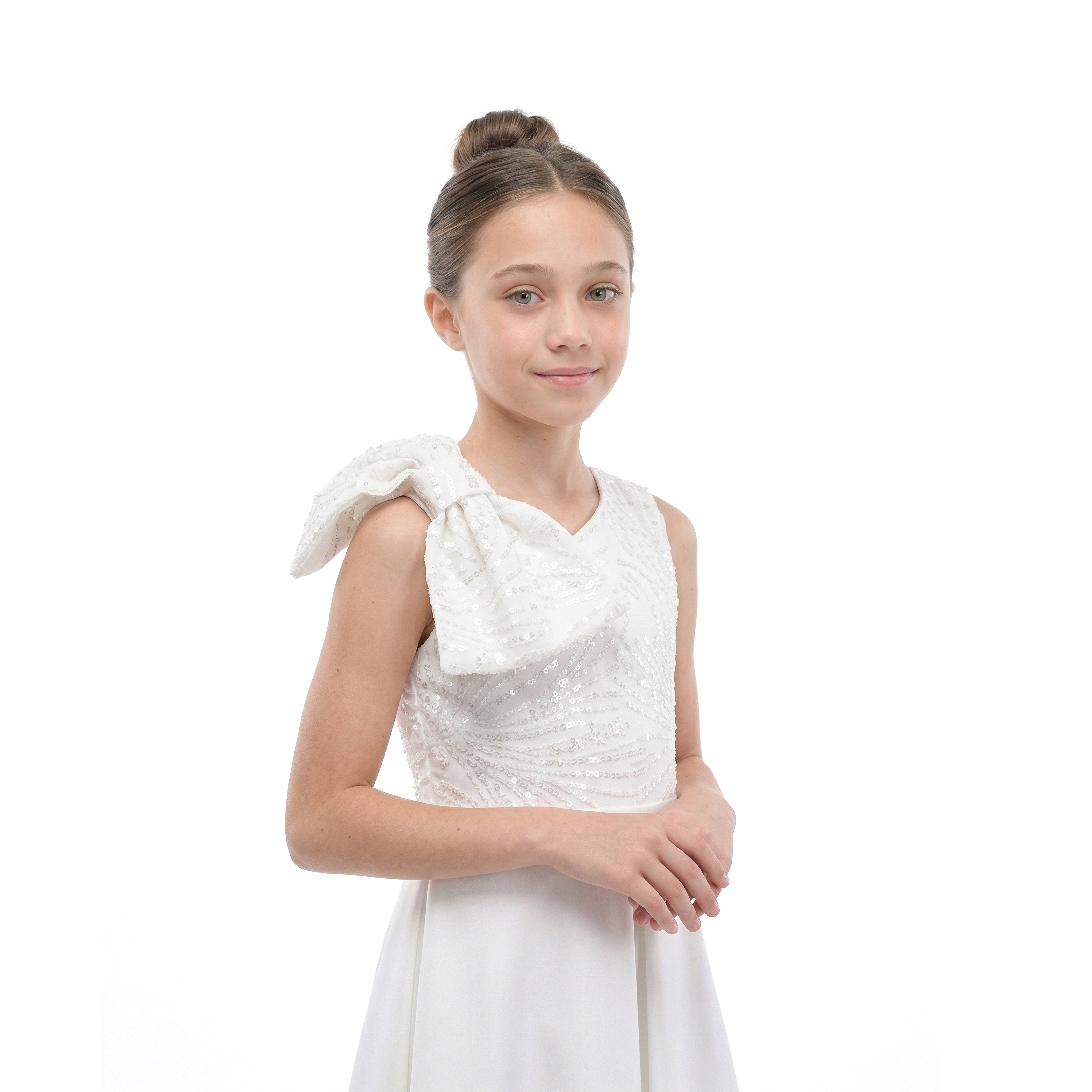 A pristine vision of elegance and simplicity, the White Theia Dress combines timeless design with subtle glamour. The one-shoulder silhouette is adorned with a sparkling bow, while the pleated skirt flows gracefully for a refined, romantic look. Perfect for weddings, formal celebrations, or any moment that calls for elevated style.