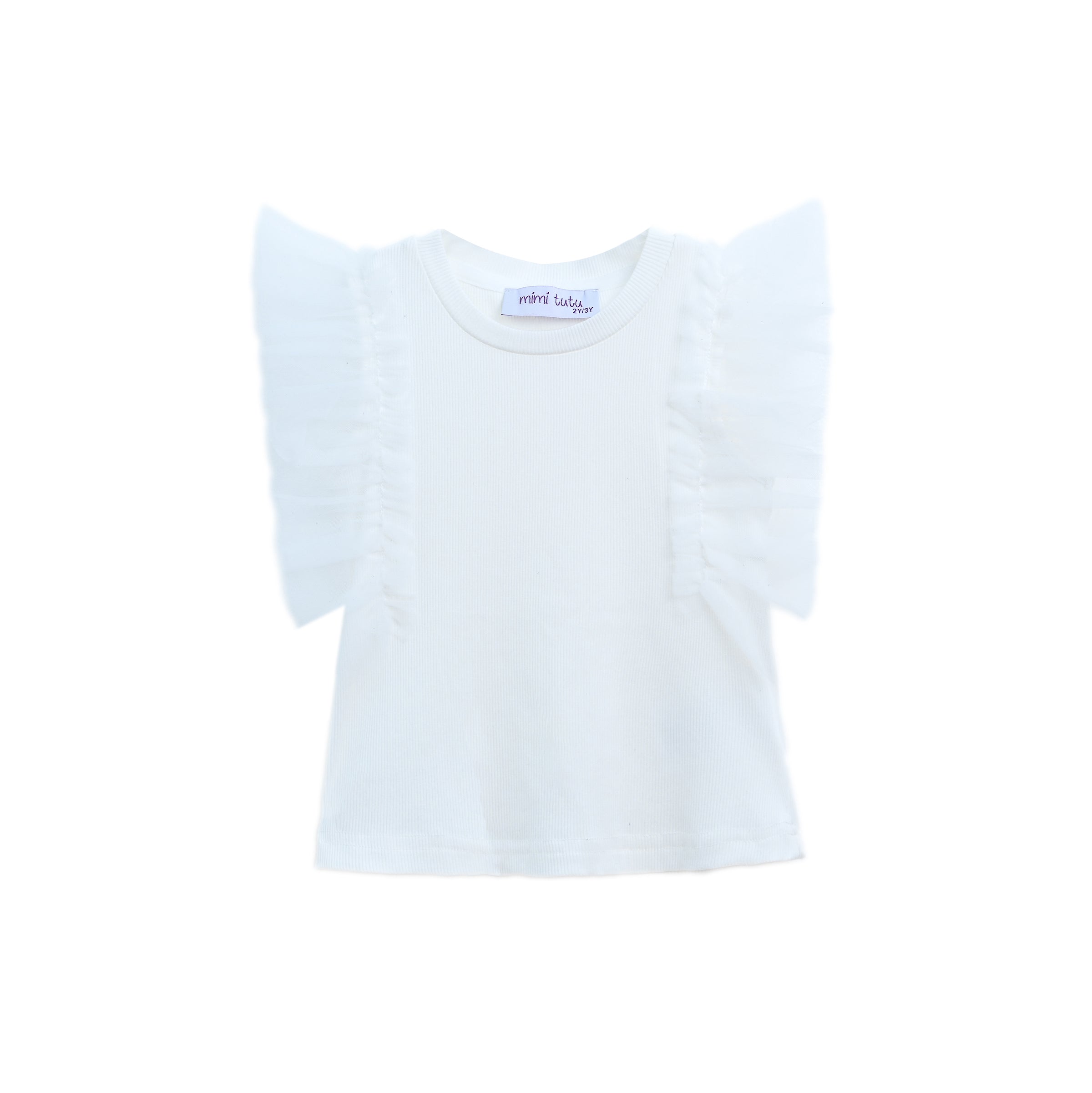 The White Tulle Frill T-Shirt for kid and baby girls from Mimi Tutu is a delightful addition to any wardrobe. This charming top features large tulle frill sleeves, adding a touch of whimsy and elegance to the outfit. The round neck and straight hem ensure a comfortable and classic fit. Perfect for pairing with a tutu or any skirt, this t-shirt is designed for both style and practicality.