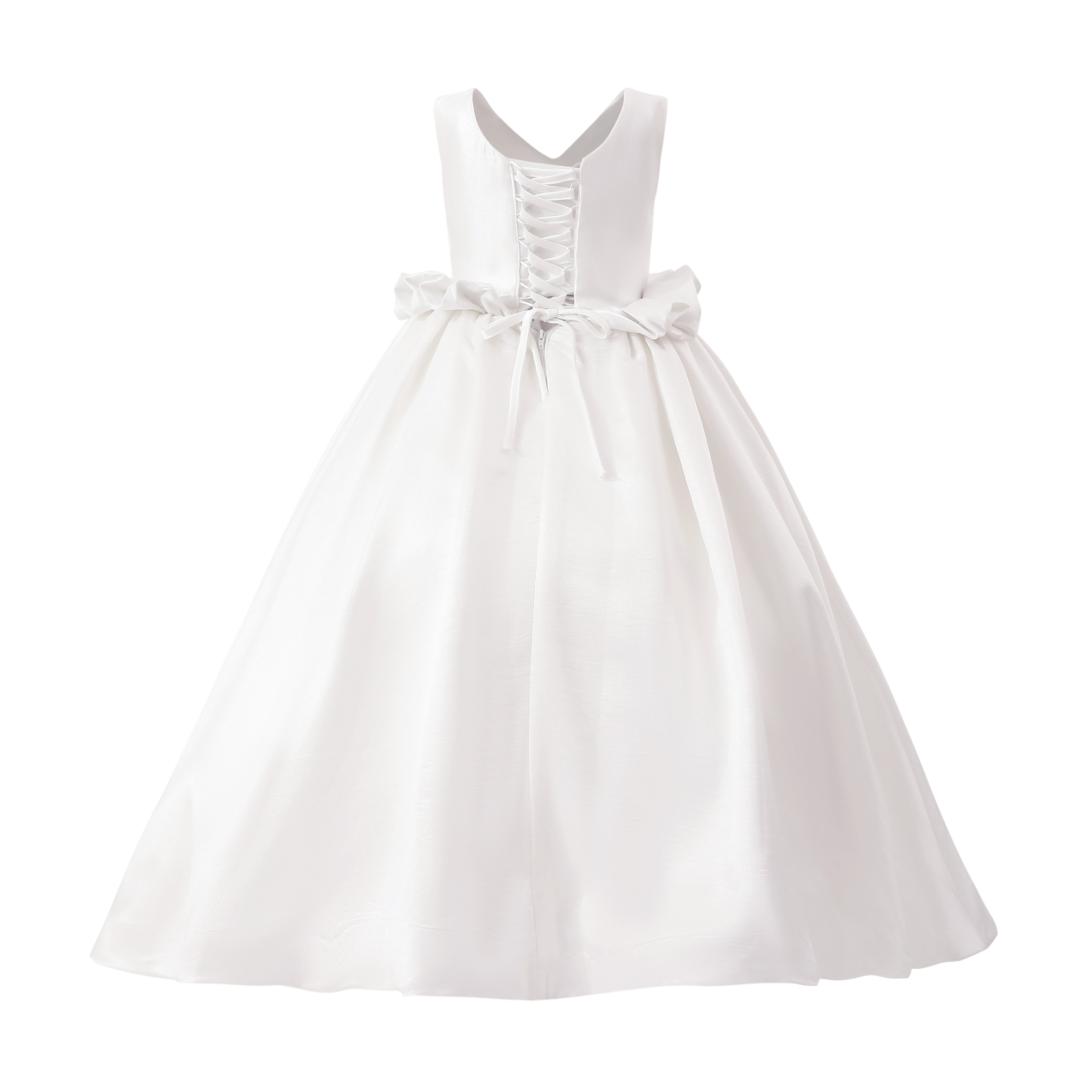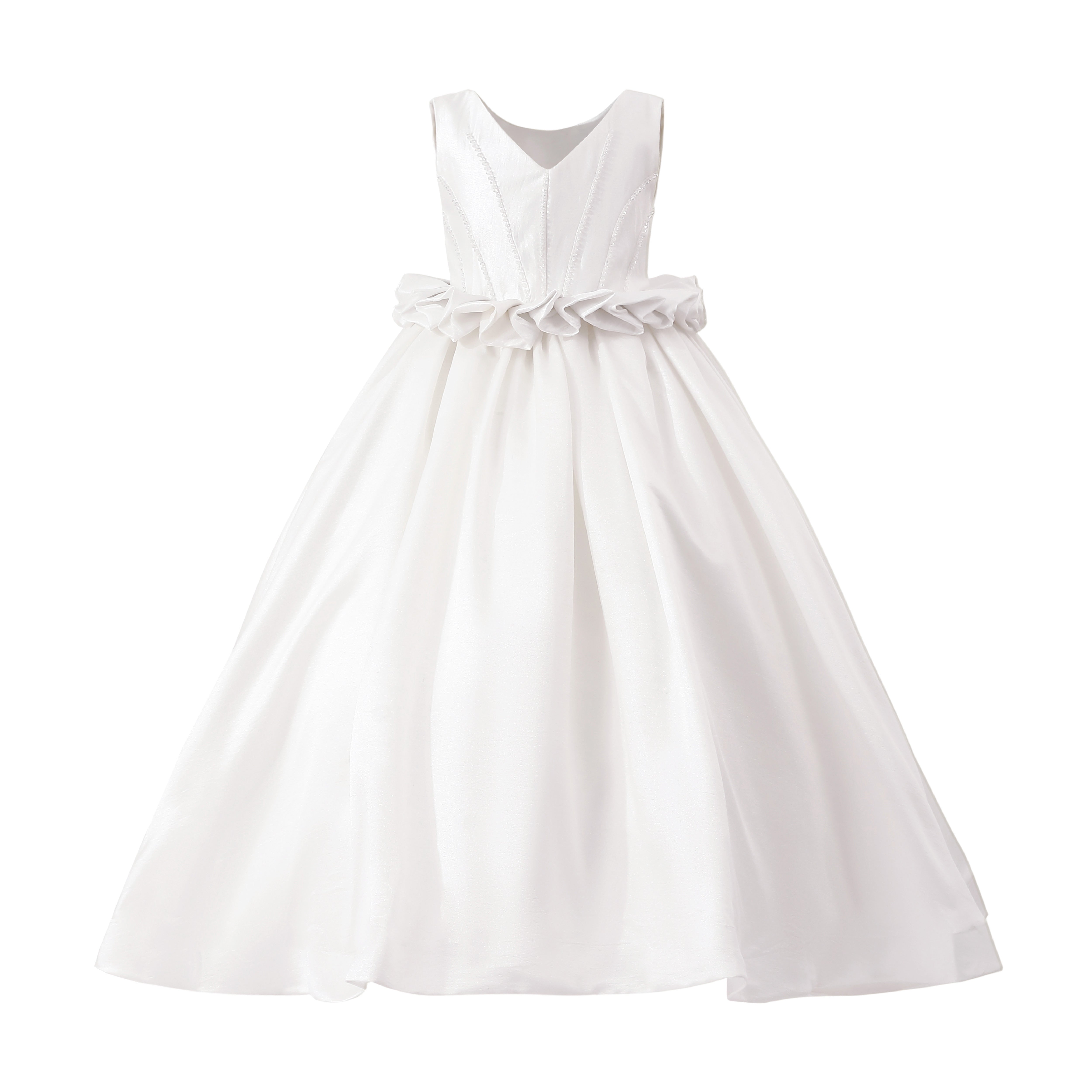 This graceful sleeveless dress is designed for special occasions, combining elegance with youthful charm. The fitted bodice and flowing skirt create a timeless silhouette, while the ruffle waist detail adds a touch of sophistication.