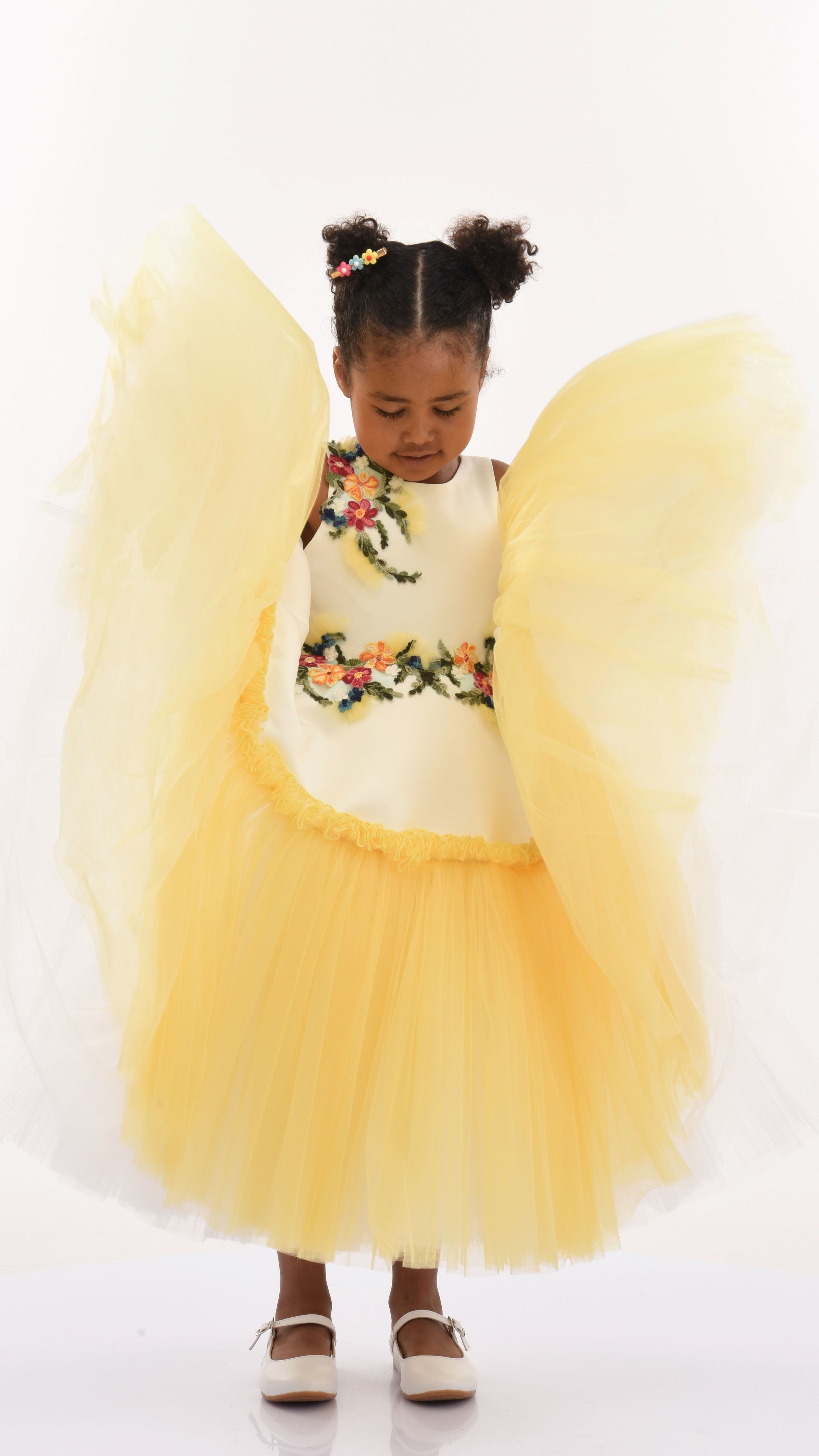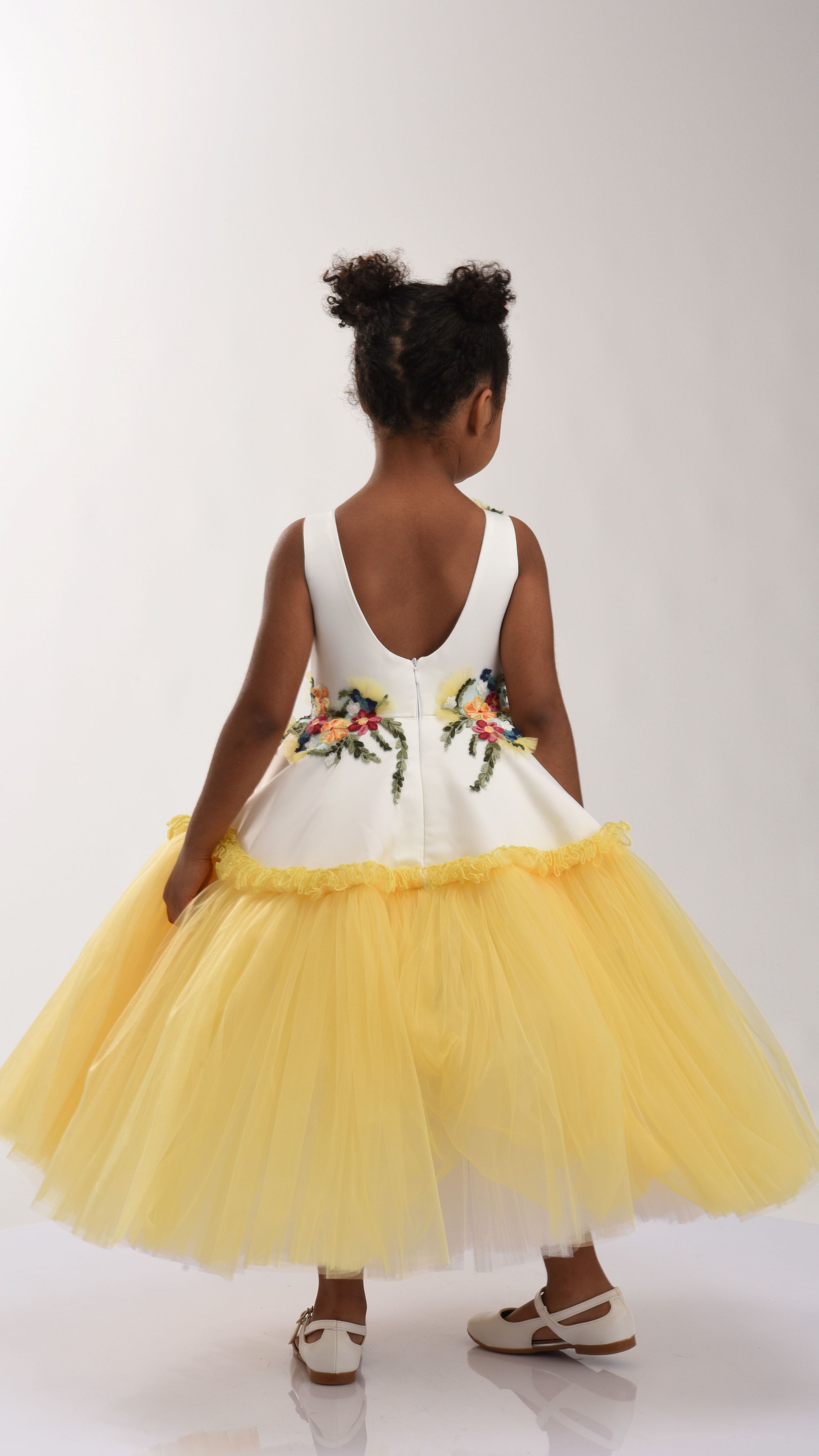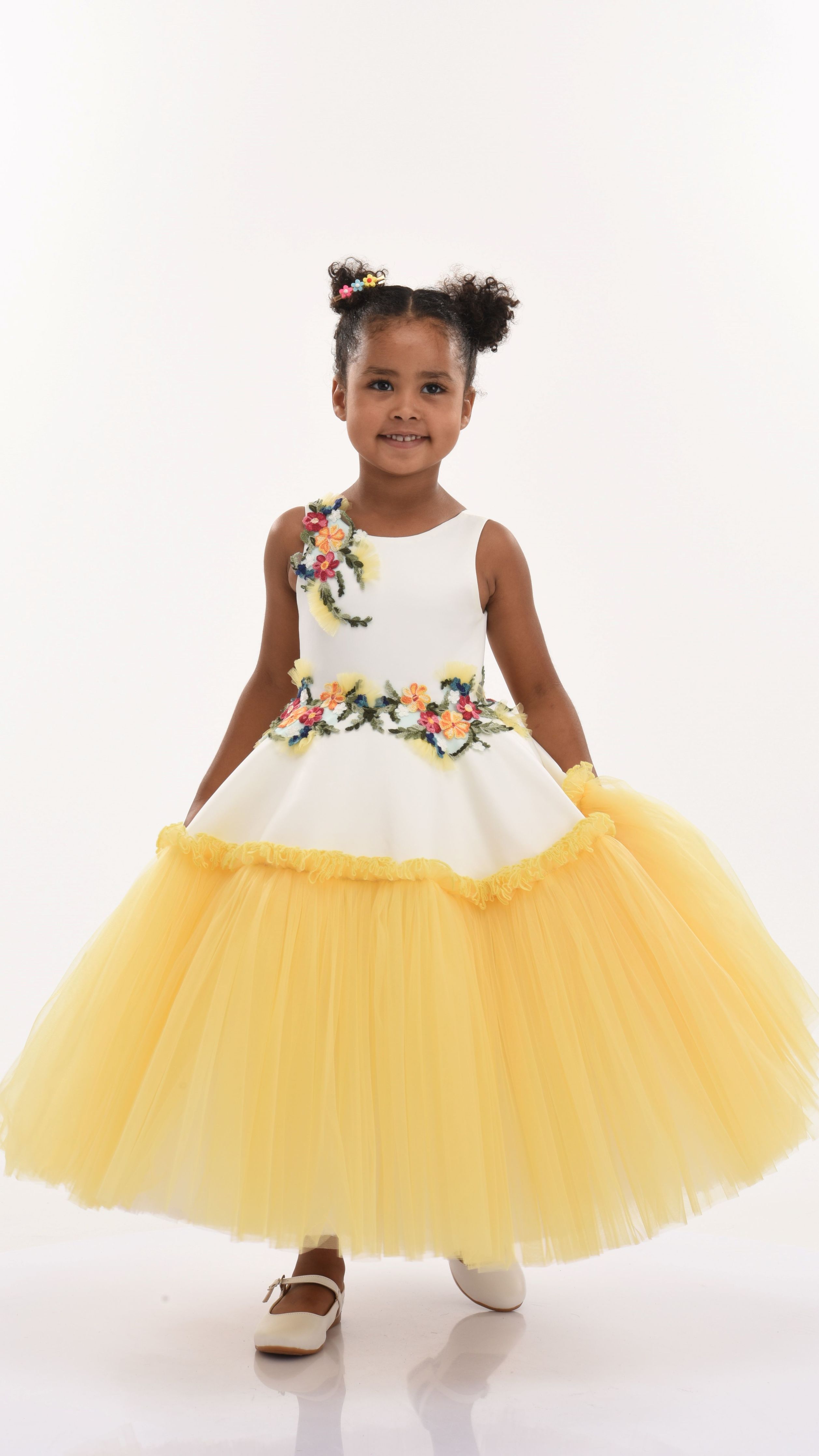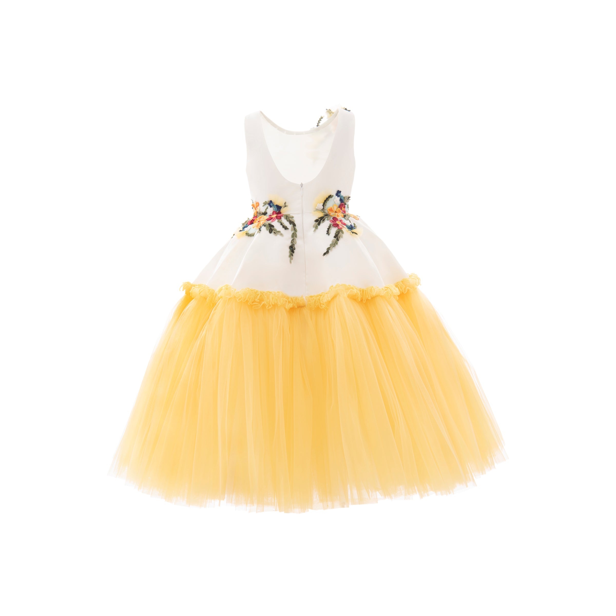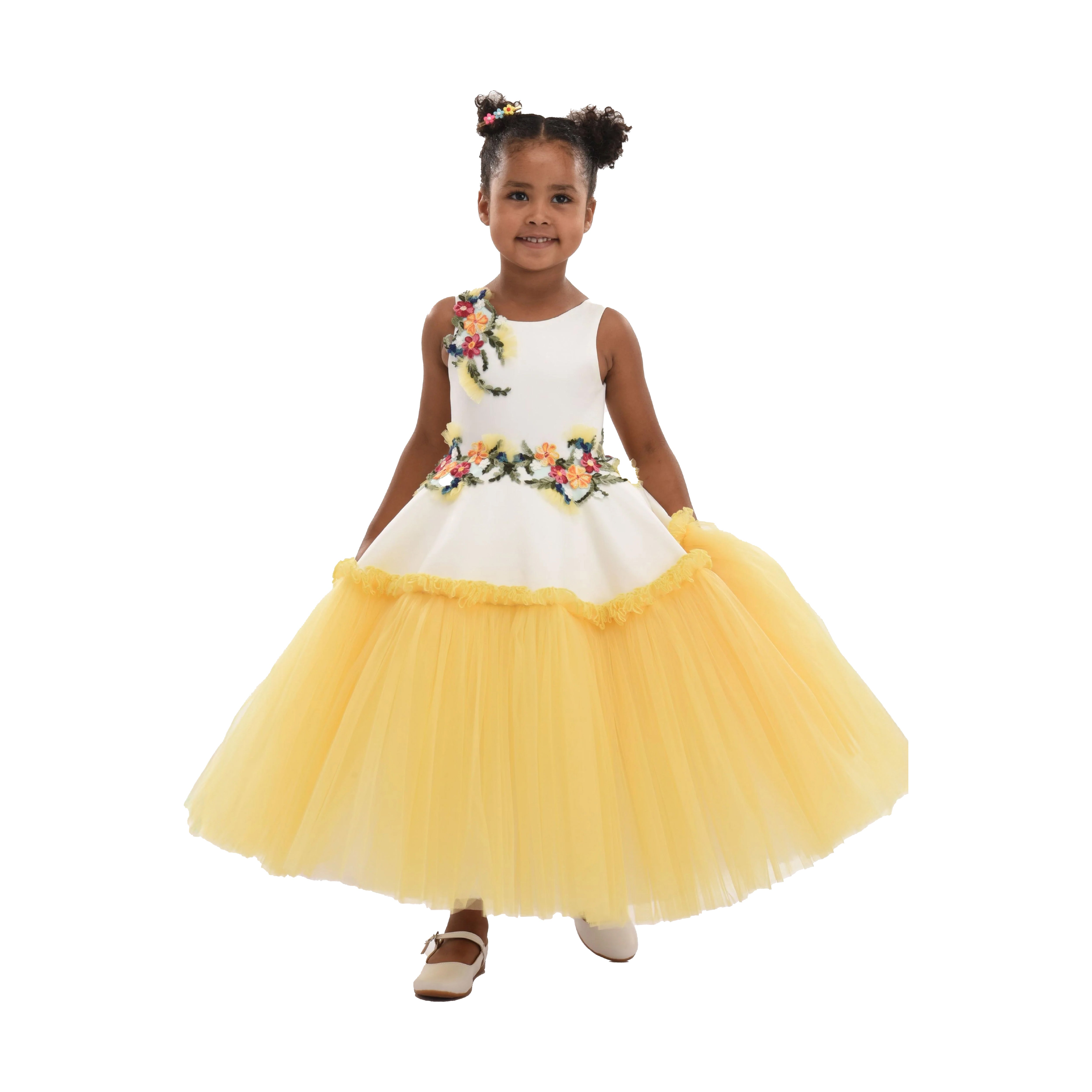 The Yellow Aquino Floral Garden Dress for kid girls from Tulleen is a delightful piece designed for special occasions. This dress features a sleeveless white bodice adorned with floral embroidery in vibrant green, pink, and red, adding a touch of elegance and charm. The floral belt enhances the waistline, seamlessly leading to a white overlay on top of a yellow tulle gown, creating a beautiful and enchanting silhouette.
