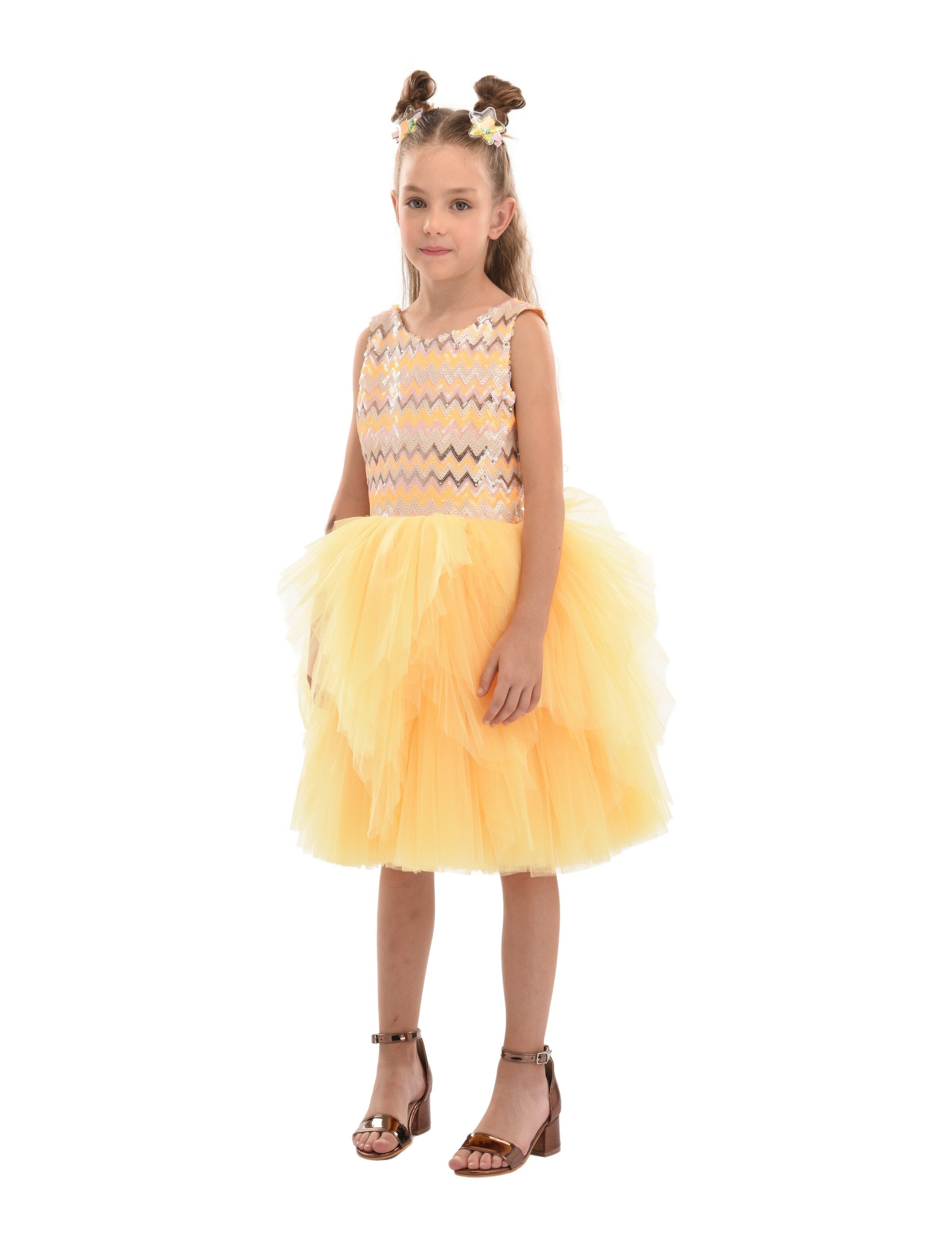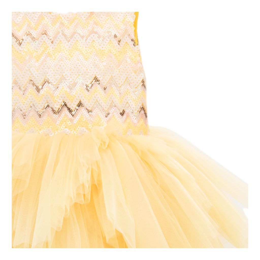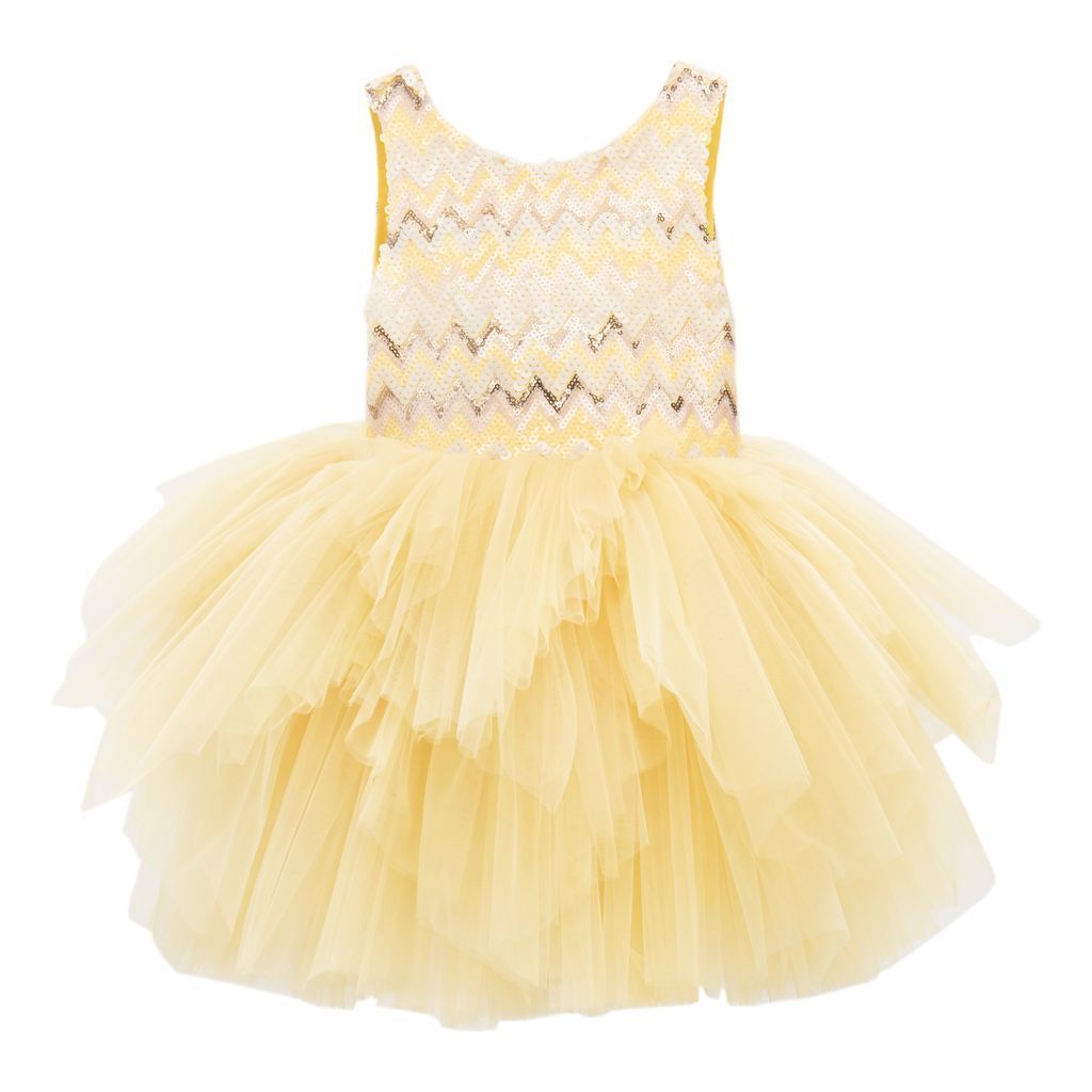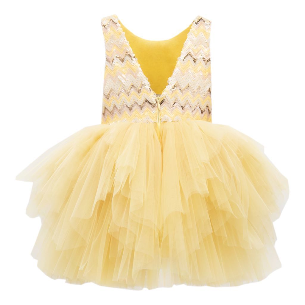 The vibrant and playful Yellow Cam Del Sol Dress for young girls from Tulleen is designed to make your little princess shine. This dress is perfect for birthdays, Easter celebrations, and Eid parties. The dazzling sequined chevron bodice features alternating rows of yellow, pink, gold, and rose gold. These vibrant colors and sparkling sequins create a captivating visual effect that will surely catch everyone's attention.