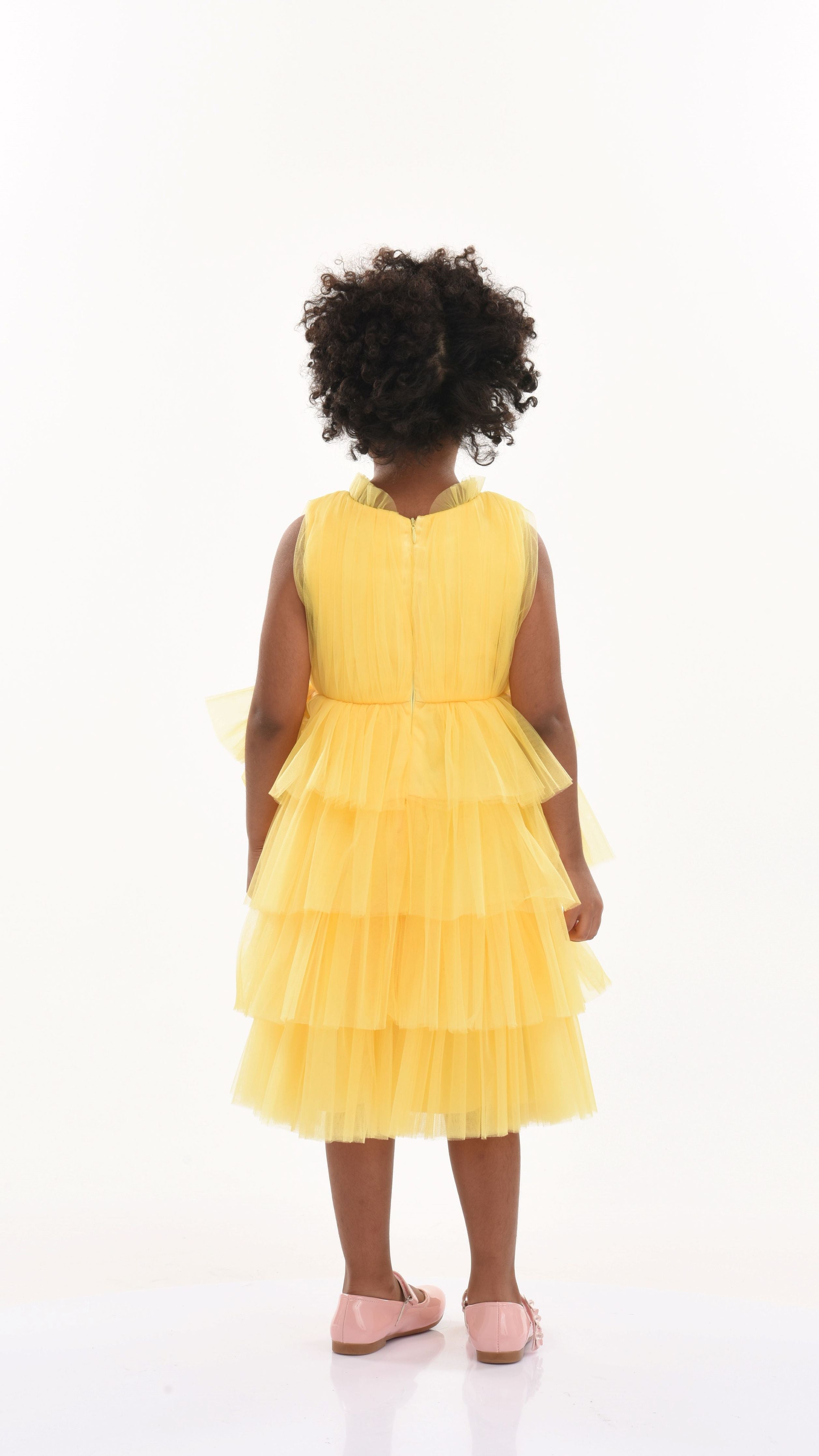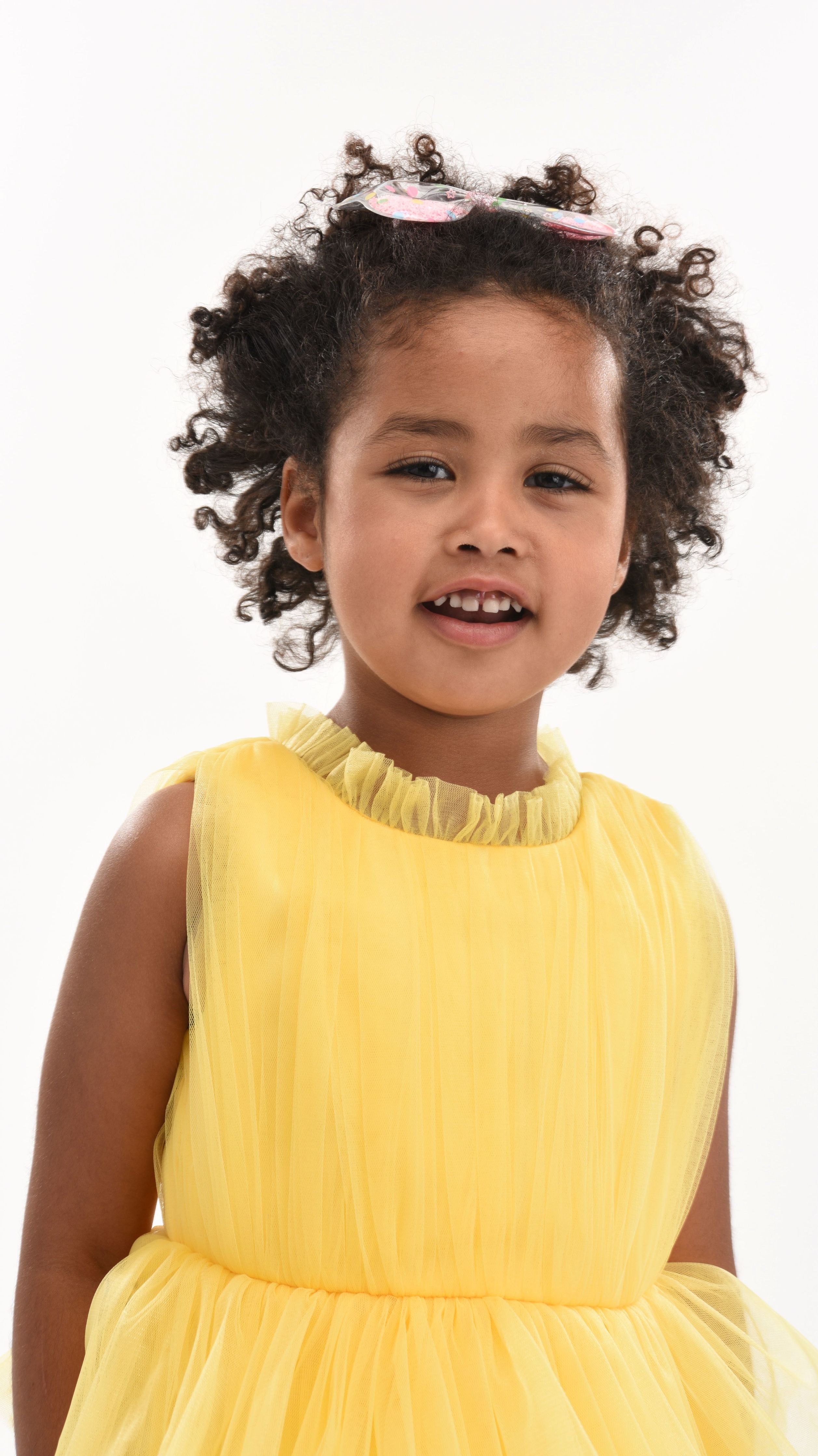 The Yellow Farvue Sleeveless Tiered Tulle Dress for kid girls from Tulleen combines lightness and elegance, making it perfect for any special occasion. This dress features a lightweight tulle sleeveless bodice that ensures comfort and freedom of movement.