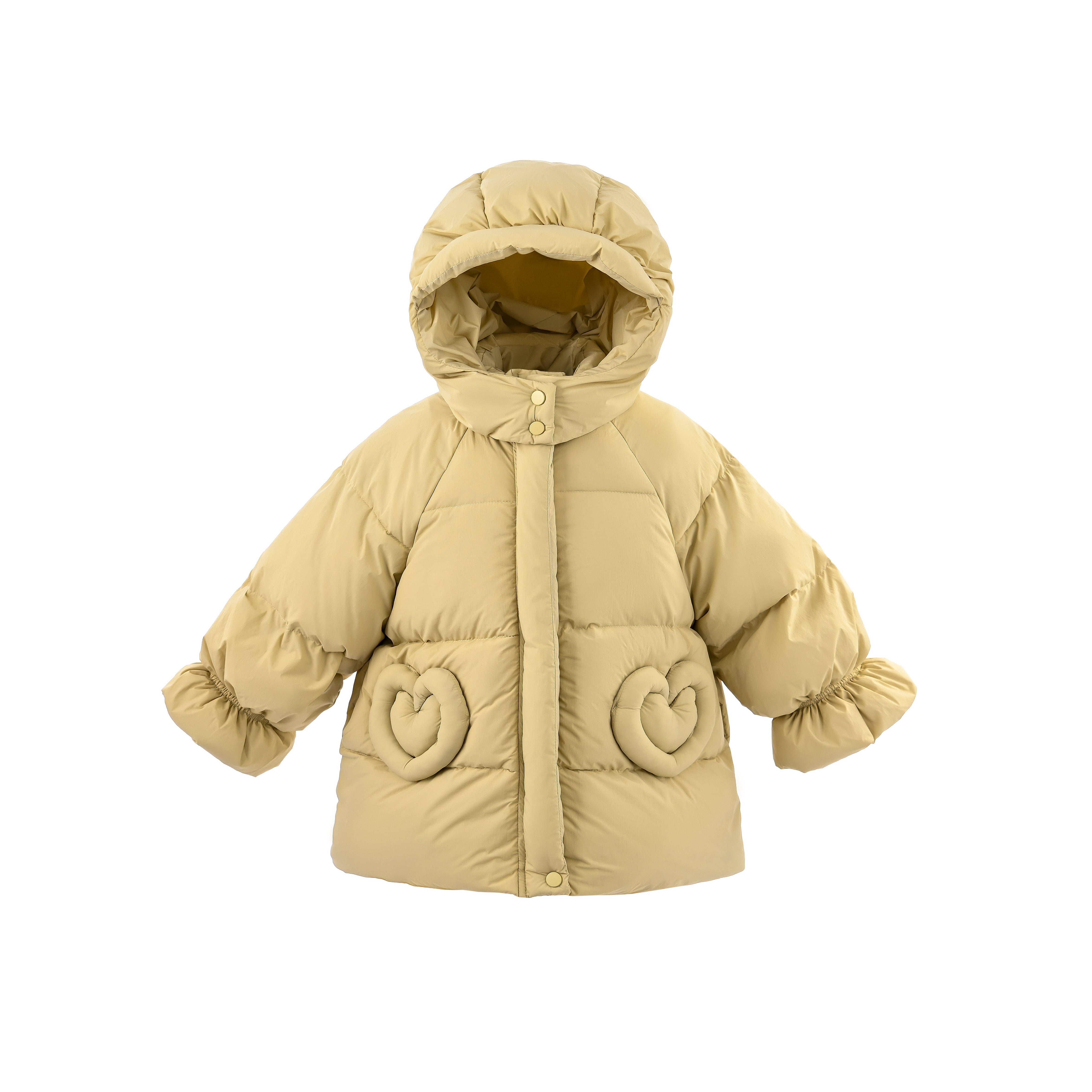 Keep your little one cozy and stylish with this charming yellow puffer jacket, designed for warmth and whimsy. Featuring heart-shaped pockets and a snug hood, it's a winter essential with a playful twist.